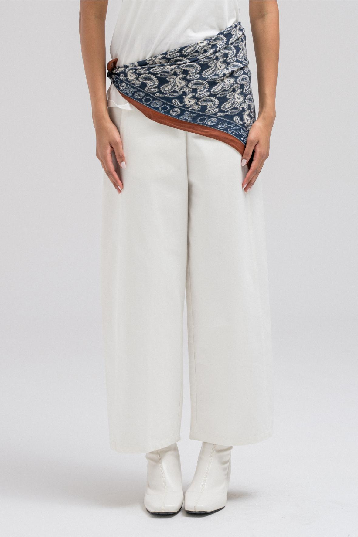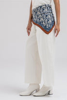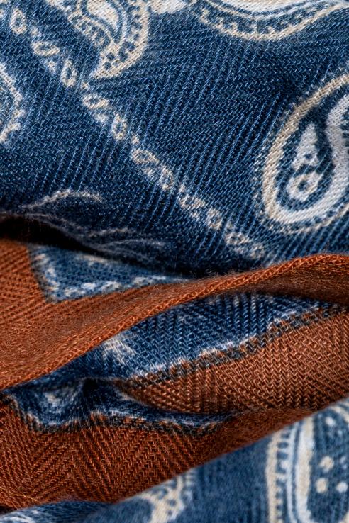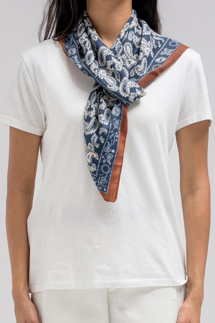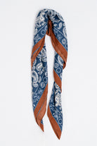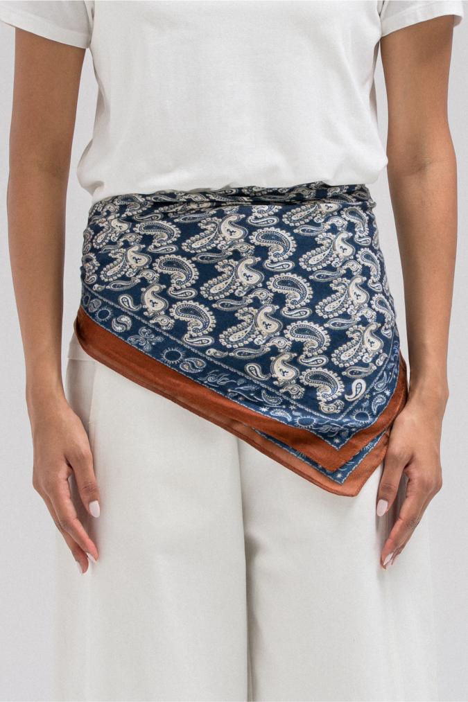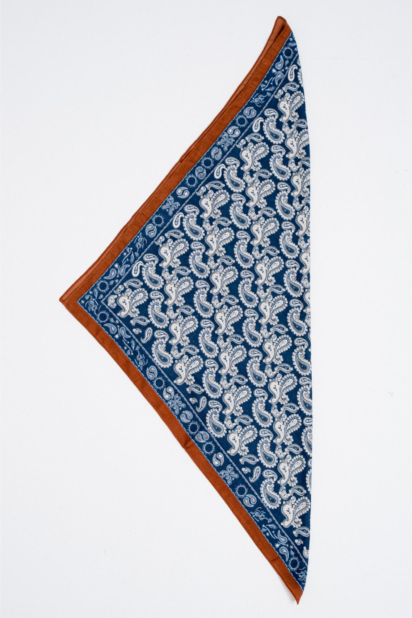 A timeless navy scarf adorned with classic white paisley motifs and a bold rust border. The design adds a vintage yet elevated flair, perfect for layering over minimalist outfits. Can be styled as a necktie or belt for a polished, fashion-forward look.