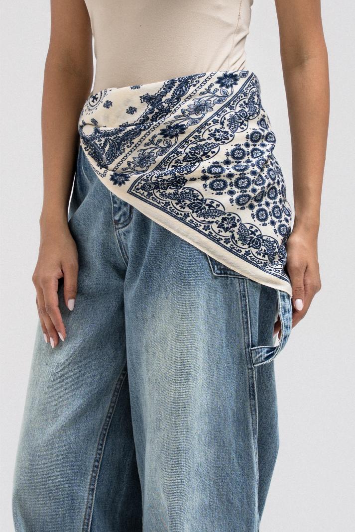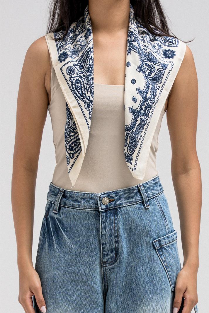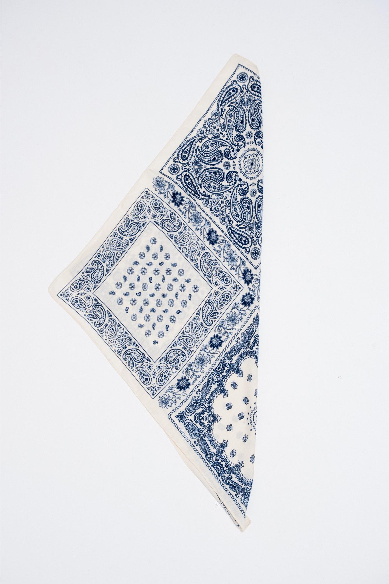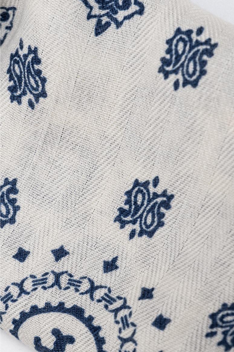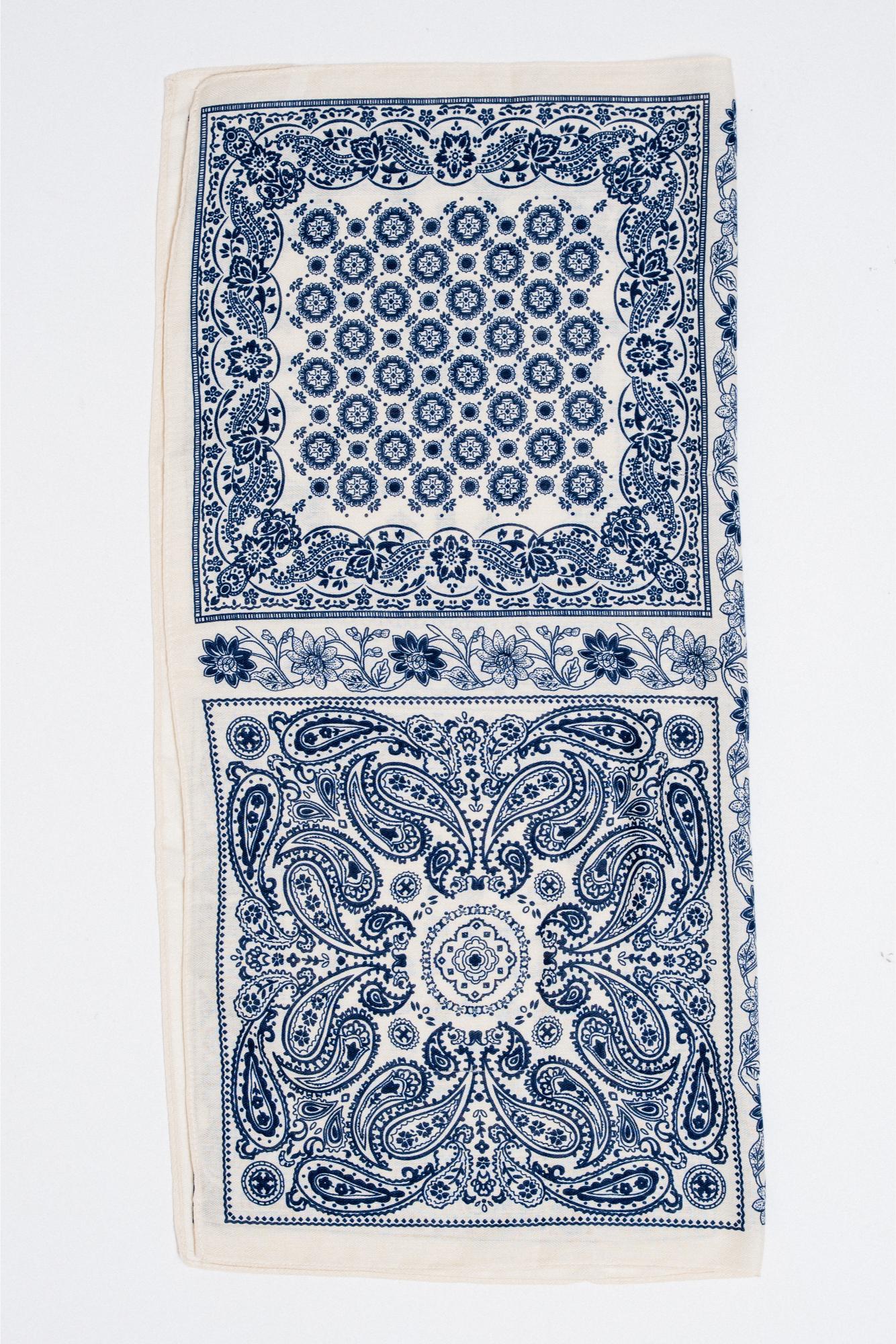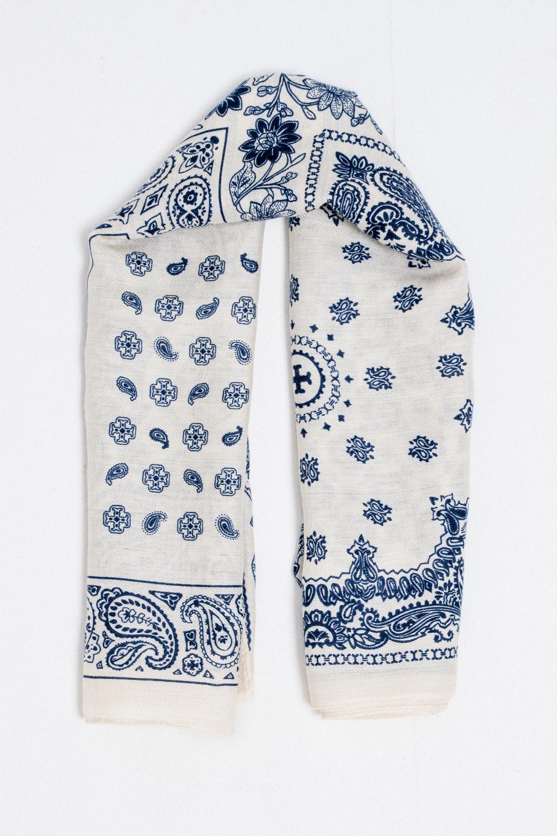 Featuring a delicate bandana-style print in navy over a cream base, this scarf brings a balanced mix of classic and modern. Lightweight and versatile.