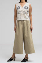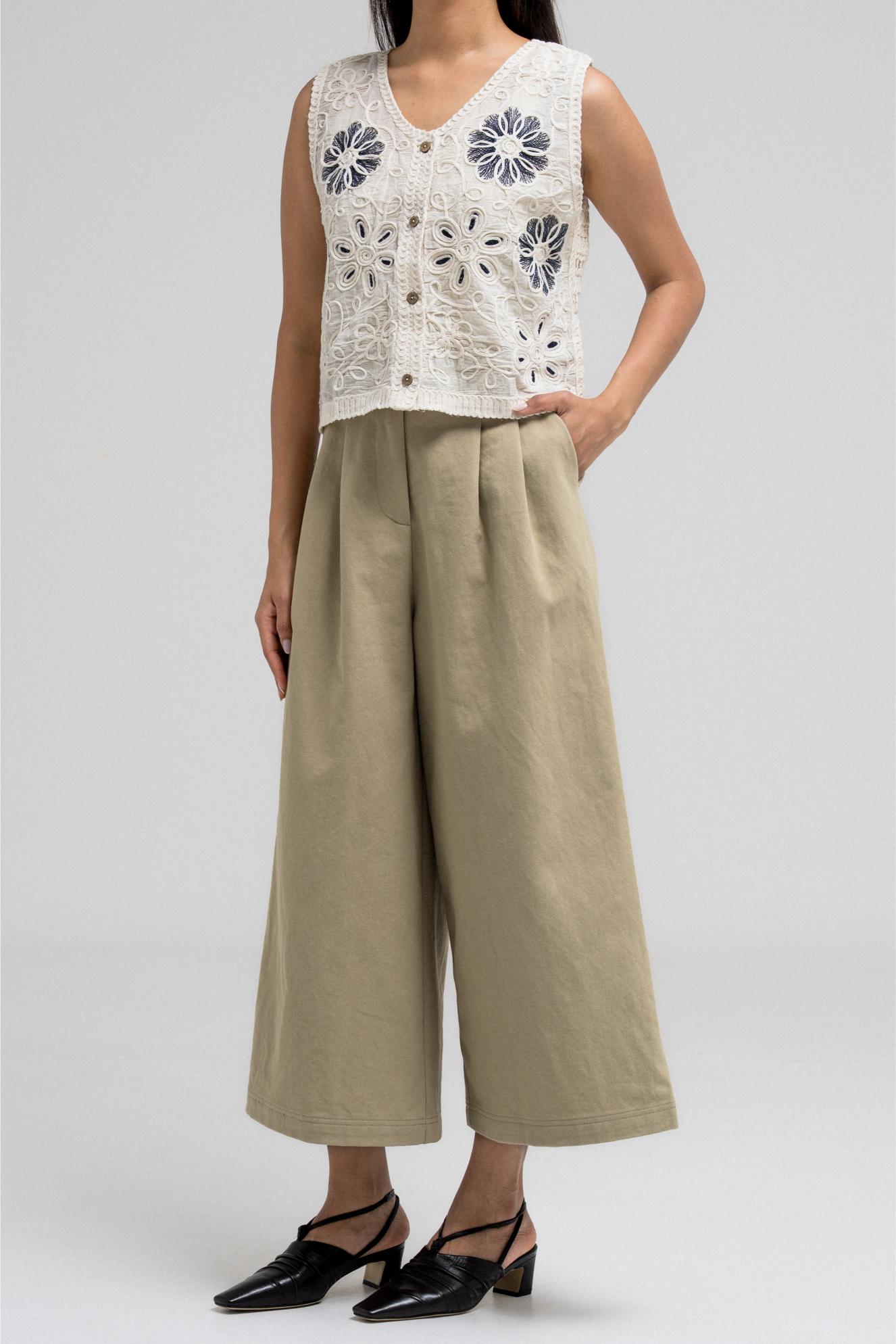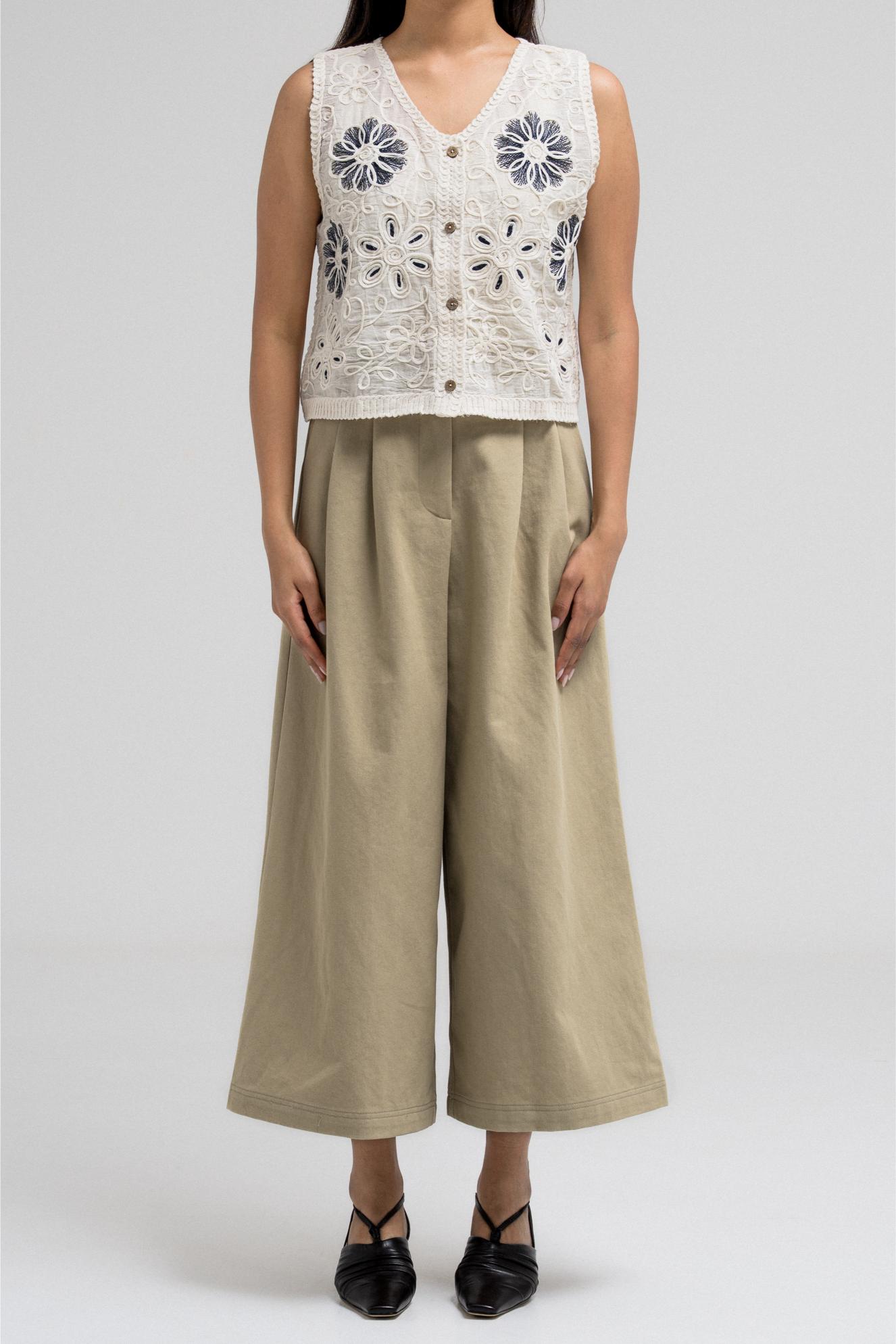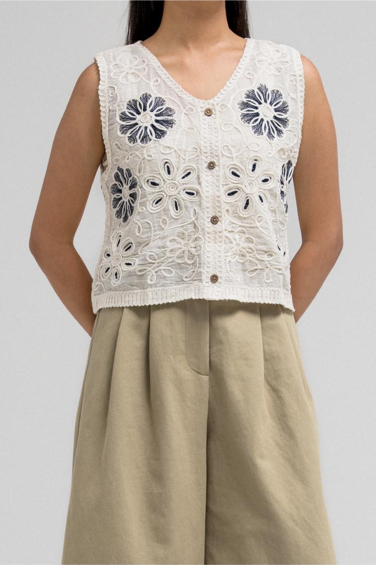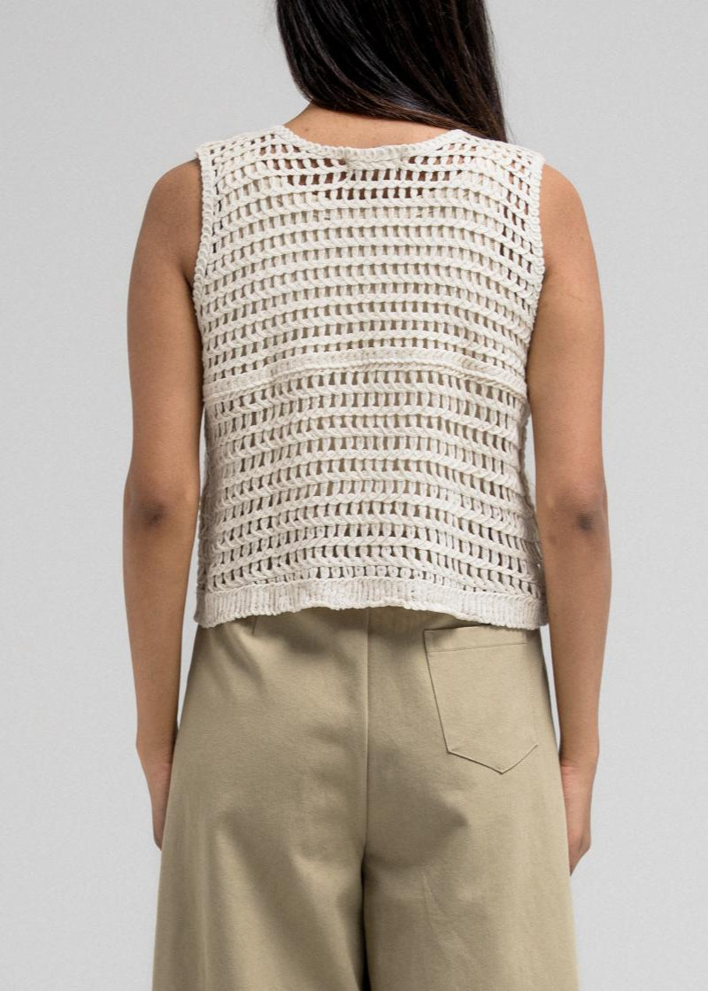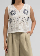 This vest features a unique mix of crochet and lightweight fabric at the front, creating a playful pattern of circular and flower-like designs. The back is fully crochet, giving it an airy, handcrafted look. Finished with front button closures, it adds a soft, boho charm to any outfit.