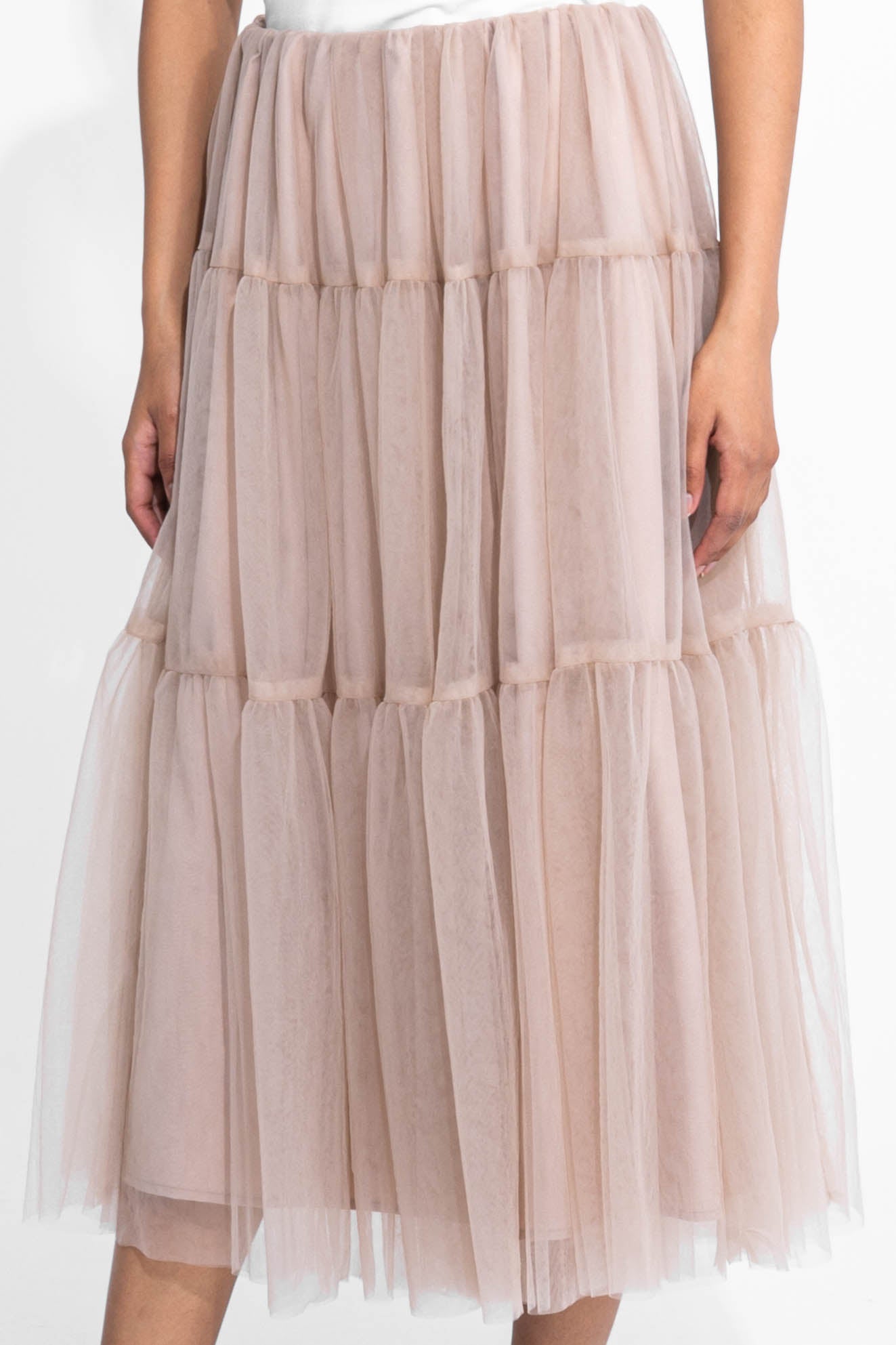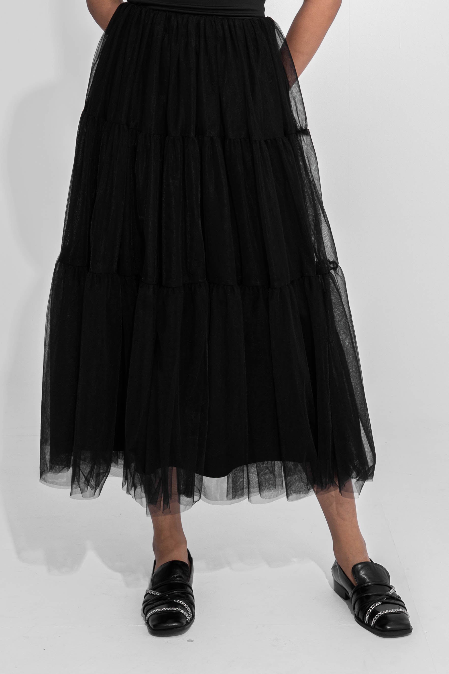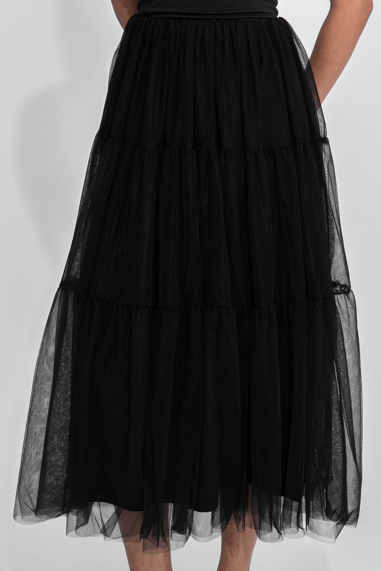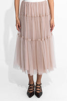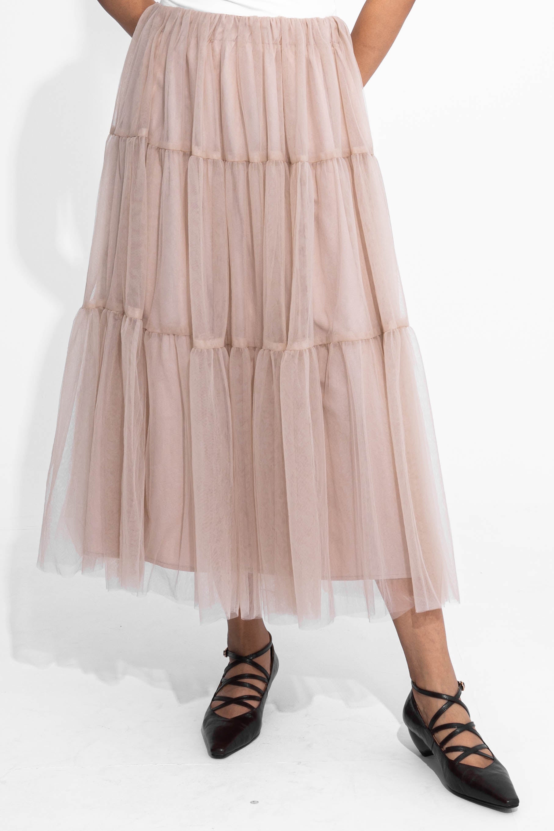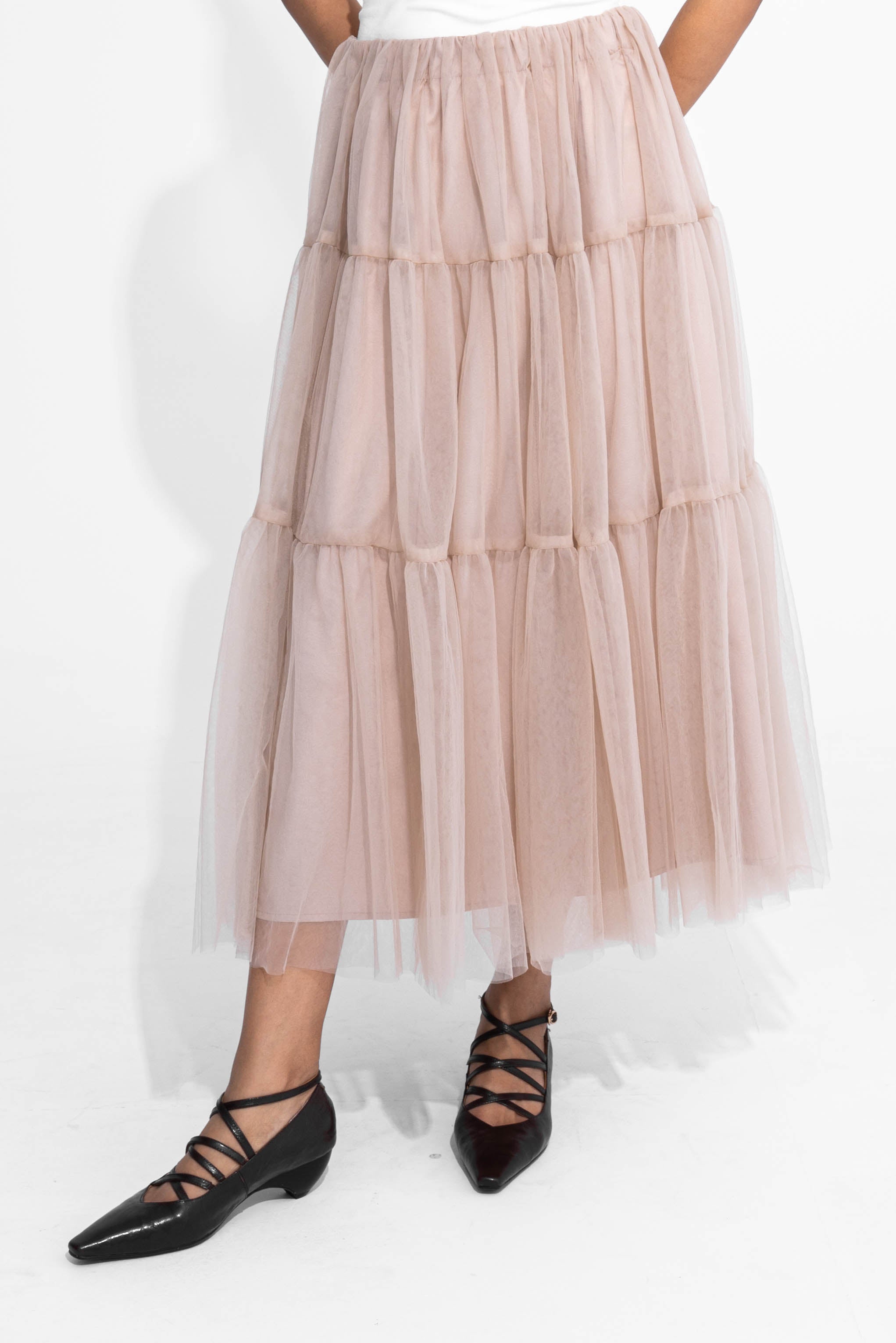 Elastic waitsband. Netted flowly material with lining. Midi length