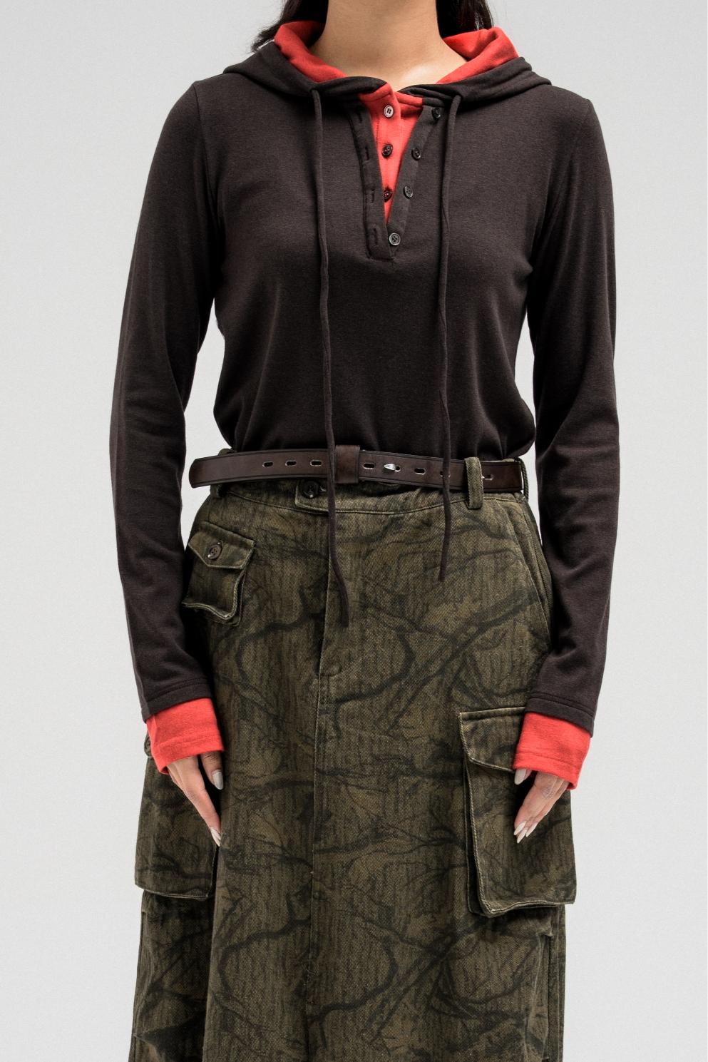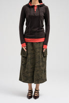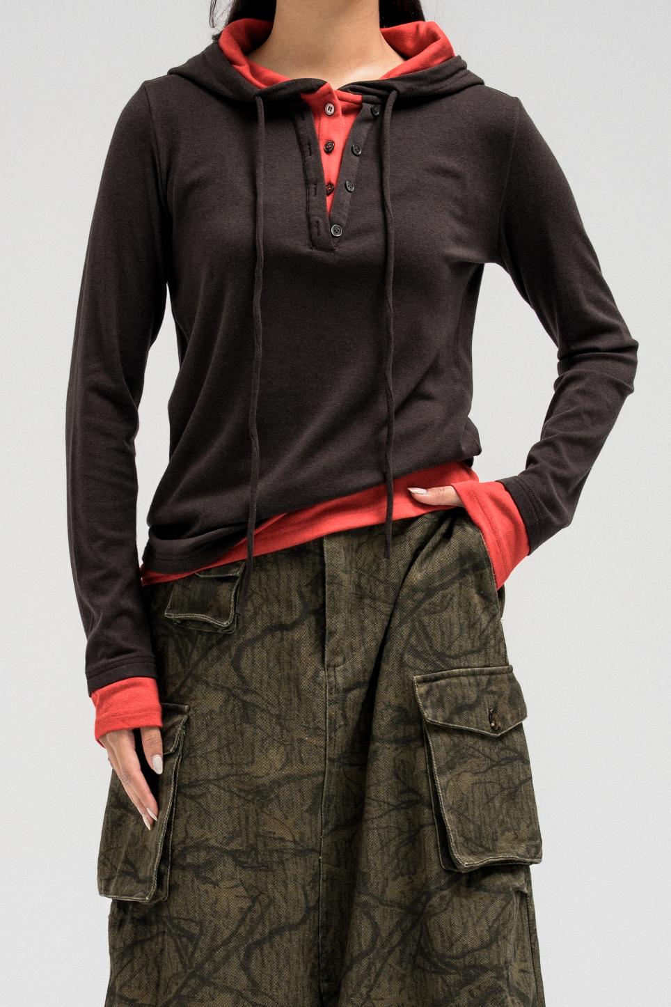Casual top featuring a relaxed fit with a hood at the back and layered collar detail for a unique twist. Designed with contrast trim at the hem, cuffs, and hood, adding a pop of color to the look. A versatile everyday piece that blends sporty and modern style.