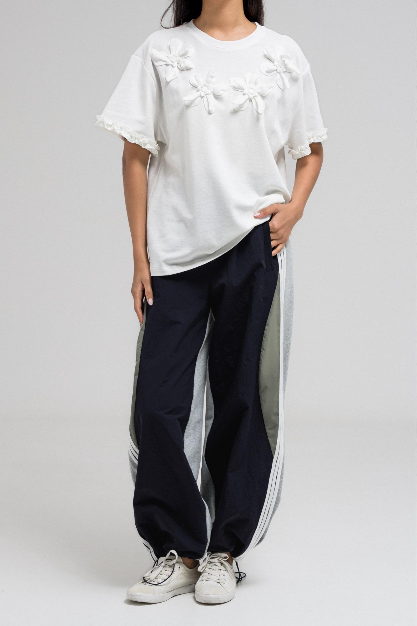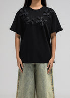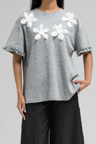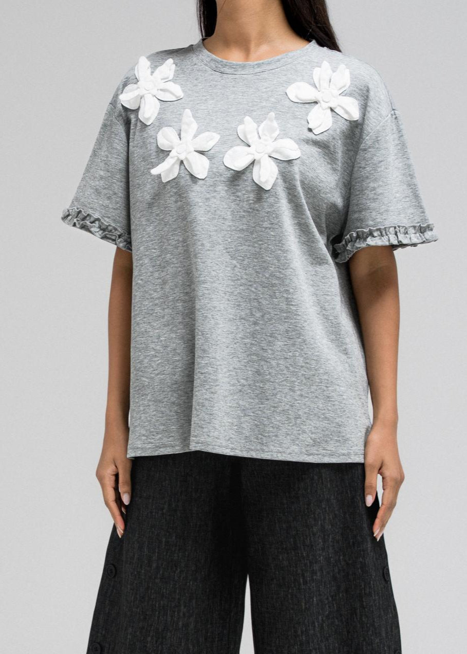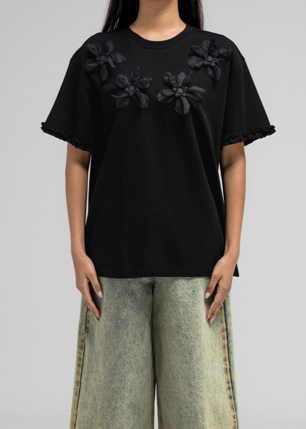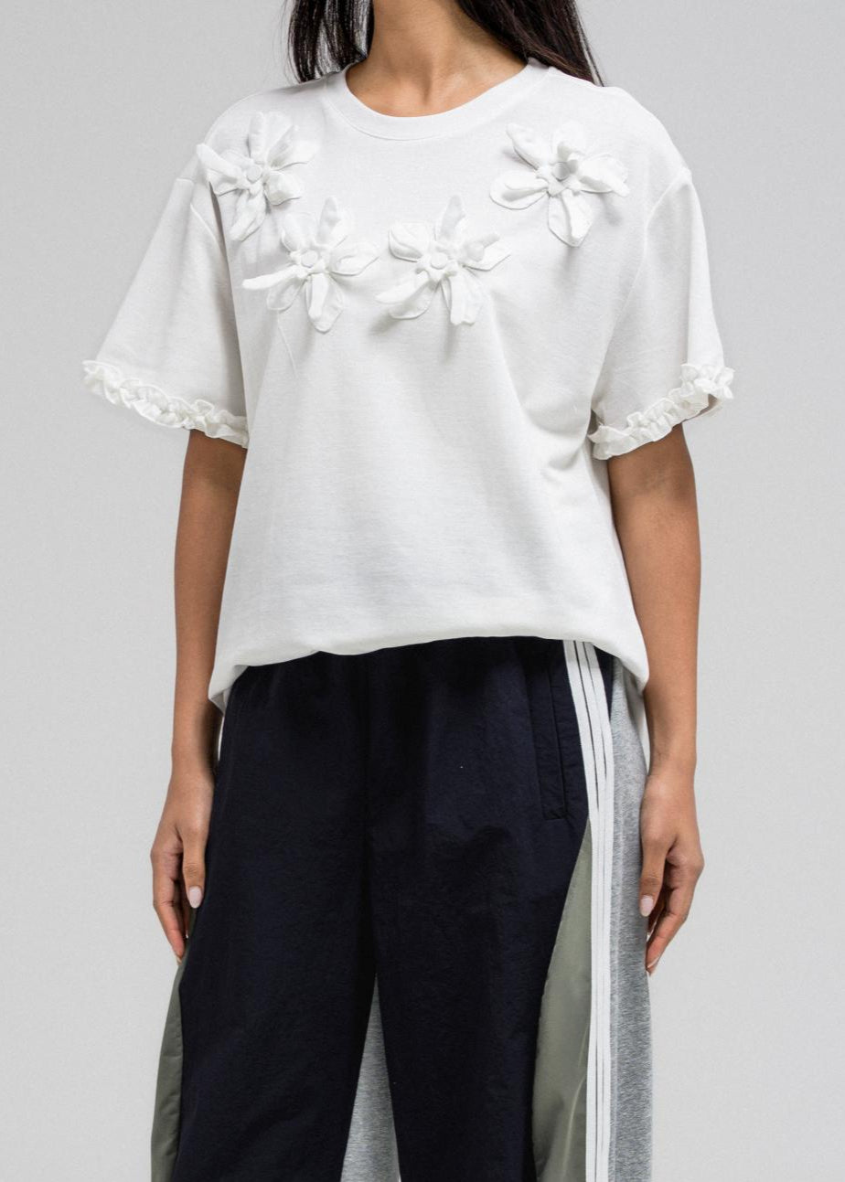 Short-sleeved top featuring bold 3D flower appliqués across the chest. The sleeve hems are finished with delicate ruffle detailing, adding a soft feminine touch to the structured floral accents.