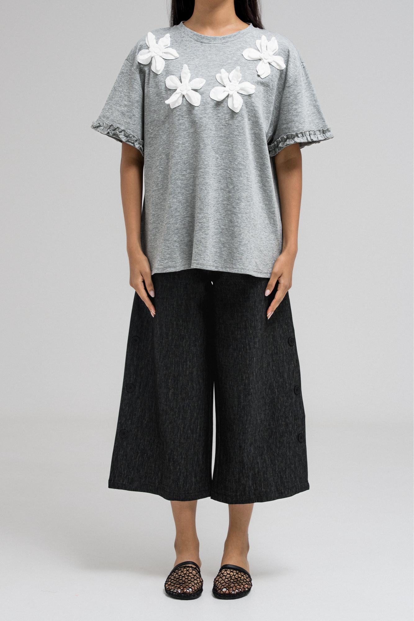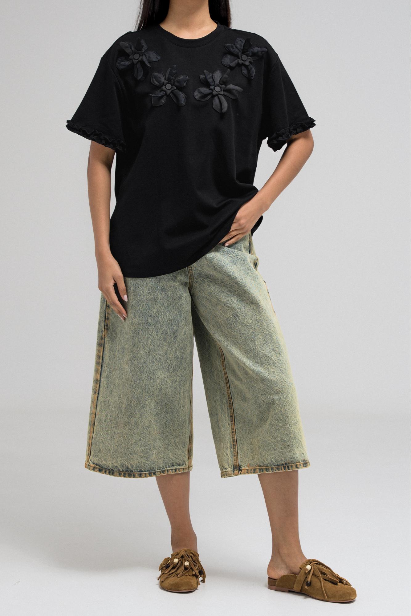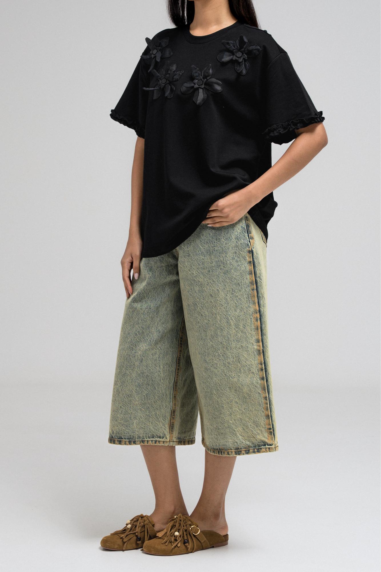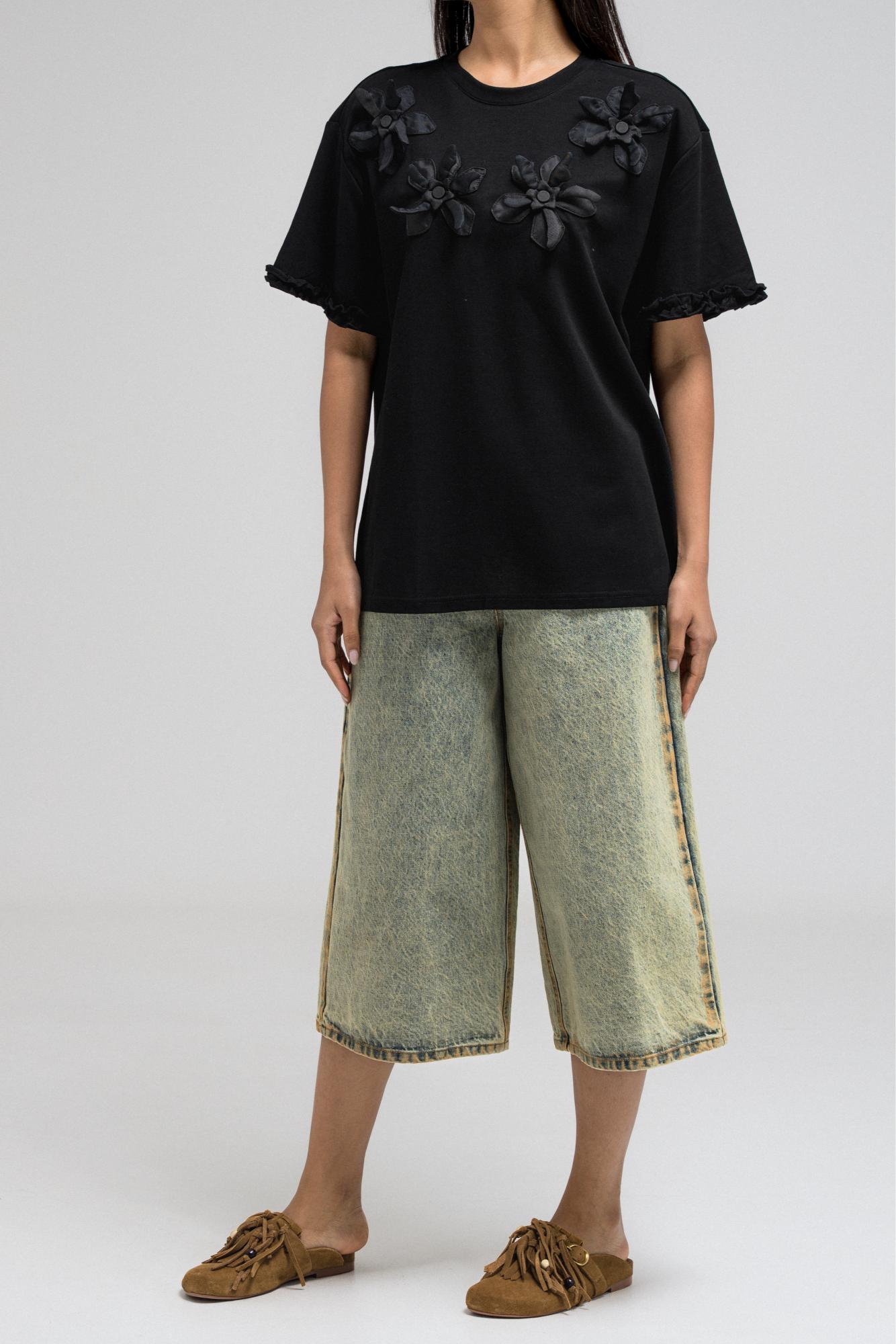 Short-sleeved top featuring bold 3D flower appliqués across the chest. The sleeve hems are finished with delicate ruffle detailing, adding a soft feminine touch to the structured floral accents.