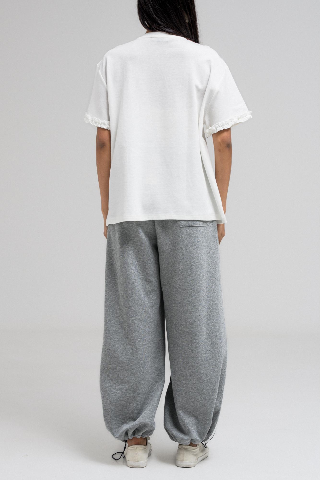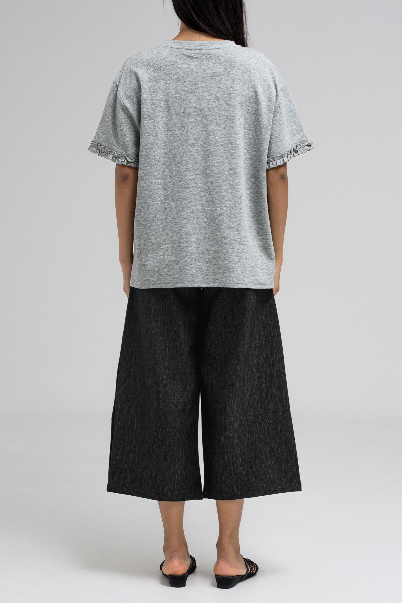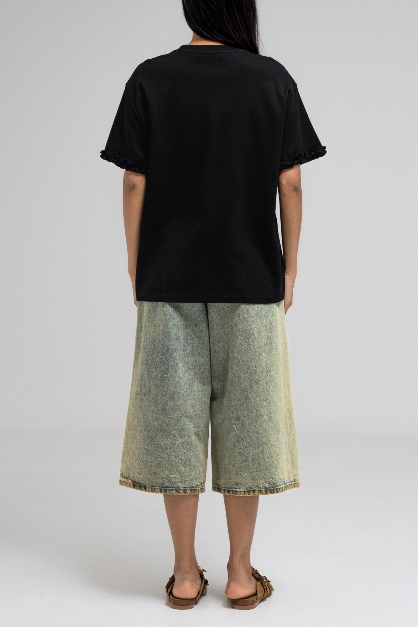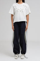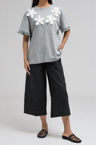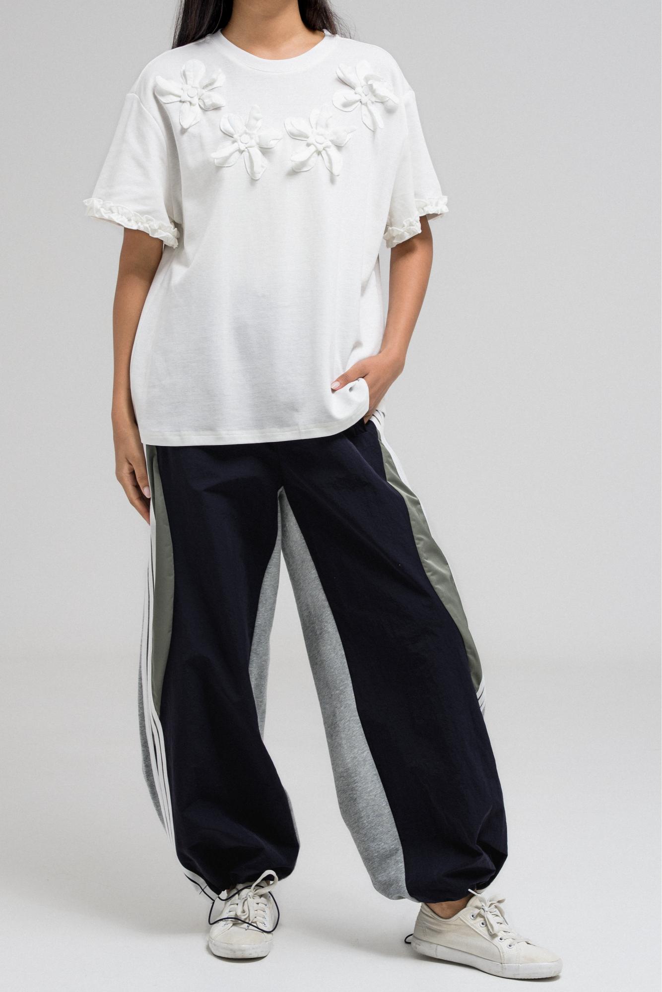 Short-sleeved top featuring bold 3D flower appliqués across the chest. The sleeve hems are finished with delicate ruffle detailing, adding a soft feminine touch to the structured floral accents.