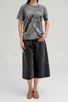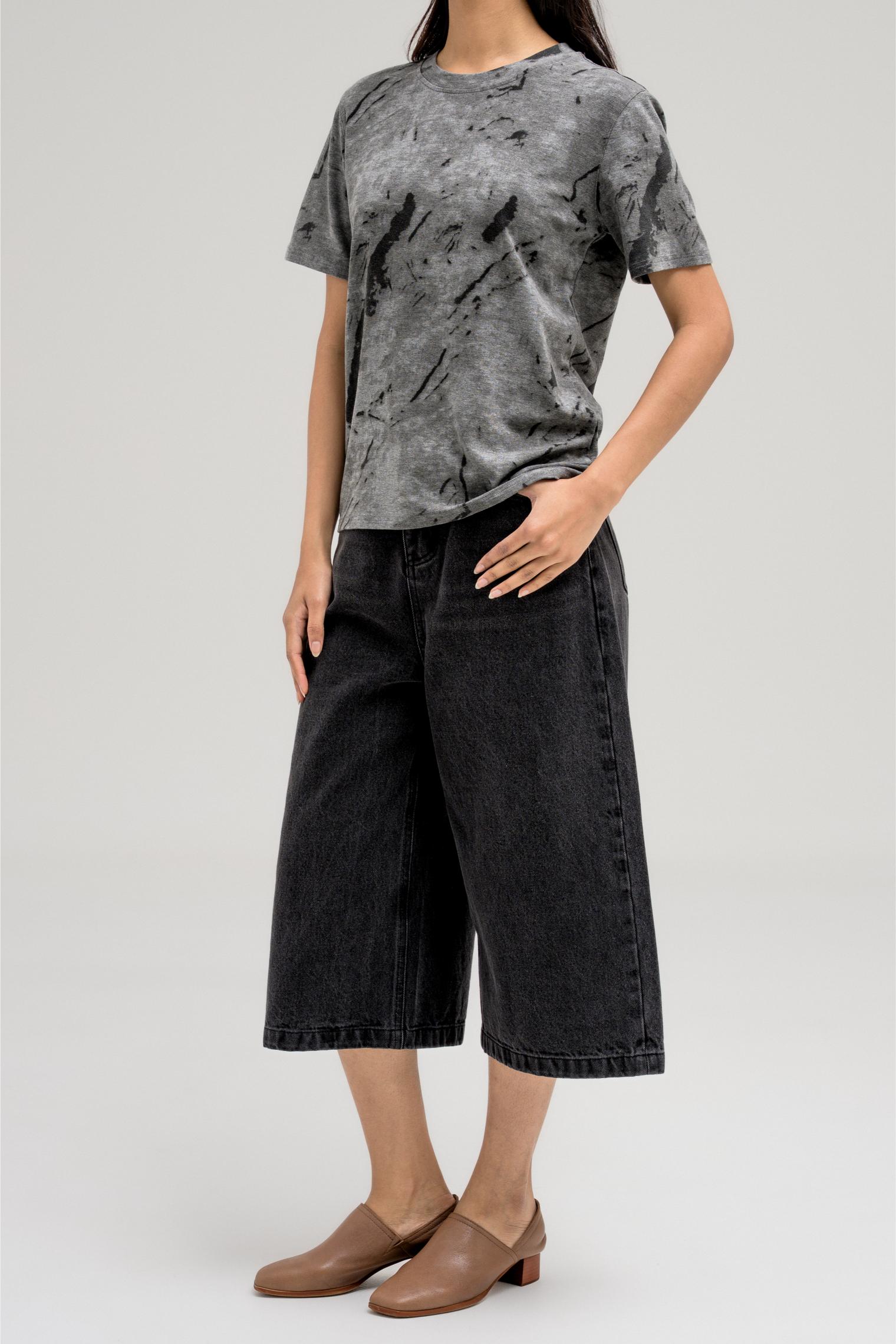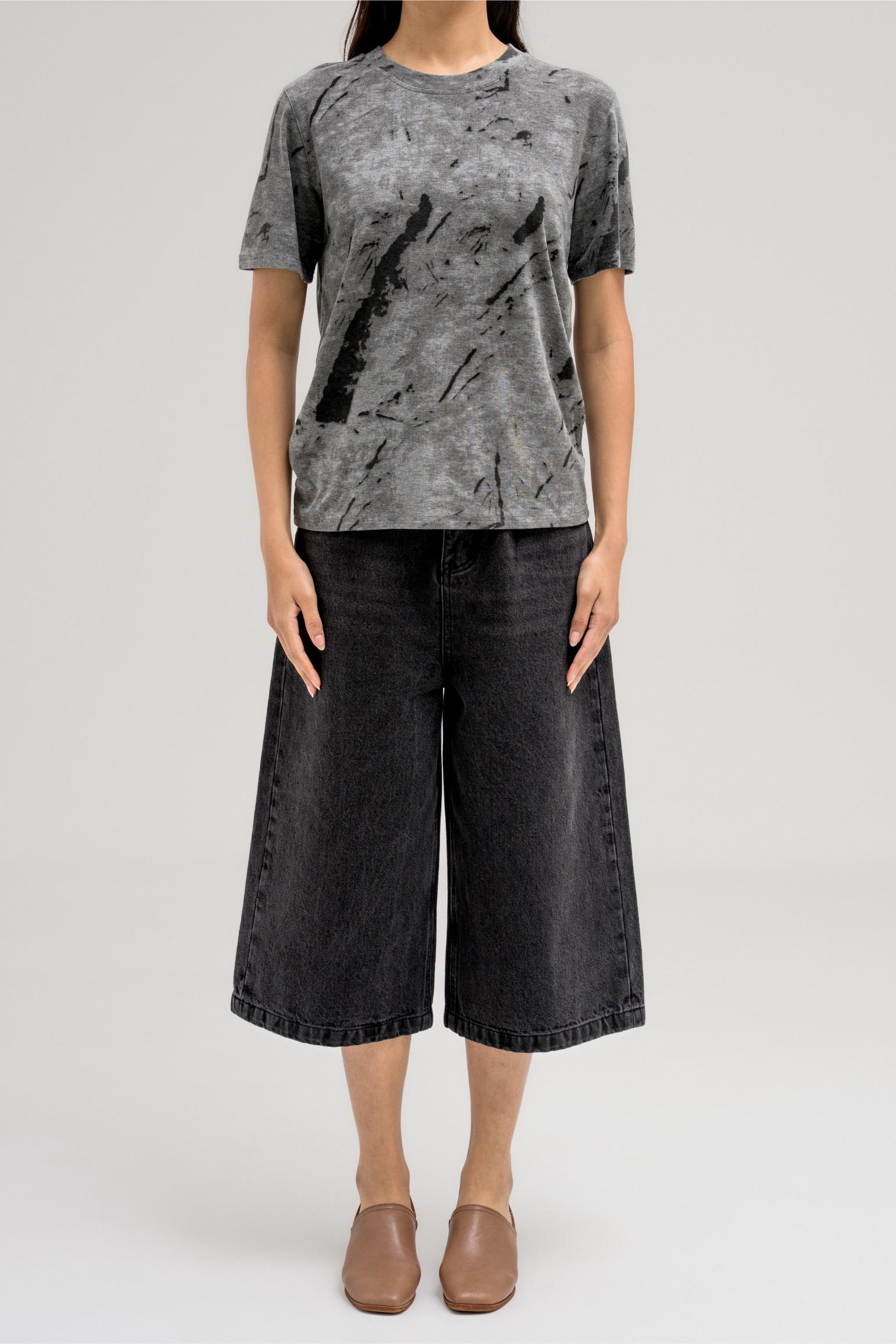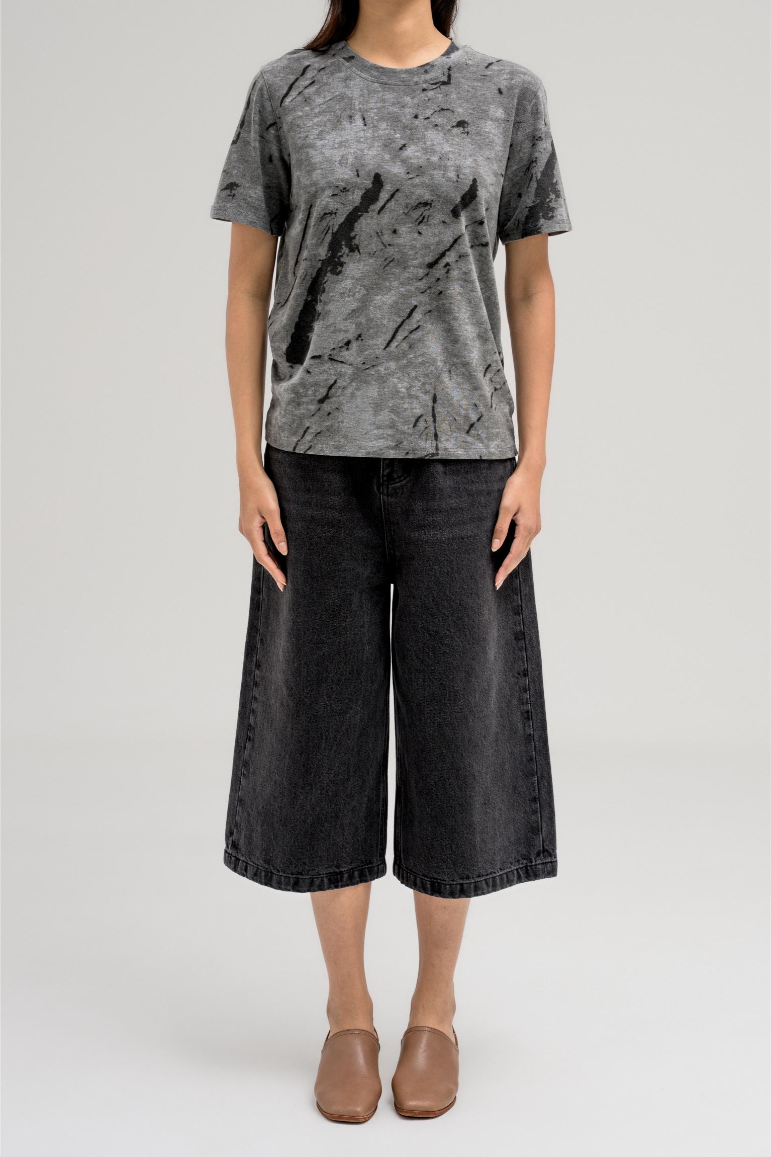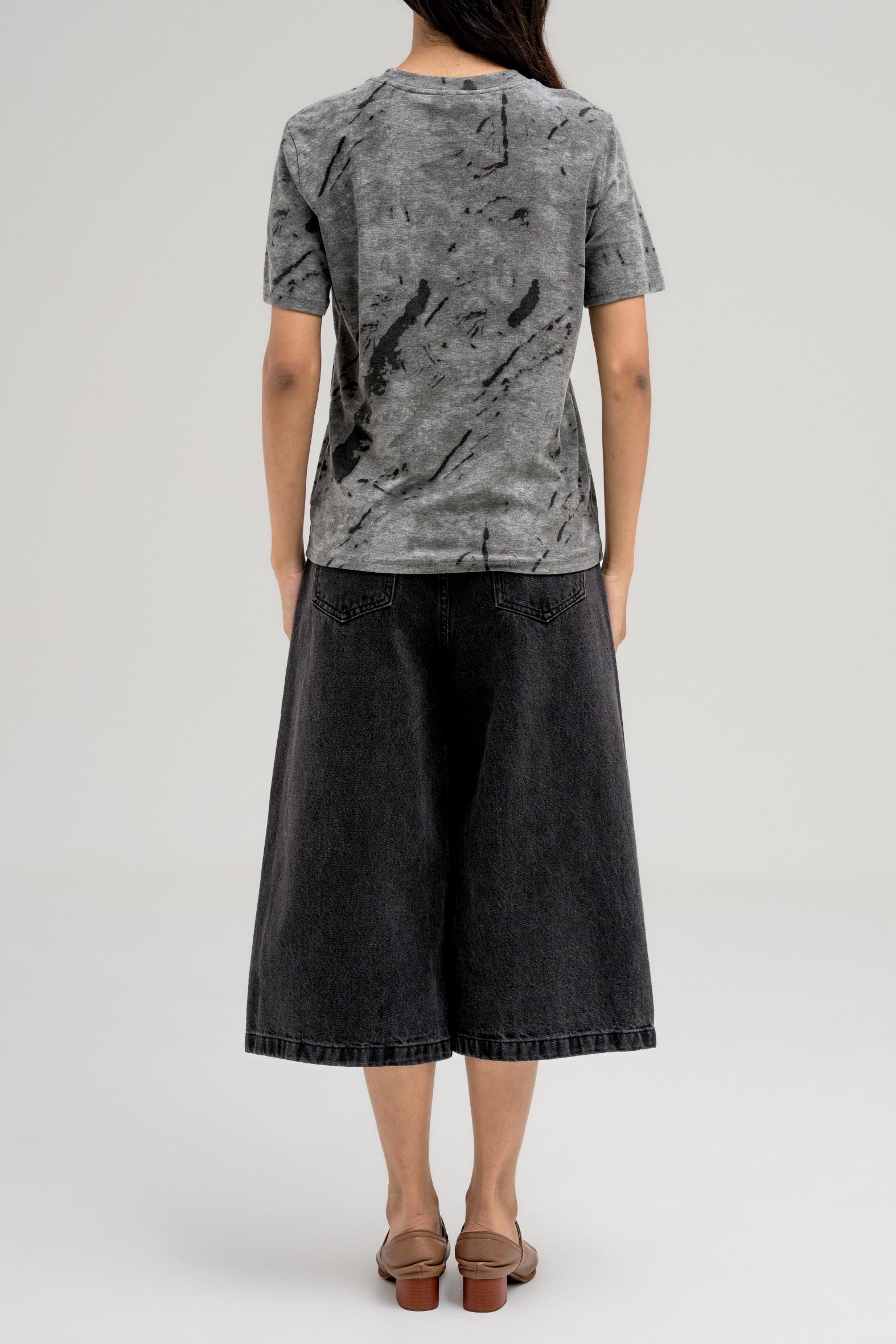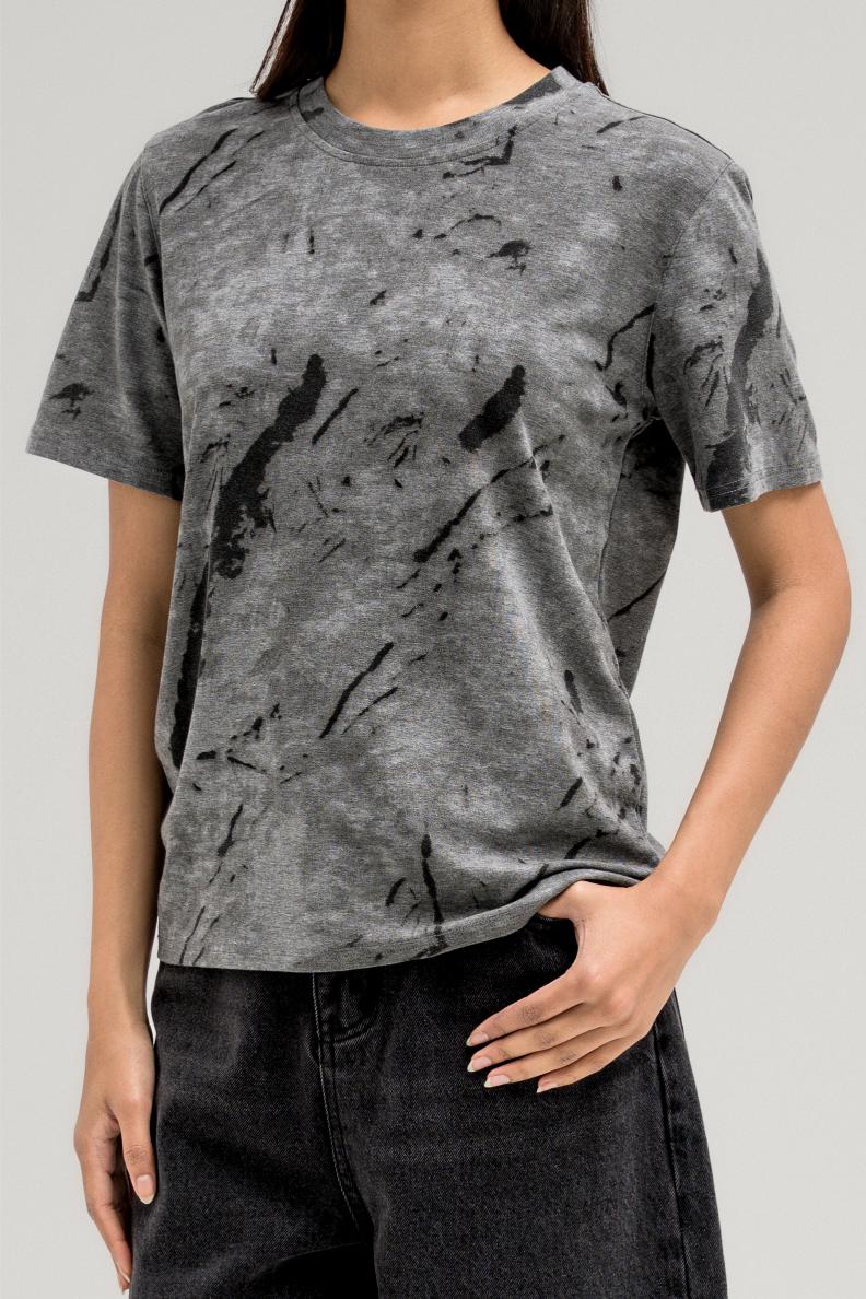 Casual short-sleeve grey t-shirt featuring a black splatter effect that gives it a bold, edgy touch. The crew neckline and relaxed fit makes it a comfortable, everyday essential.