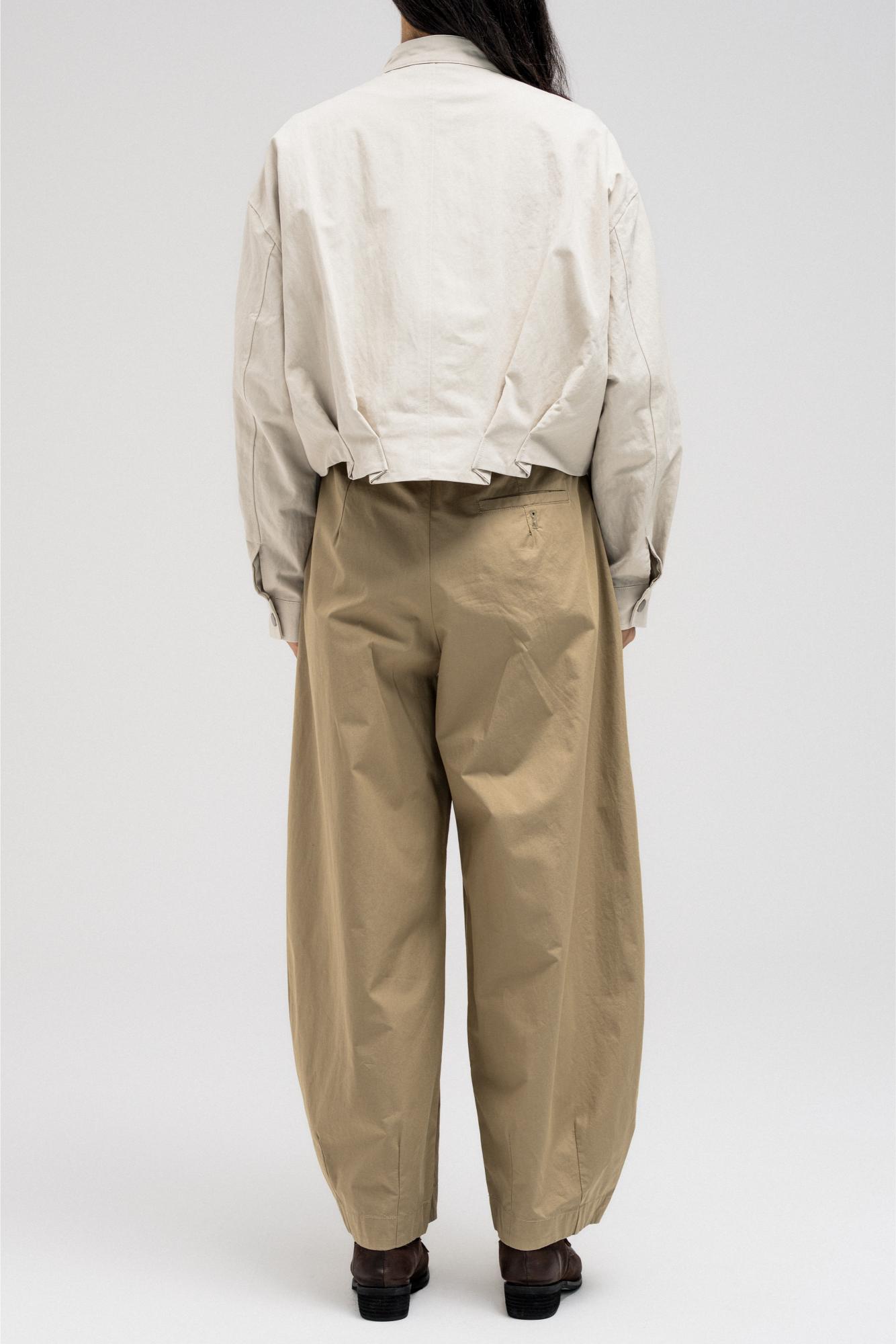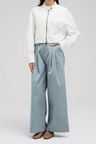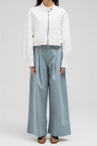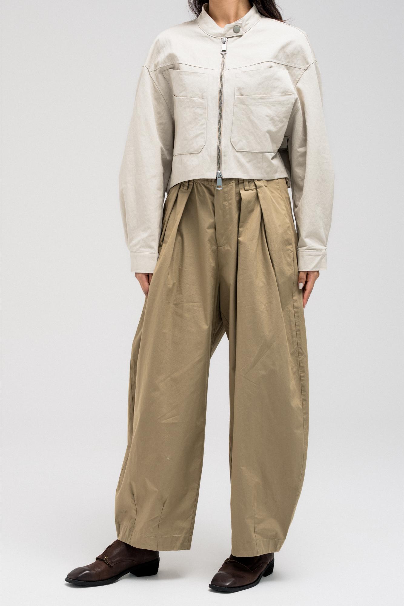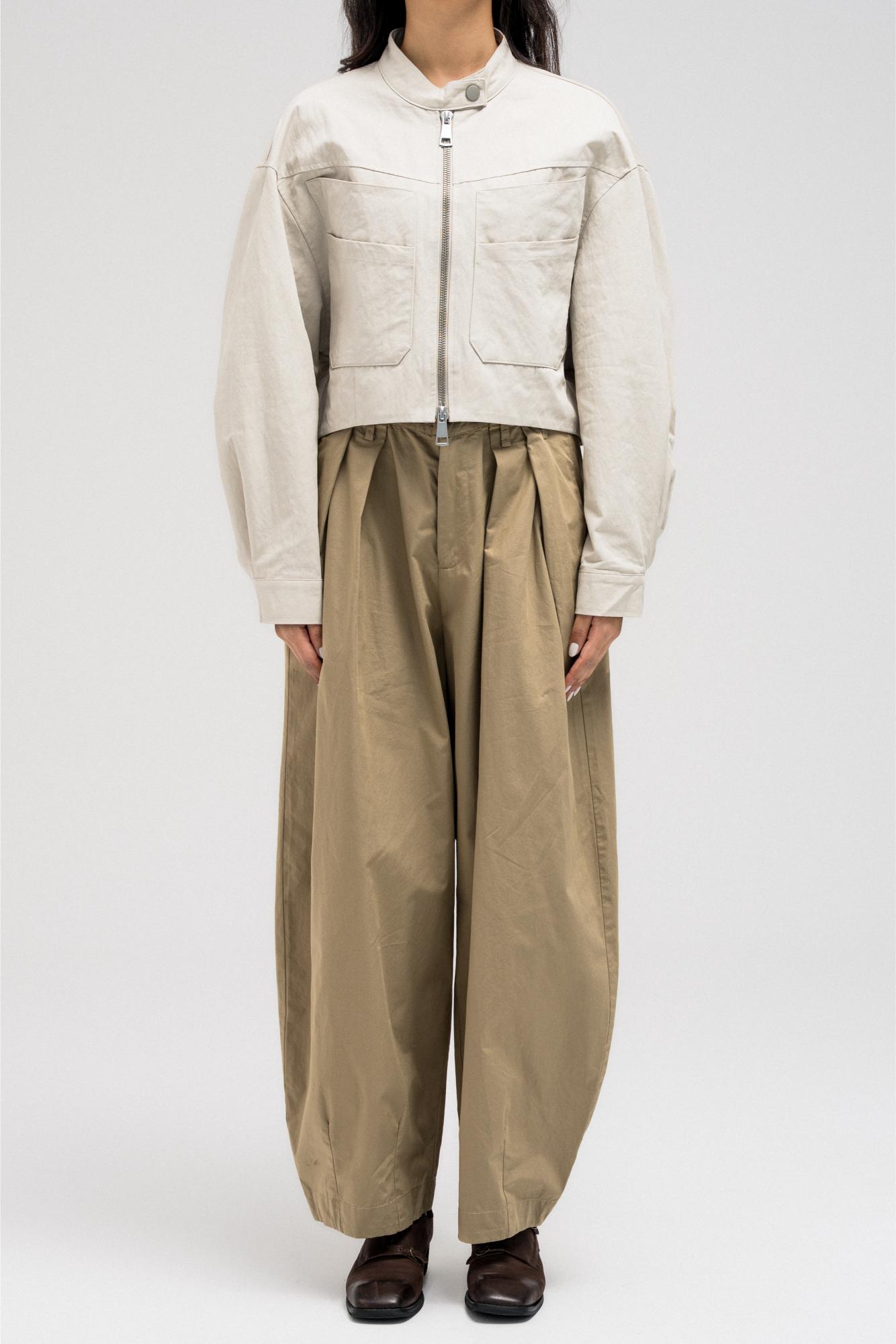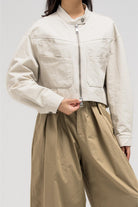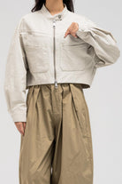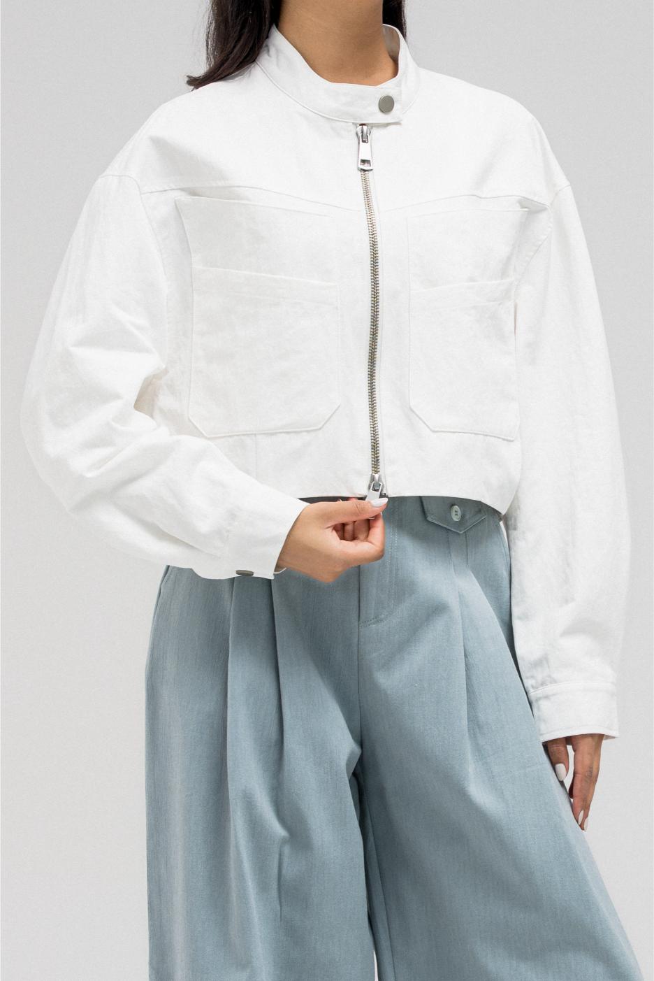 Cropped jacket featuring a round collar design and double zipper front closure. Includes two chest pockets for a stylish and functional look.
