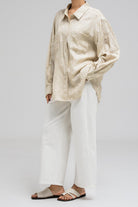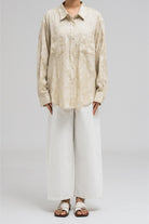 A lightweight classic button-down shirt featuring a soft collar and two chest pockets. The standout feature is its unique fabric design a blend of textured threadwork and subtle patch-like patterns that give it a soft, elevated finish.
