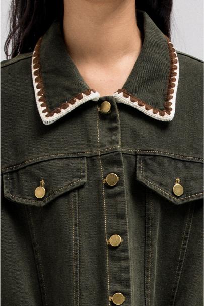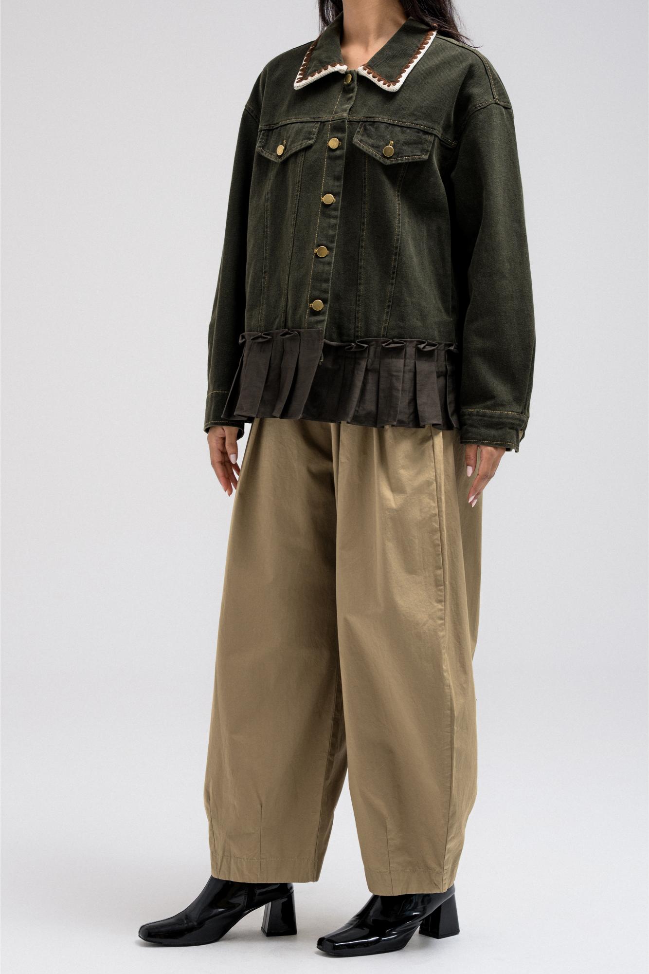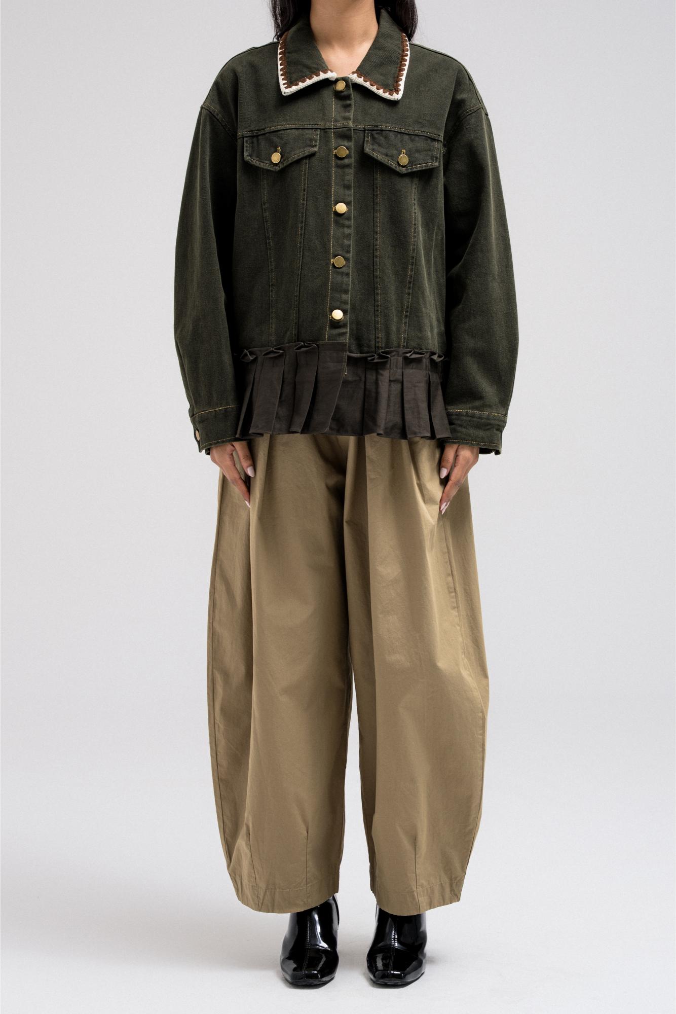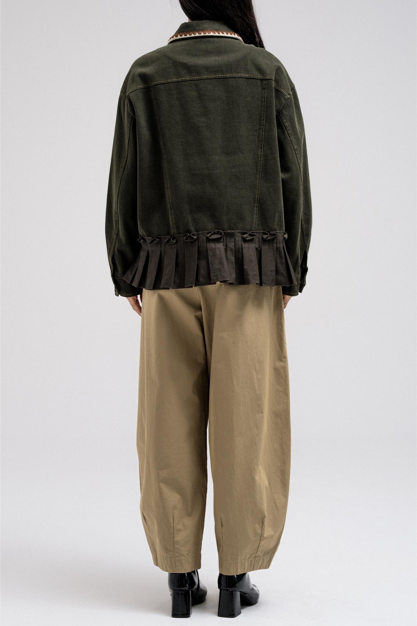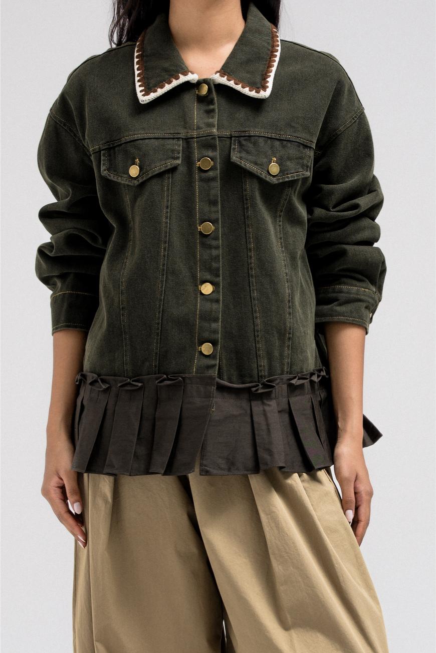 A statement denim jacket featuring contrast stitching along the collar for a refined touch. It’s detailed with a button-down front, front pockets, and pleated fabric panels at the hem that add a layered, fashion-forward edge. The structured design and unique textures combine utility with modern elegance, making it a standout outerwear piece.