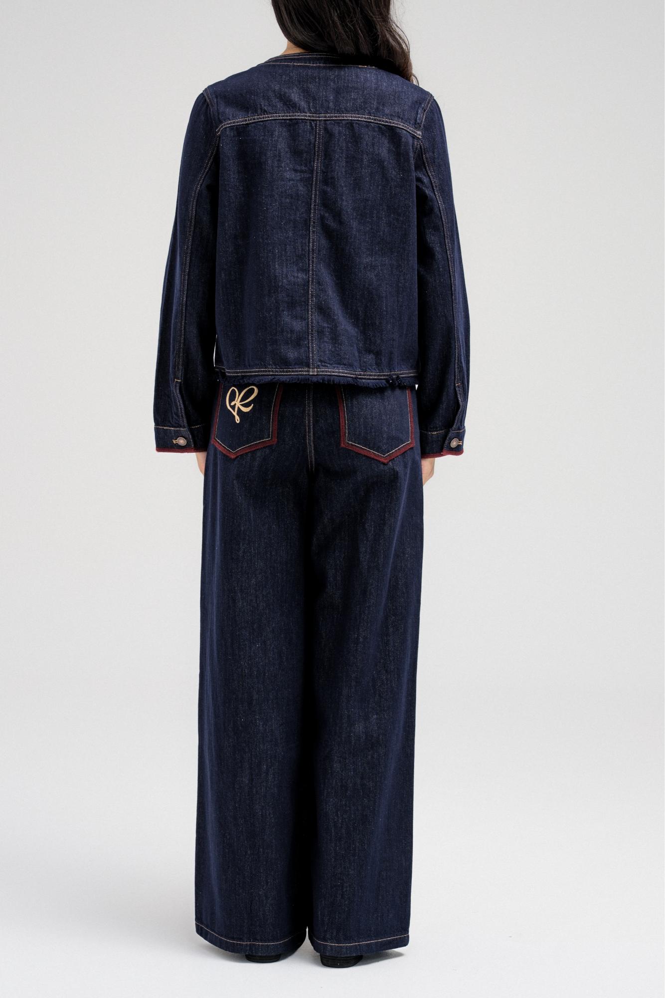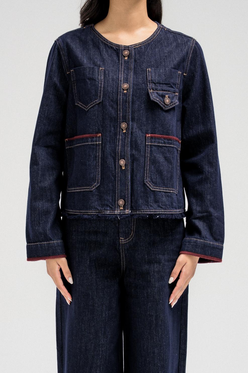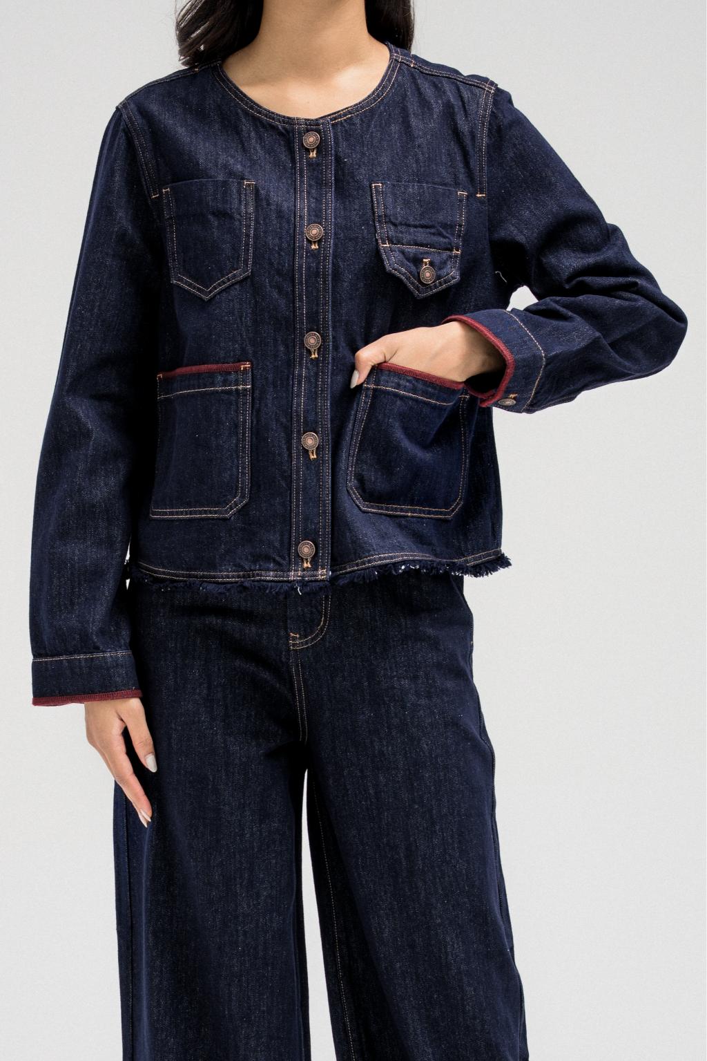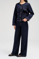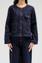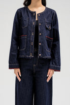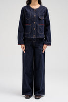 Denim jacket in a dark wash finish, featuring a front button closure, chest pocket, and red contrast stitching for a timeless look. Designed with a relaxed fit that pairs perfectly with the matching denim pants for a coordinated set.