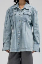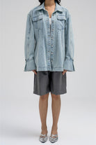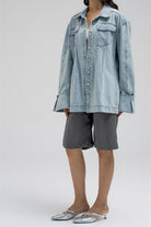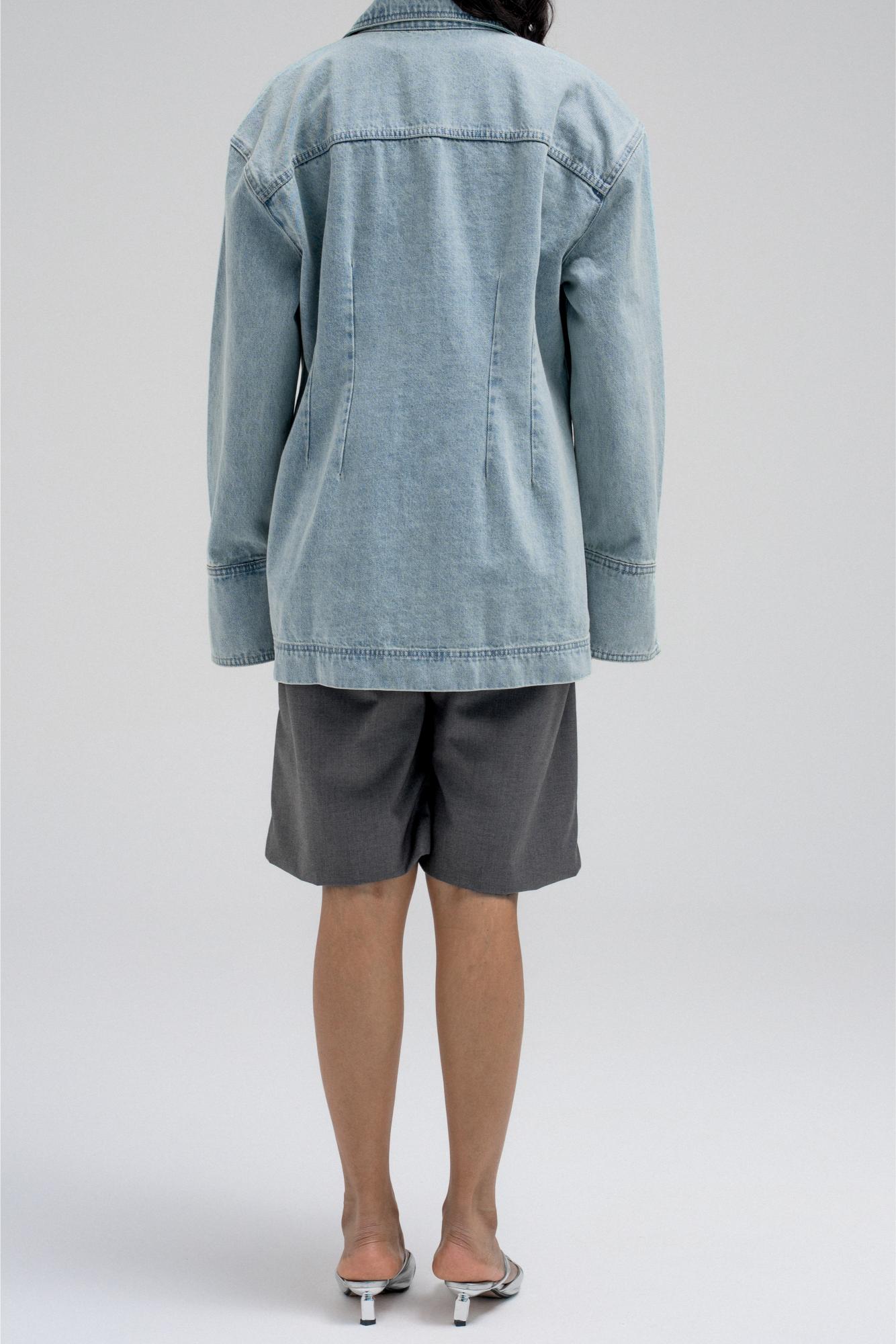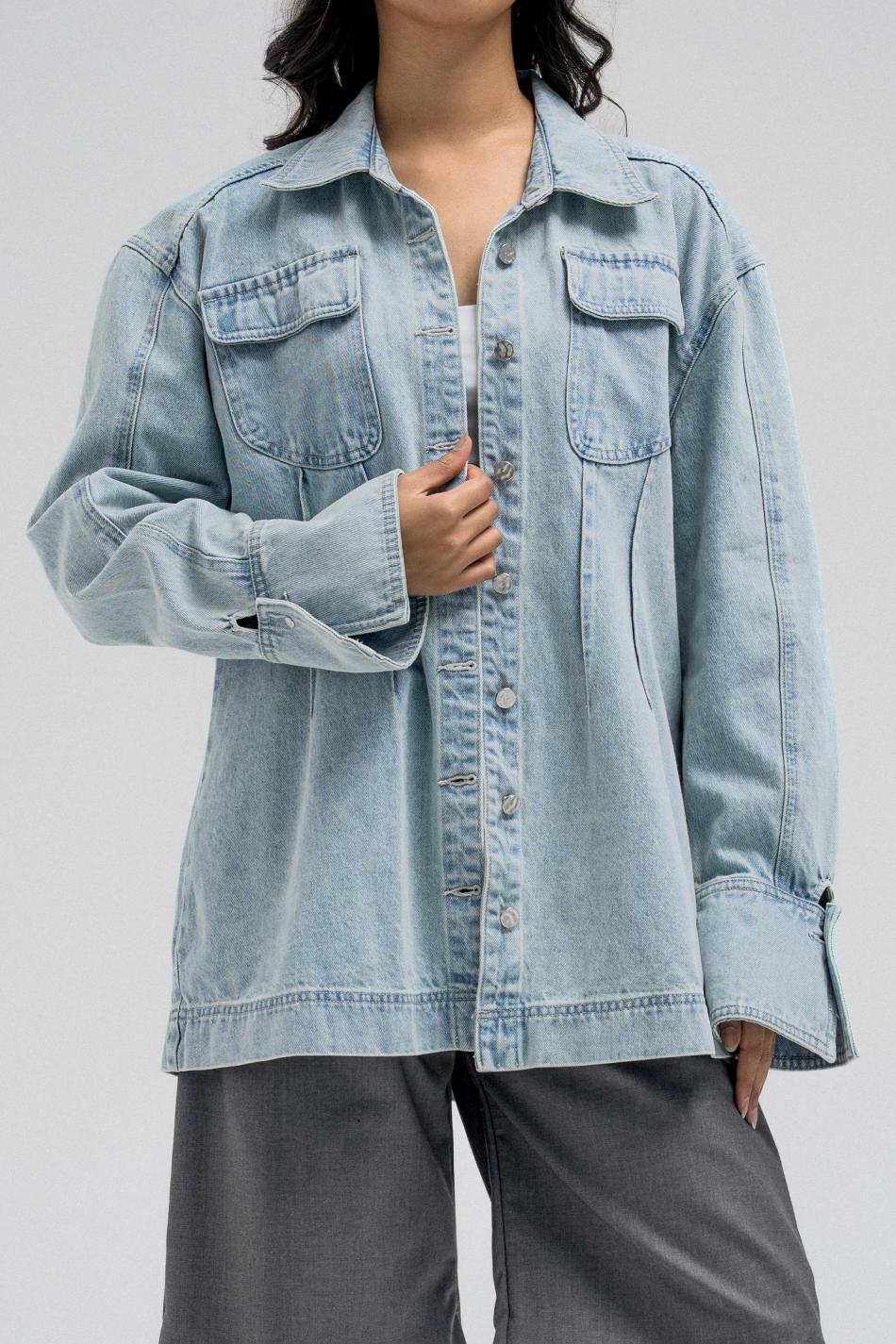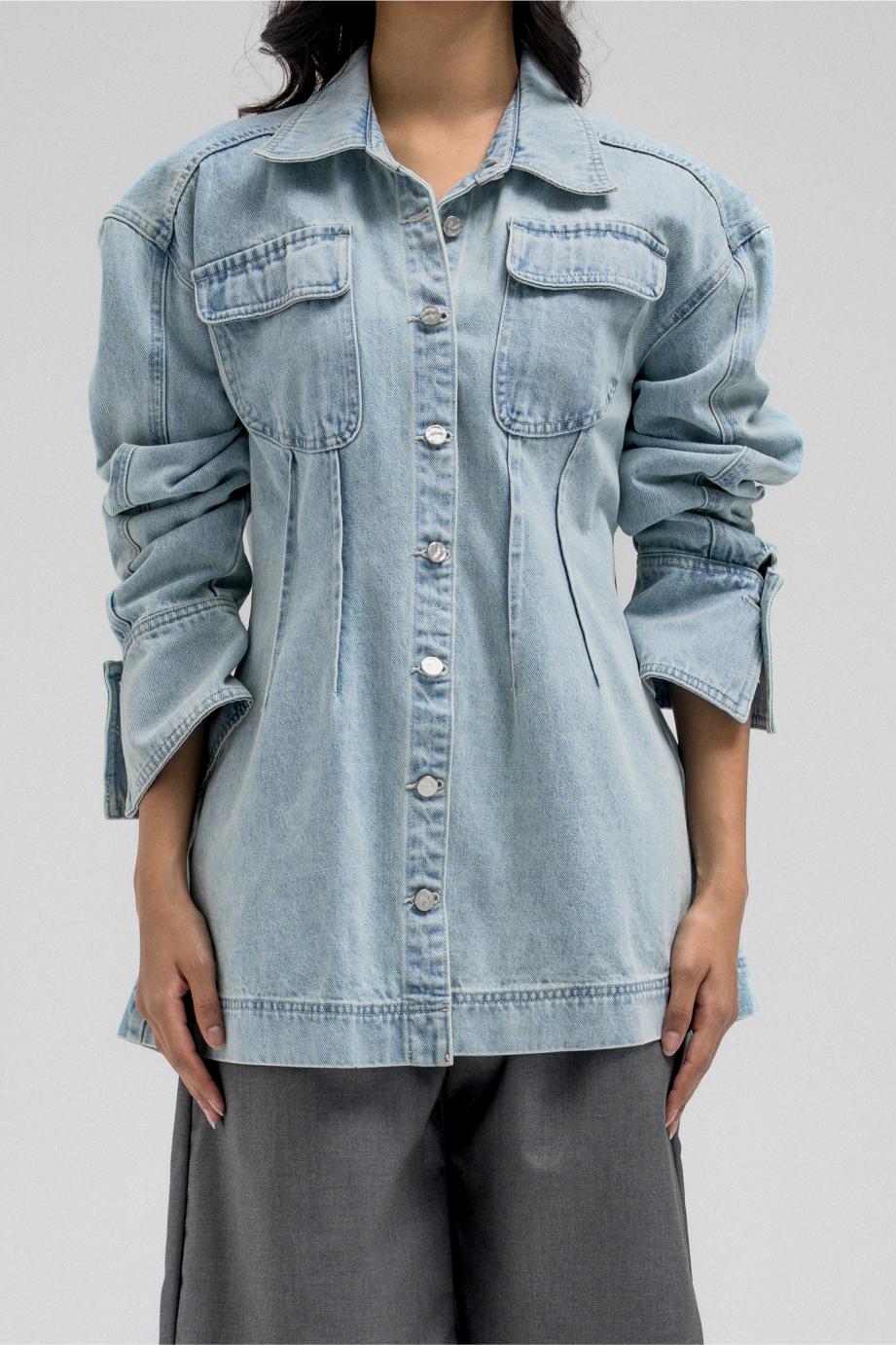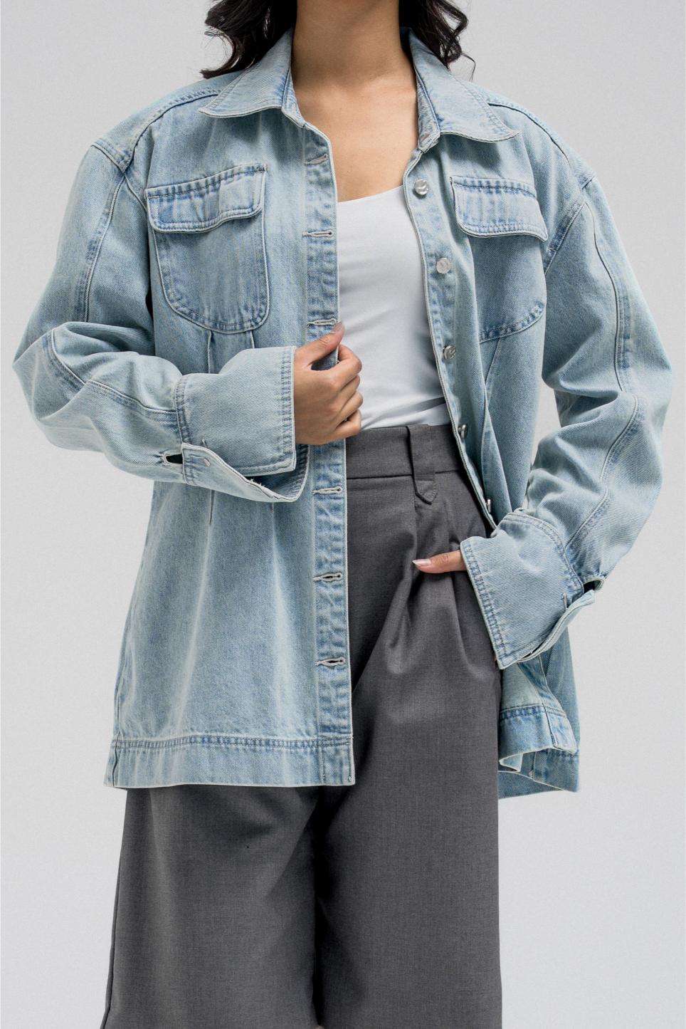 Denim jacket featuring a front metal button closure and a slightly cinched waist for a flattering fit. Designed with a classic collar and two chest flap pockets.