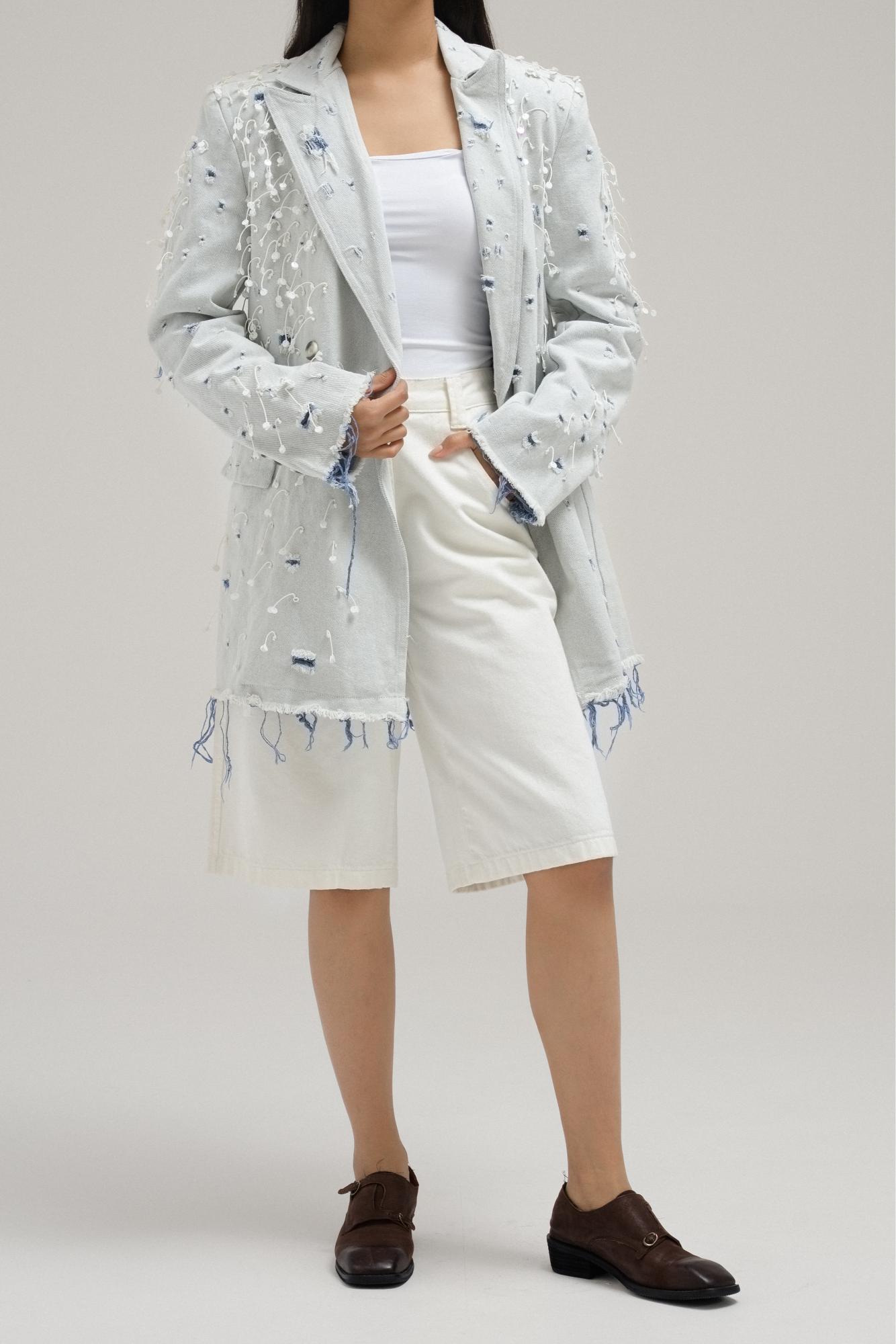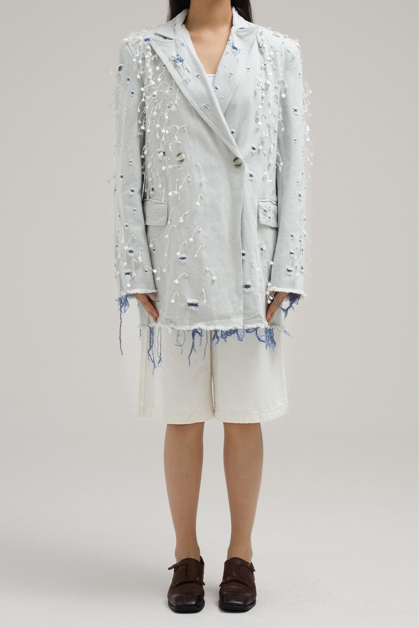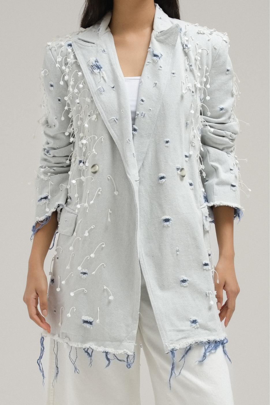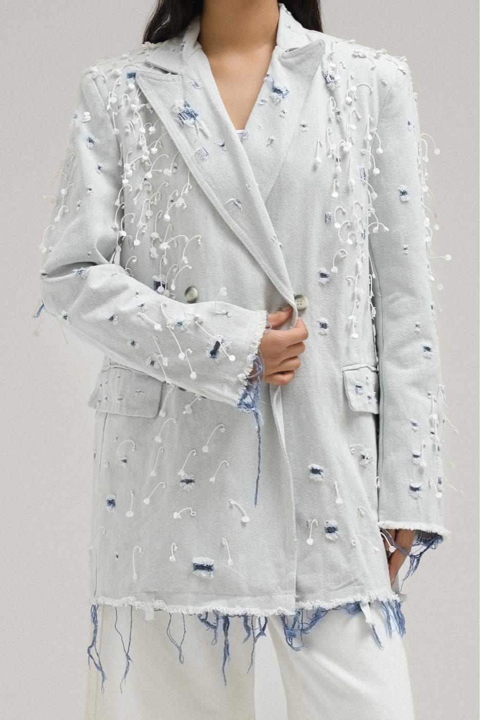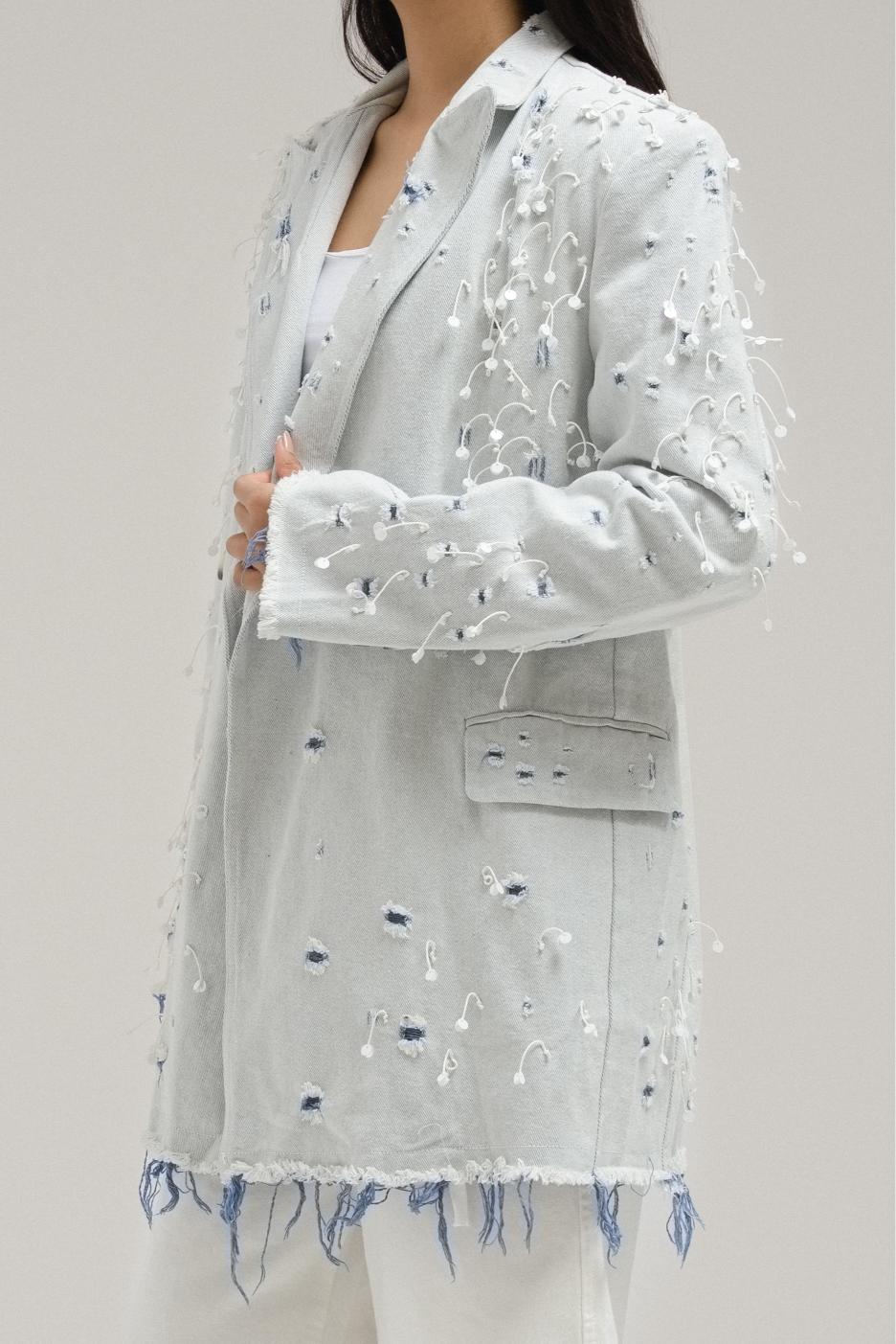 A statement jacket crafted from a denim-textured fabric, elevated with delicate 3D embroidered details that cascade across the front for a textured, artistic effect. Subtle cut-out openings along the sleeves add a modern, see-through touch. Designed with classic notched lapels, front button closure, and flap pockets, this piece blends tailoring with creative craftsmanship for a bold yet elegant finish.