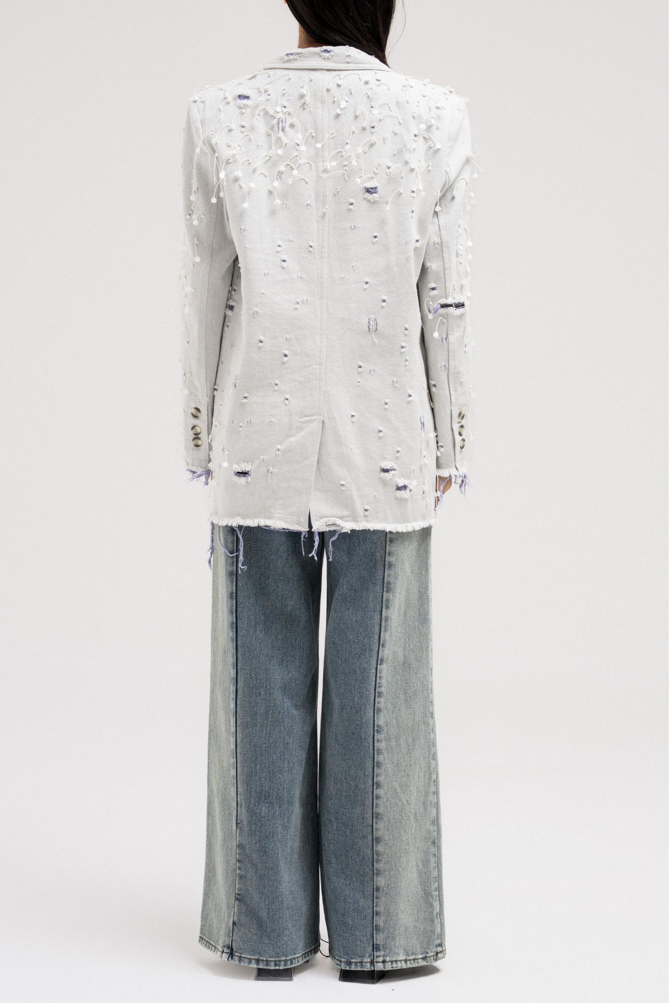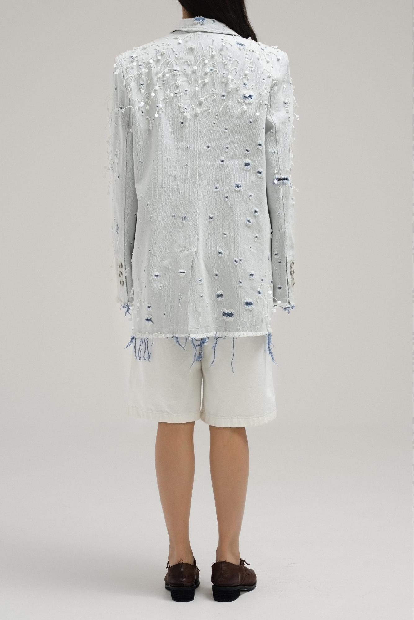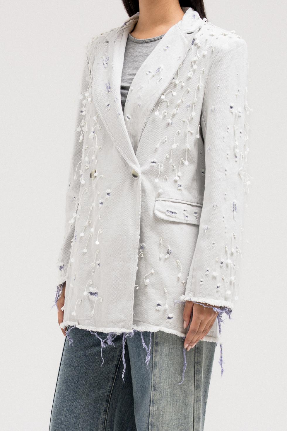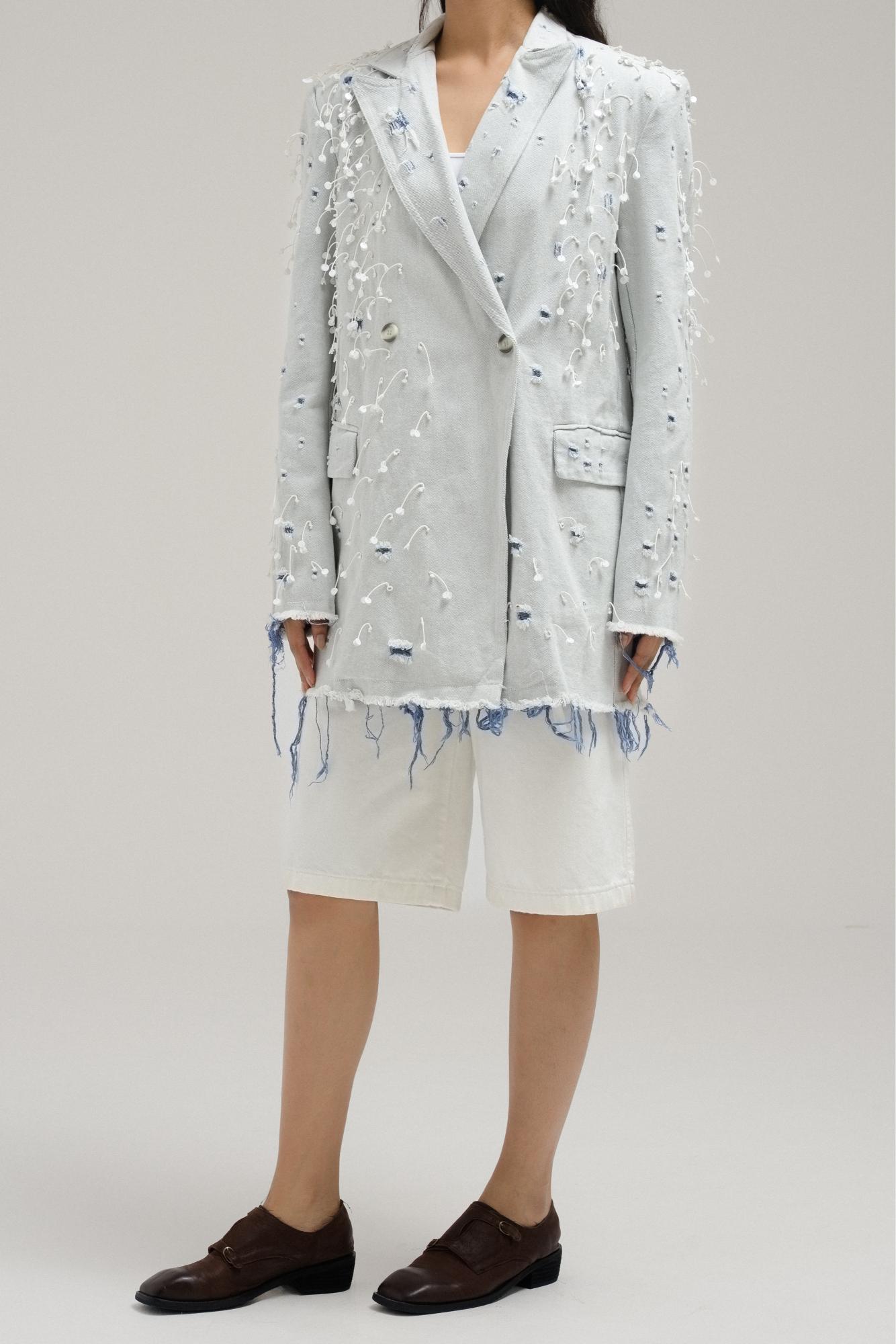 A statement jacket crafted from a denim-textured fabric, elevated with delicate 3D embroidered details that cascade across the front for a textured, artistic effect. Subtle cut-out openings along the sleeves add a modern, see-through touch. Designed with classic notched lapels, front button closure, and flap pockets, this piece blends tailoring with creative craftsmanship for a bold yet elegant finish.
