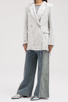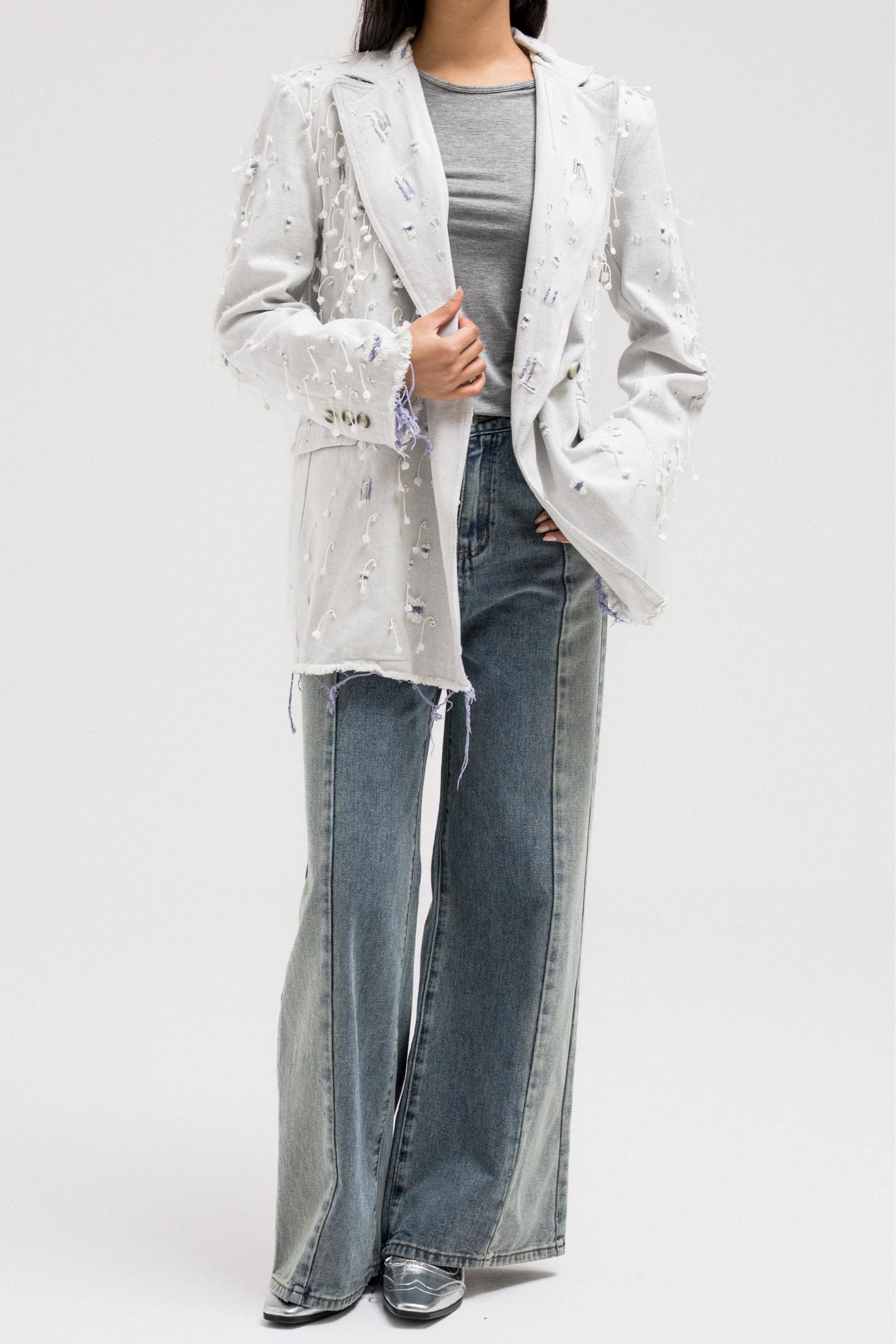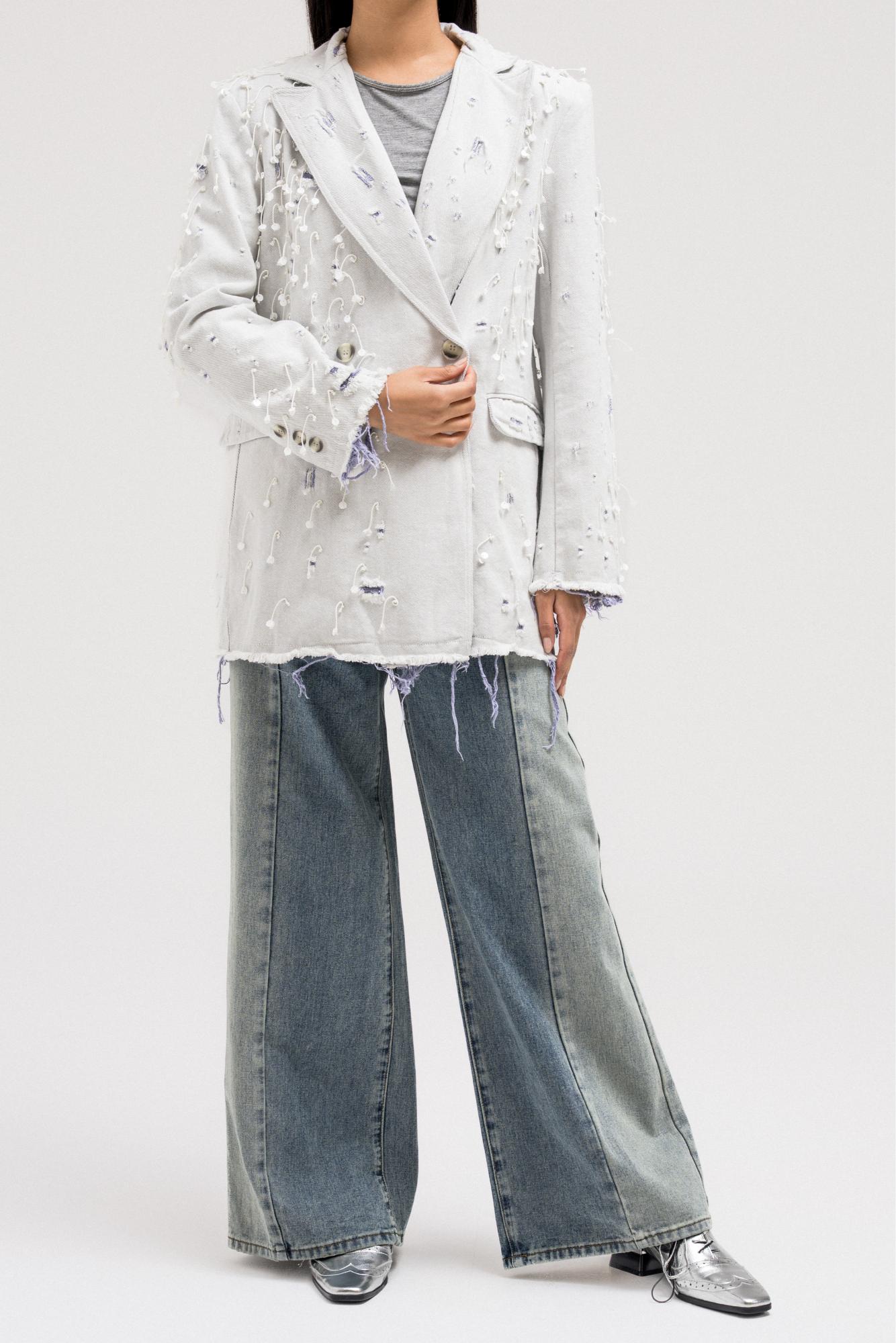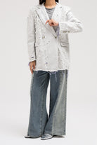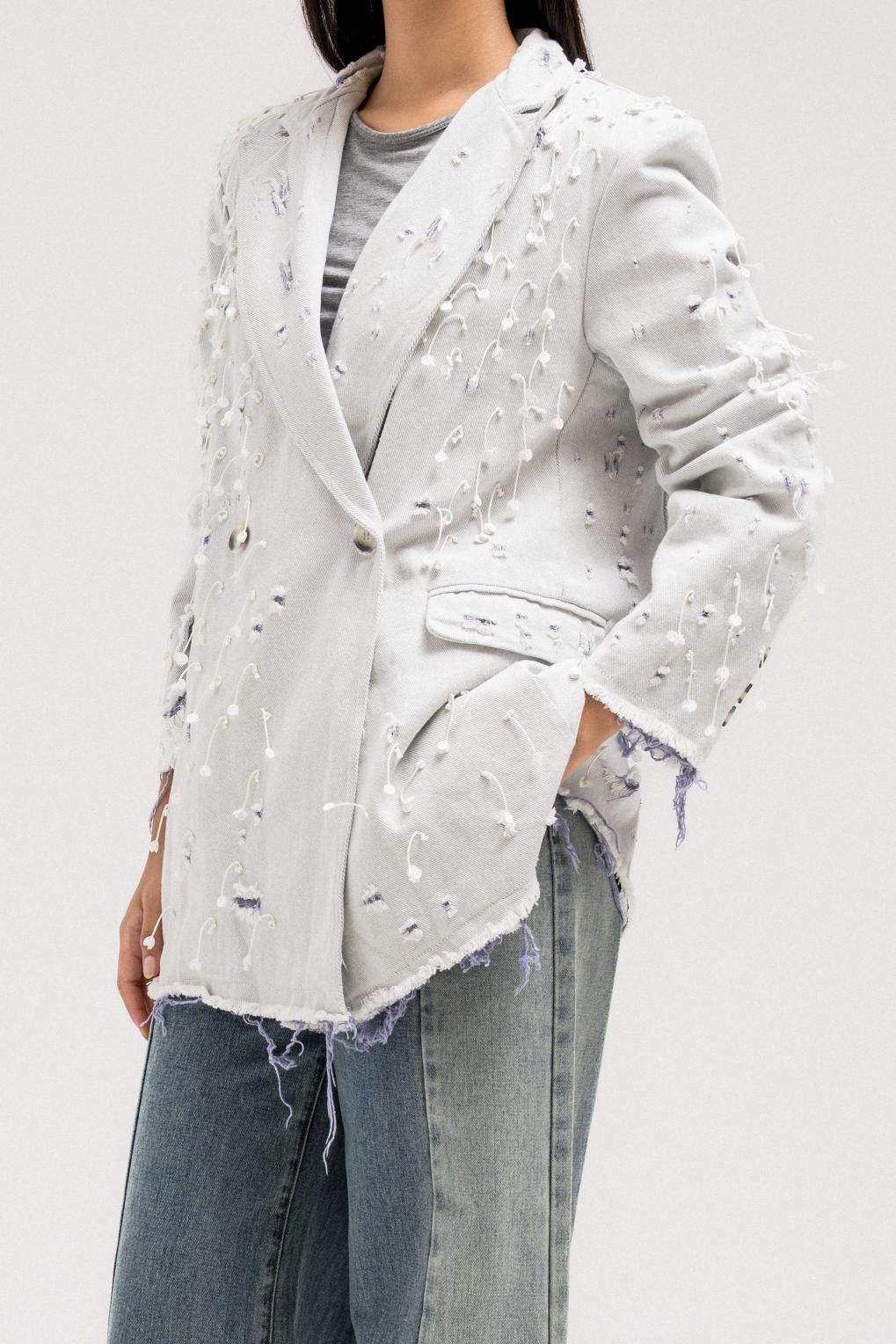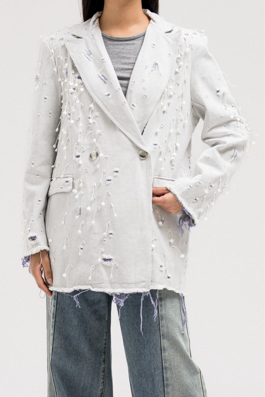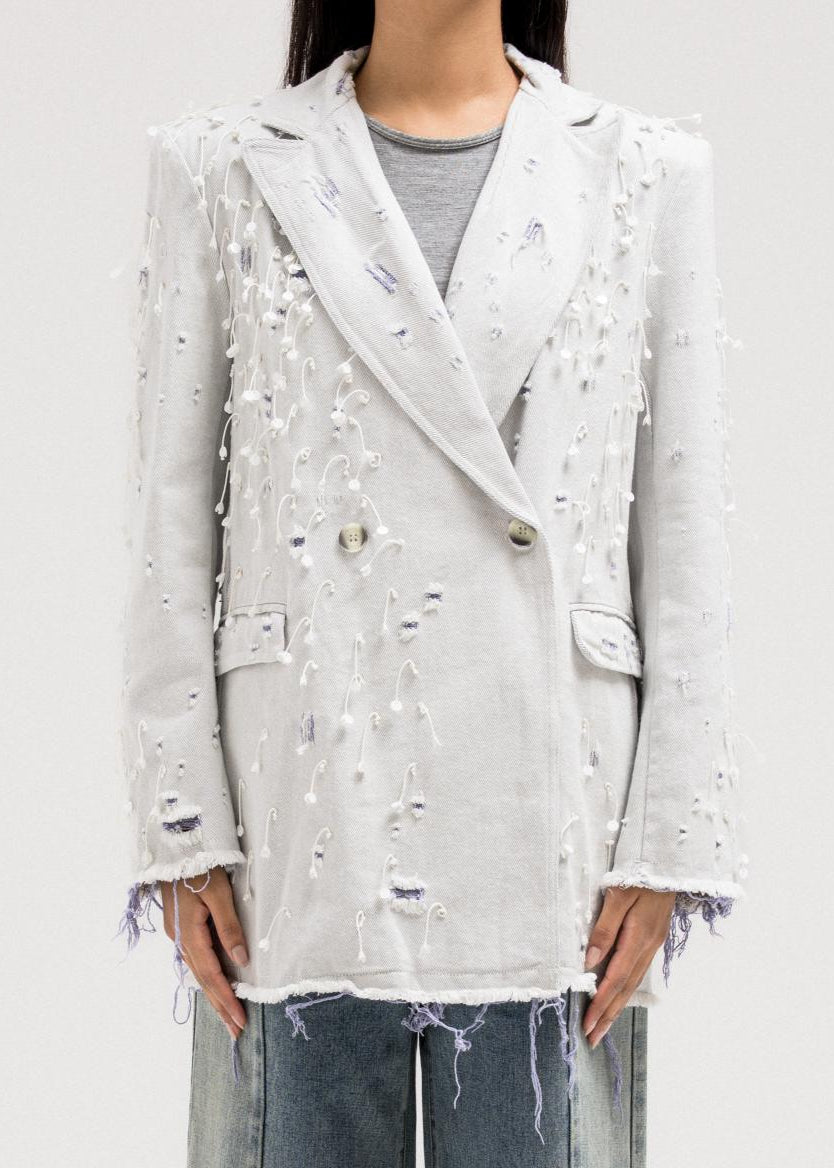 A statement jacket crafted from a denim-textured fabric, elevated with delicate 3D embroidered details that cascade across the front for a textured, artistic effect. Subtle cut-out openings along the sleeves add a modern, see-through touch. Designed with classic notched lapels, front button closure, and flap pockets, this piece blends tailoring with creative craftsmanship for a bold yet elegant finish.