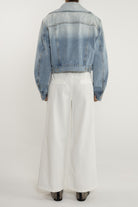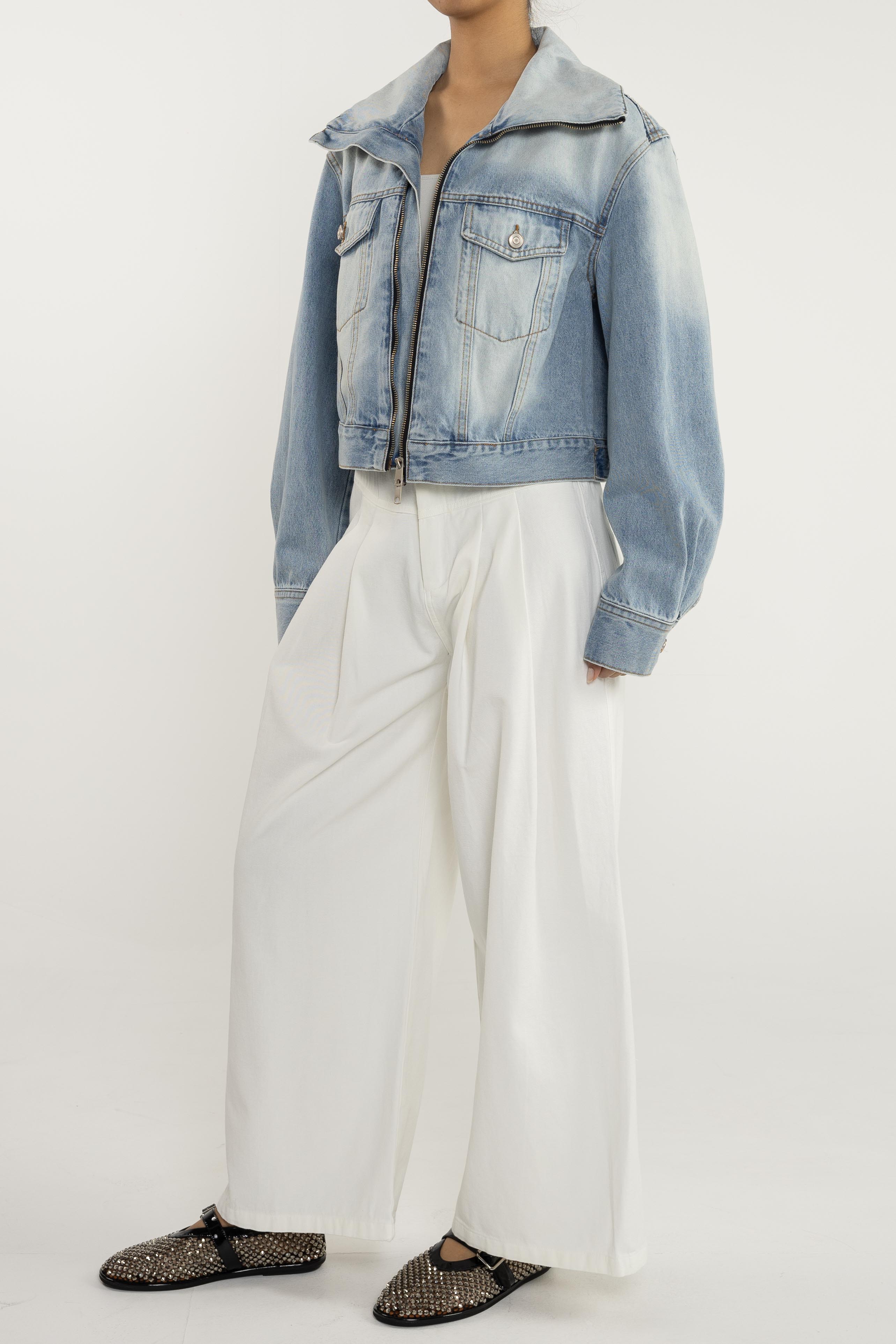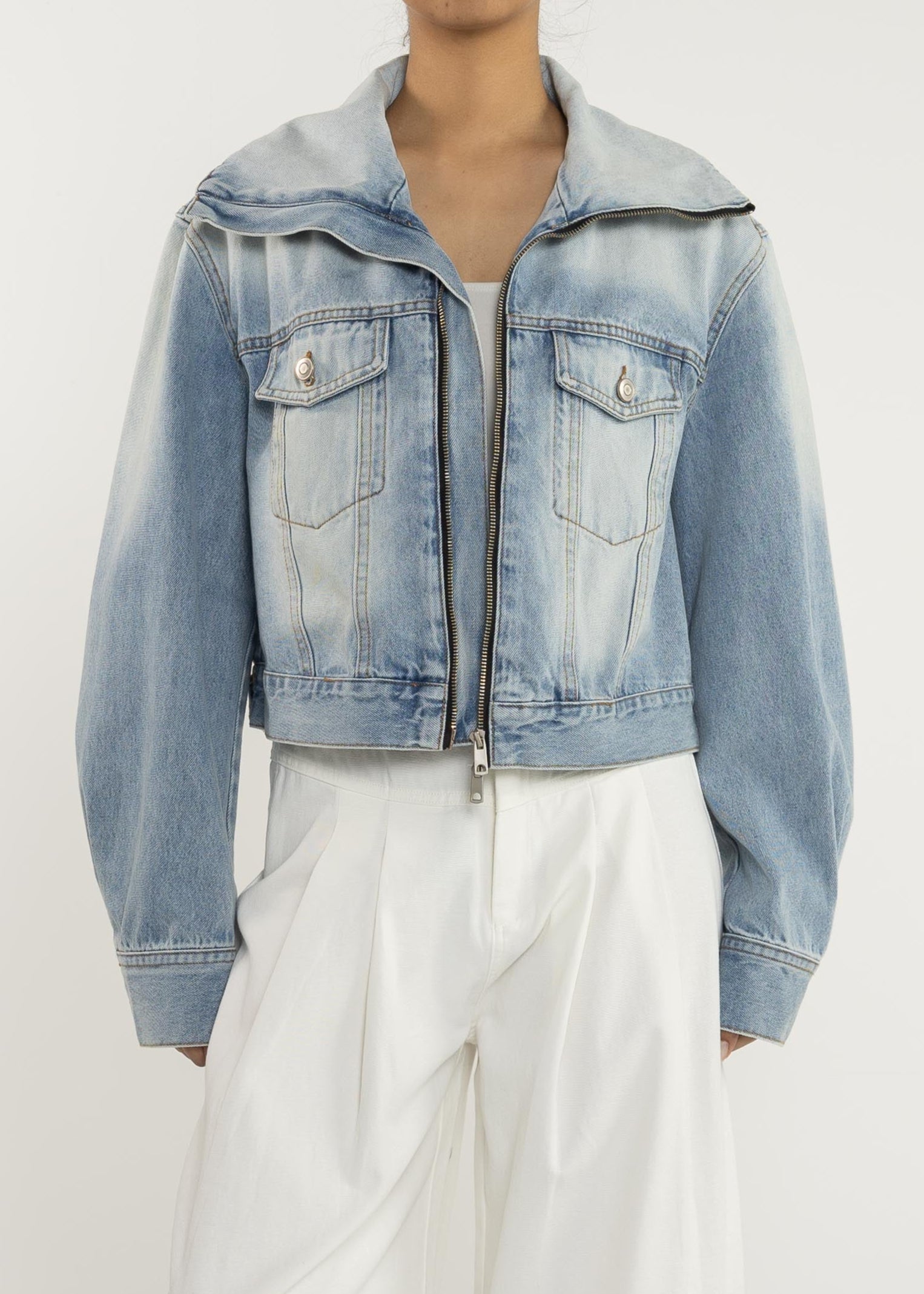 Denim washed jacket. Zip closure front. Two front flap pockets.