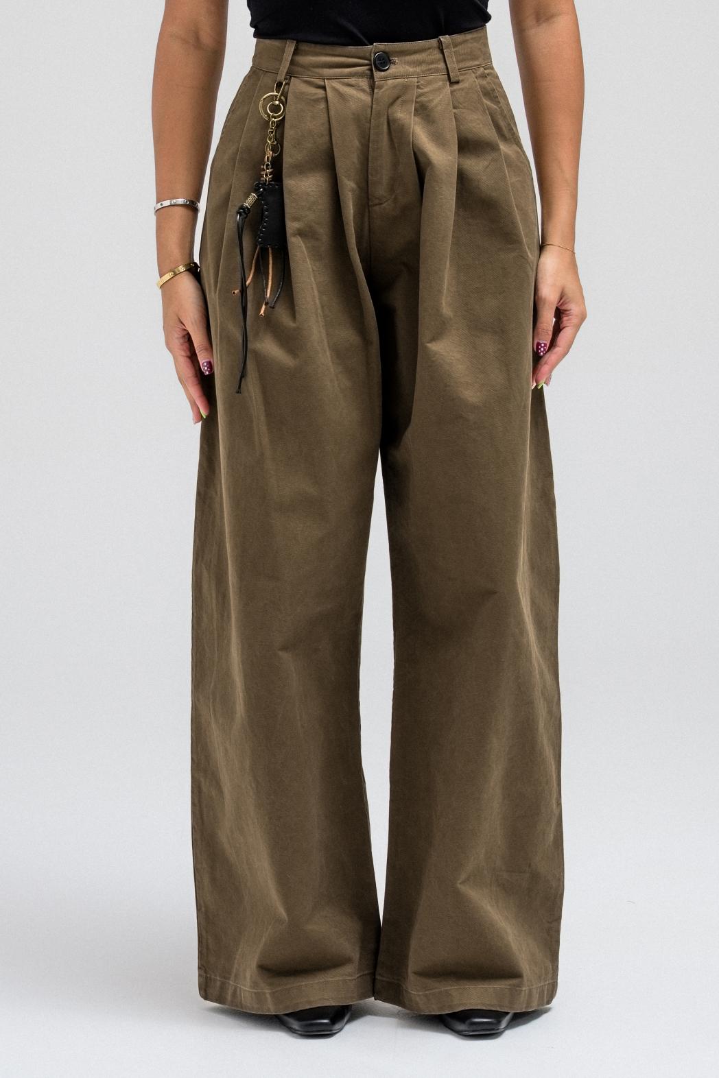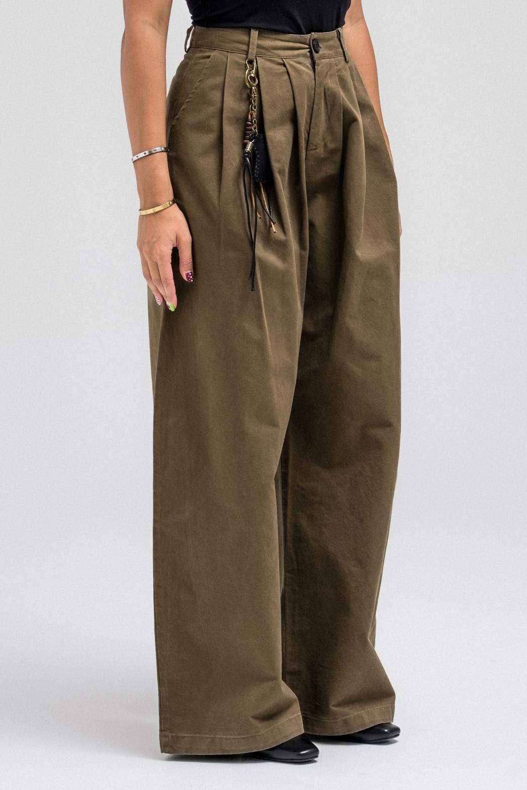 Crafted for both comfort and edge, these pants feature a front button and zipper closure with a relaxed wide-leg fit. Designed with practical side pockets and a detachable keychain-style hanger detail that adds a modern utilitarian touch. Perfect to pair with its matching top for a complete coordinated look.