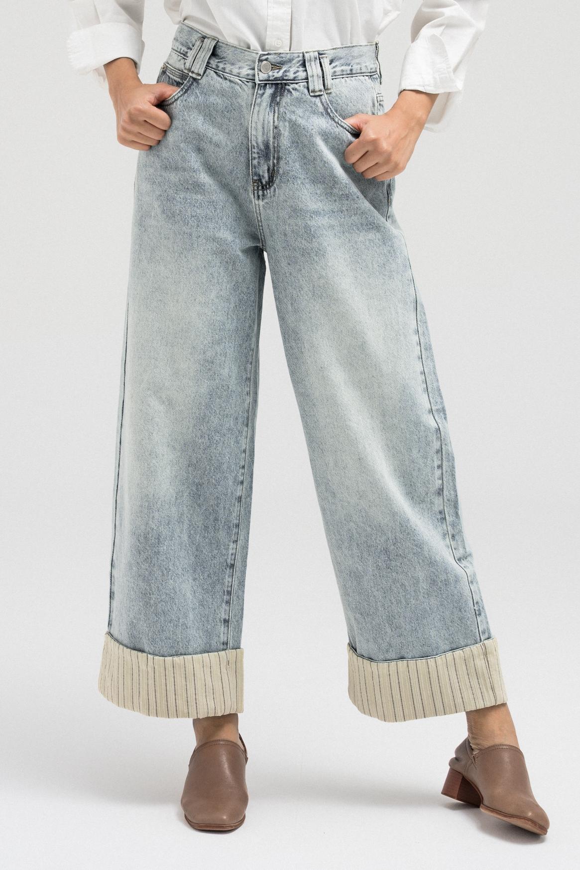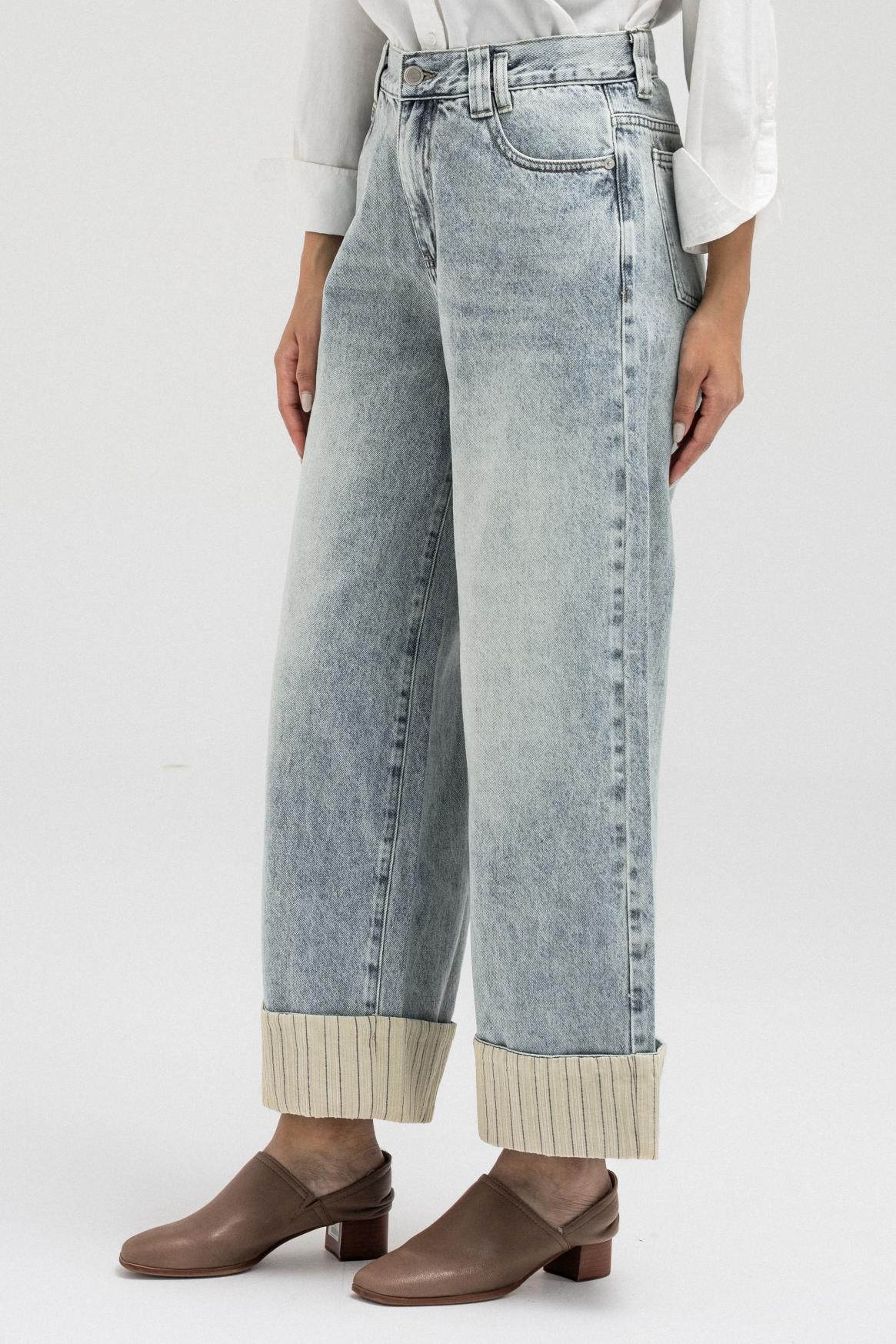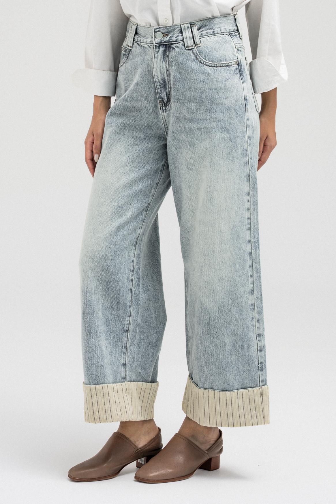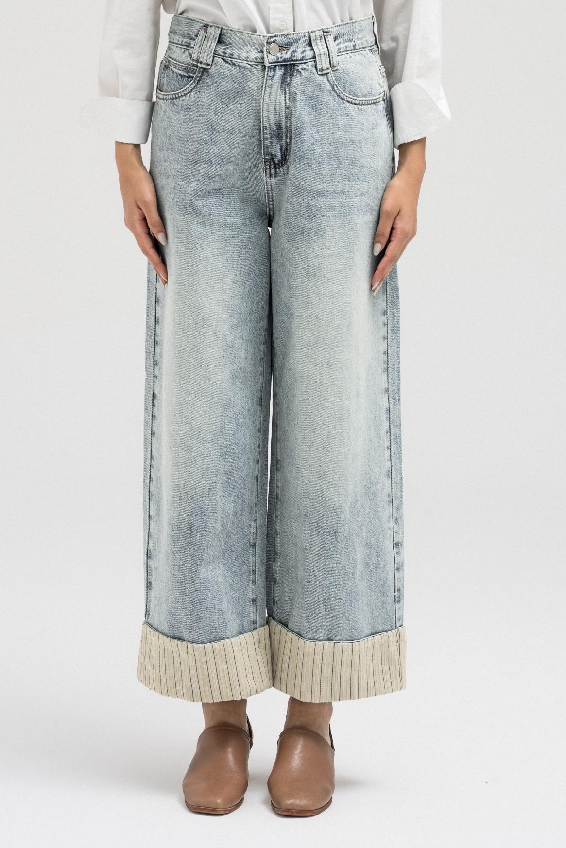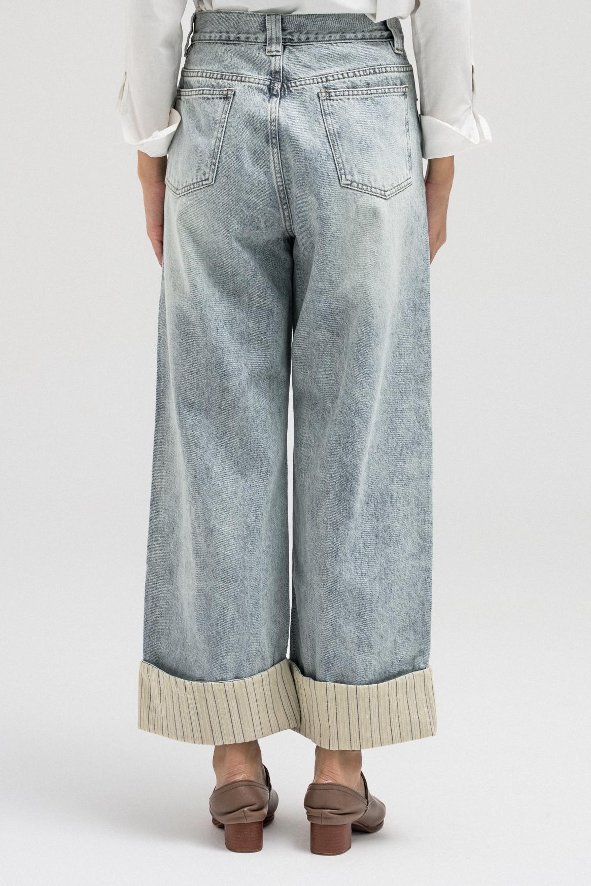 Light wash denim pants designed in a wide-leg cut with a front button and zipper closure. Finished with extra-wide folded stripe hems.