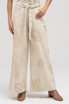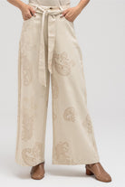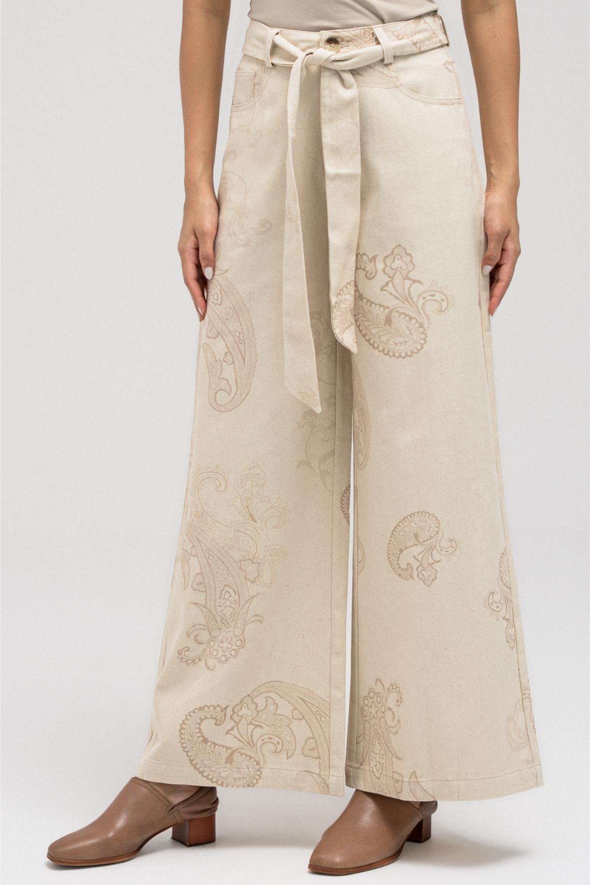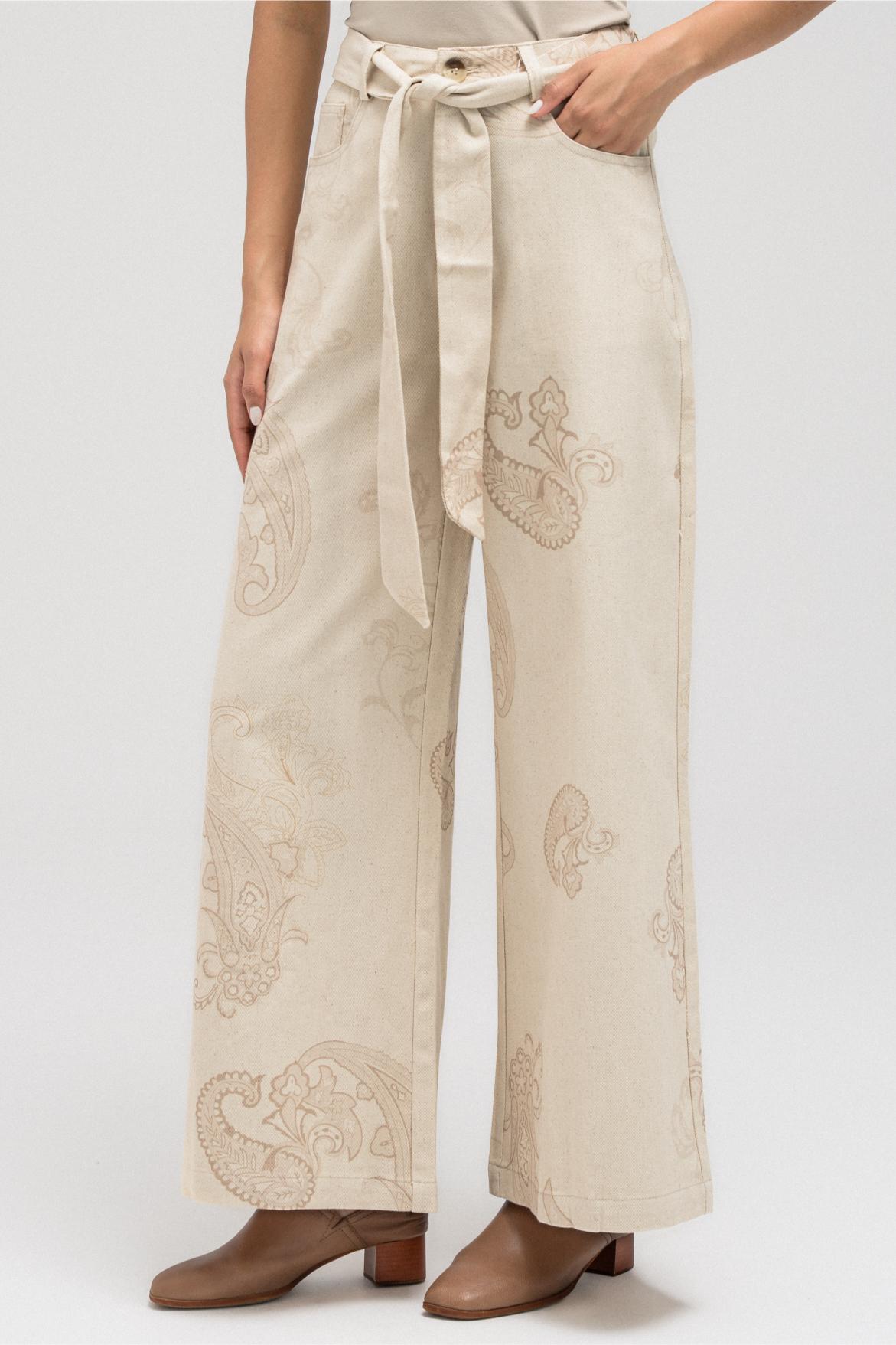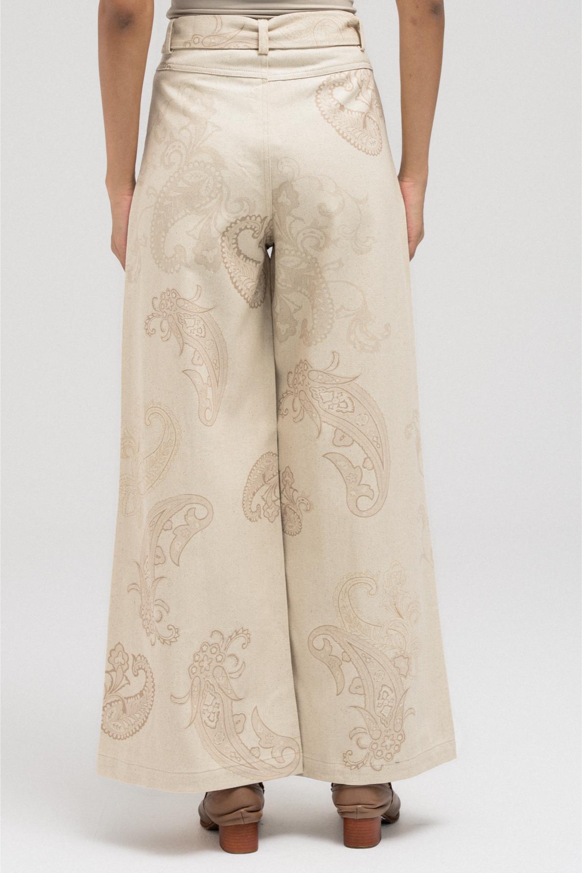 Wide-leg pants feature a subtle pattern design. Designed with side pockets, a front button, and zipper closure.