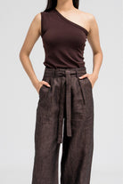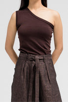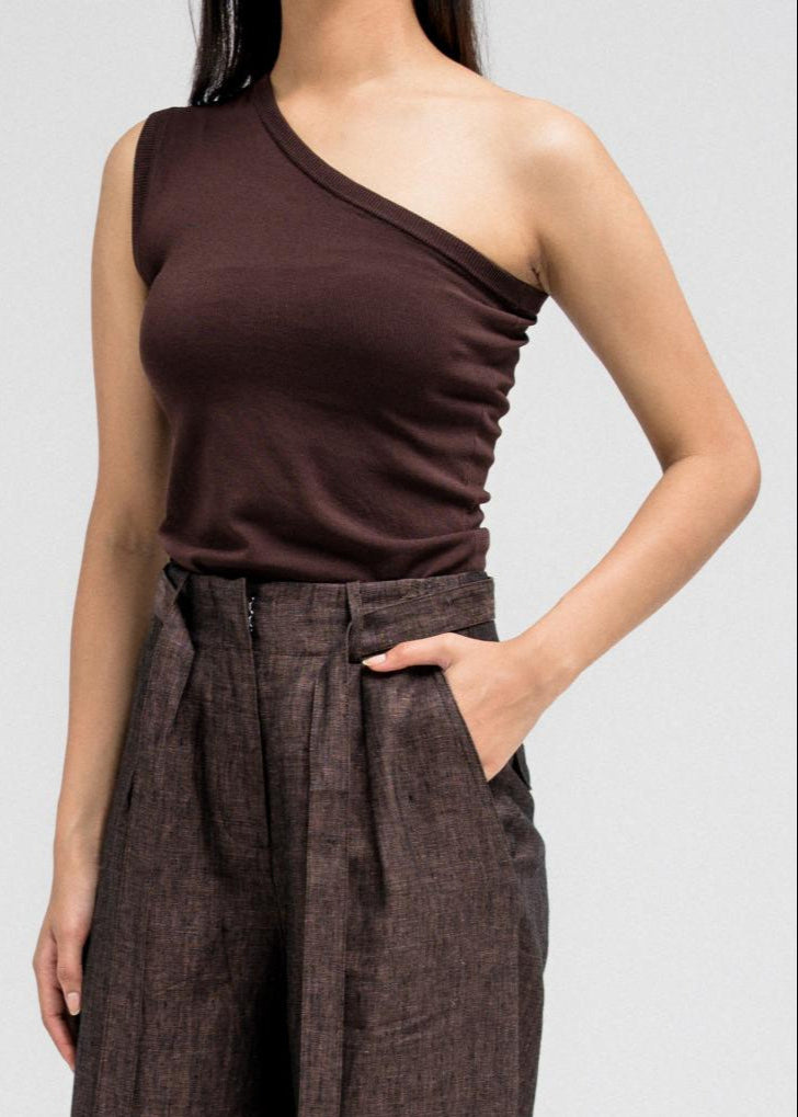 Minimal tank top made from soft, stretchy fabric for a comfortable fit. It features an asymmetrical neckline with one tank strap and one shoulder exposed, adding a modern edge to your look. Perfect for layering under blazers or jackets for a chic and effortless style.
