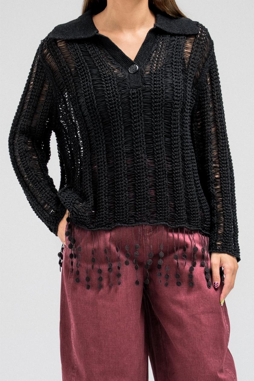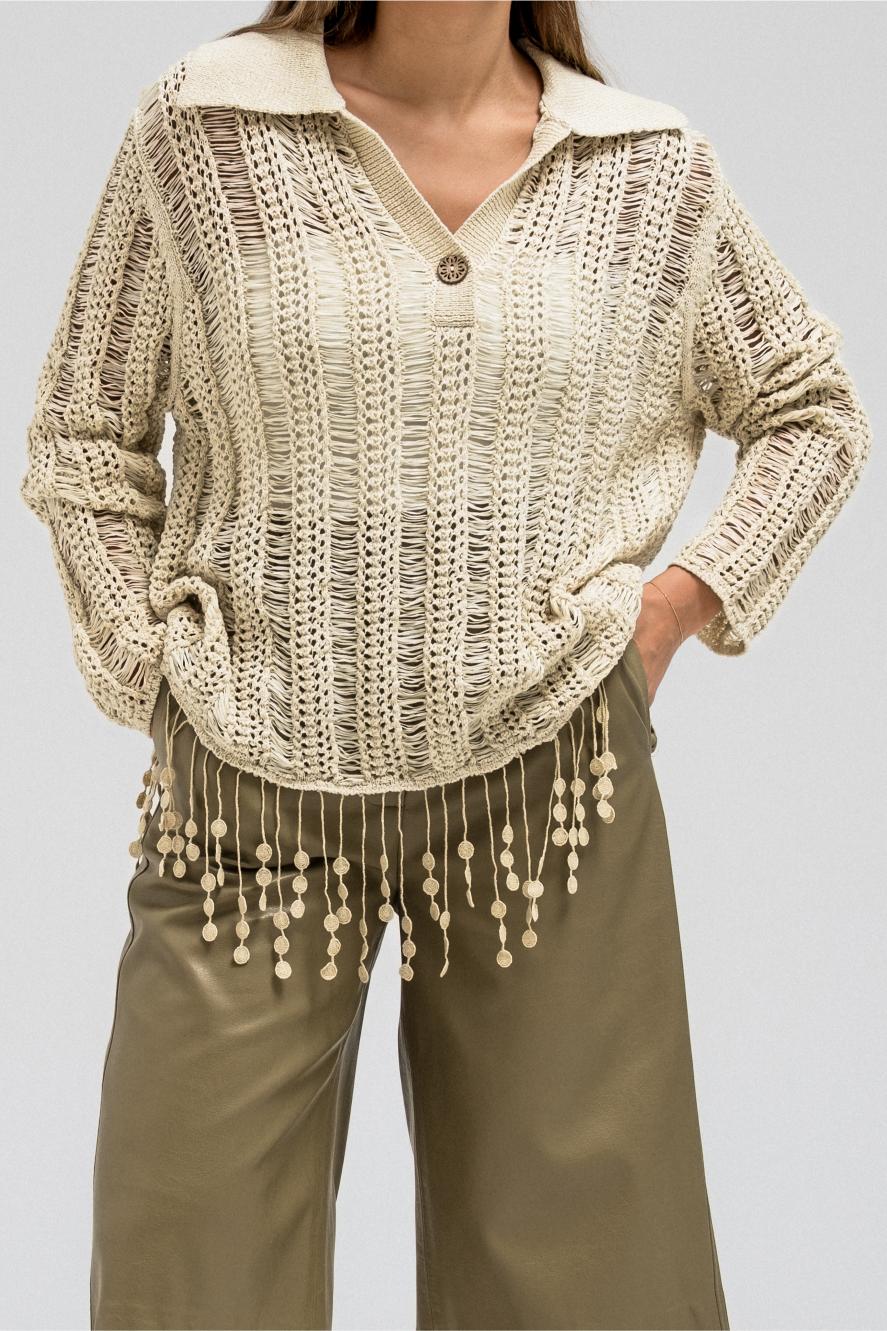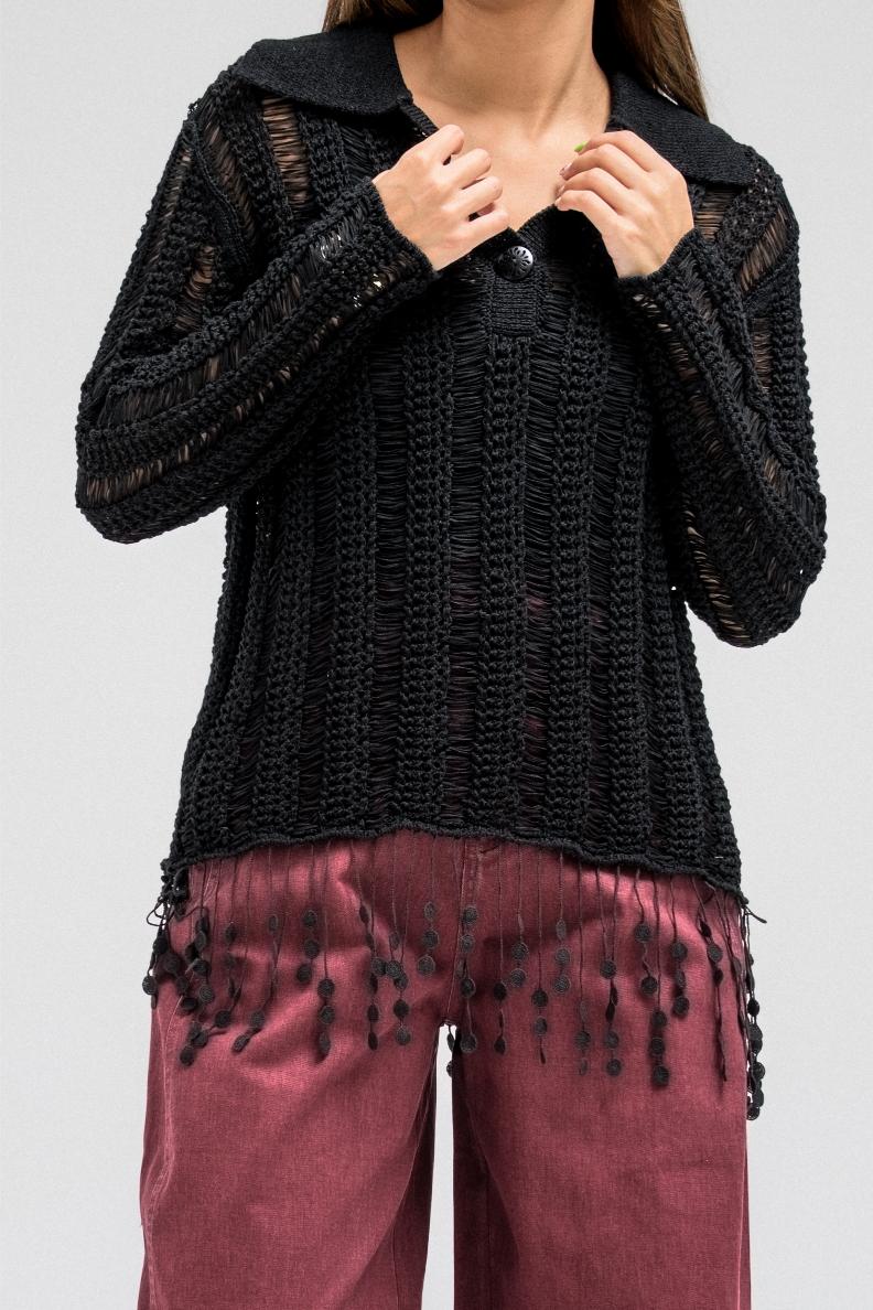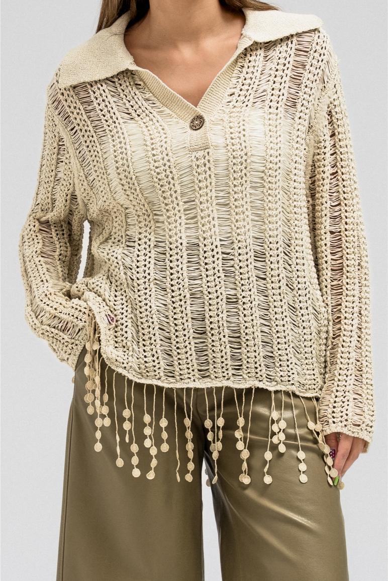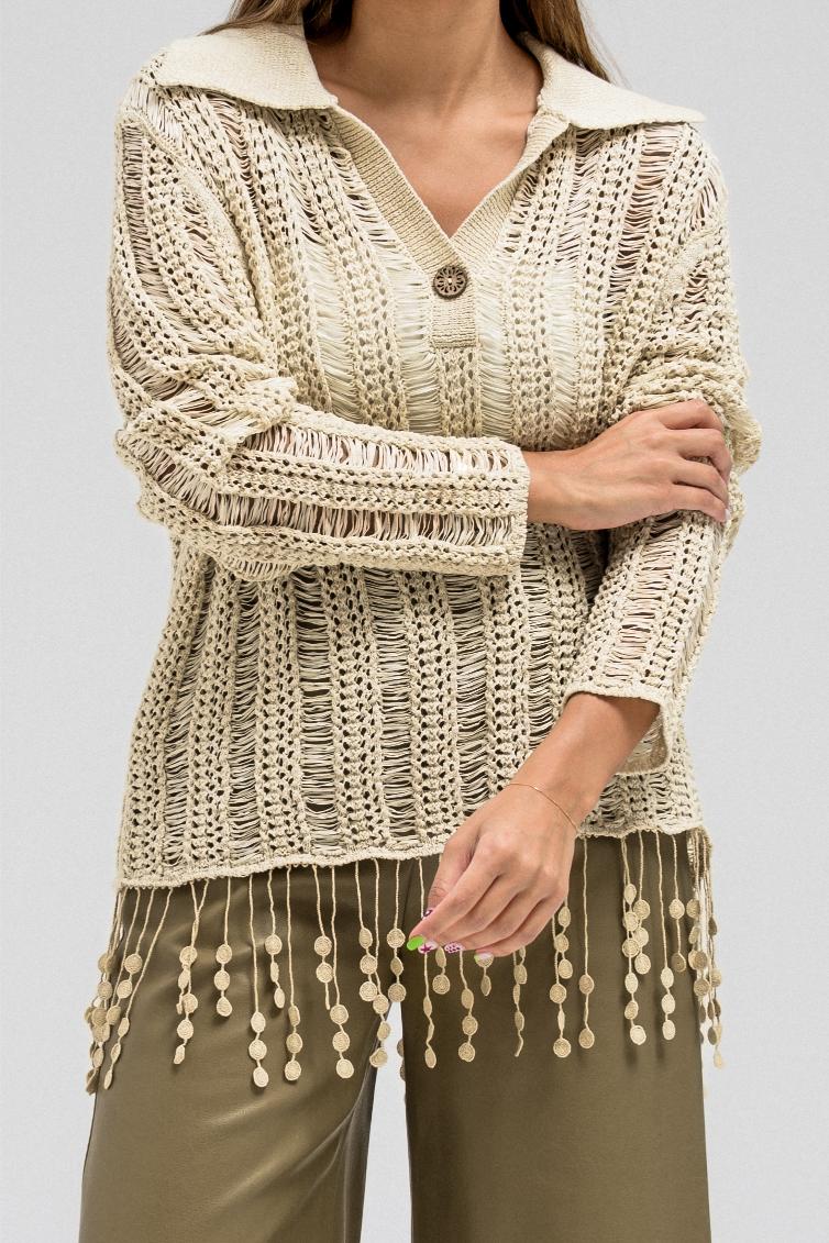 A delicate knit top designed with an open-weave texture that adds a soft, feminine touch. It features a classic collar with a front button closure and long sleeves. The hem is finished with playful fringe detailing, creating a relaxed yet elegant look that moves beautifully with every step.
