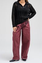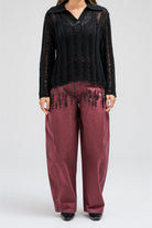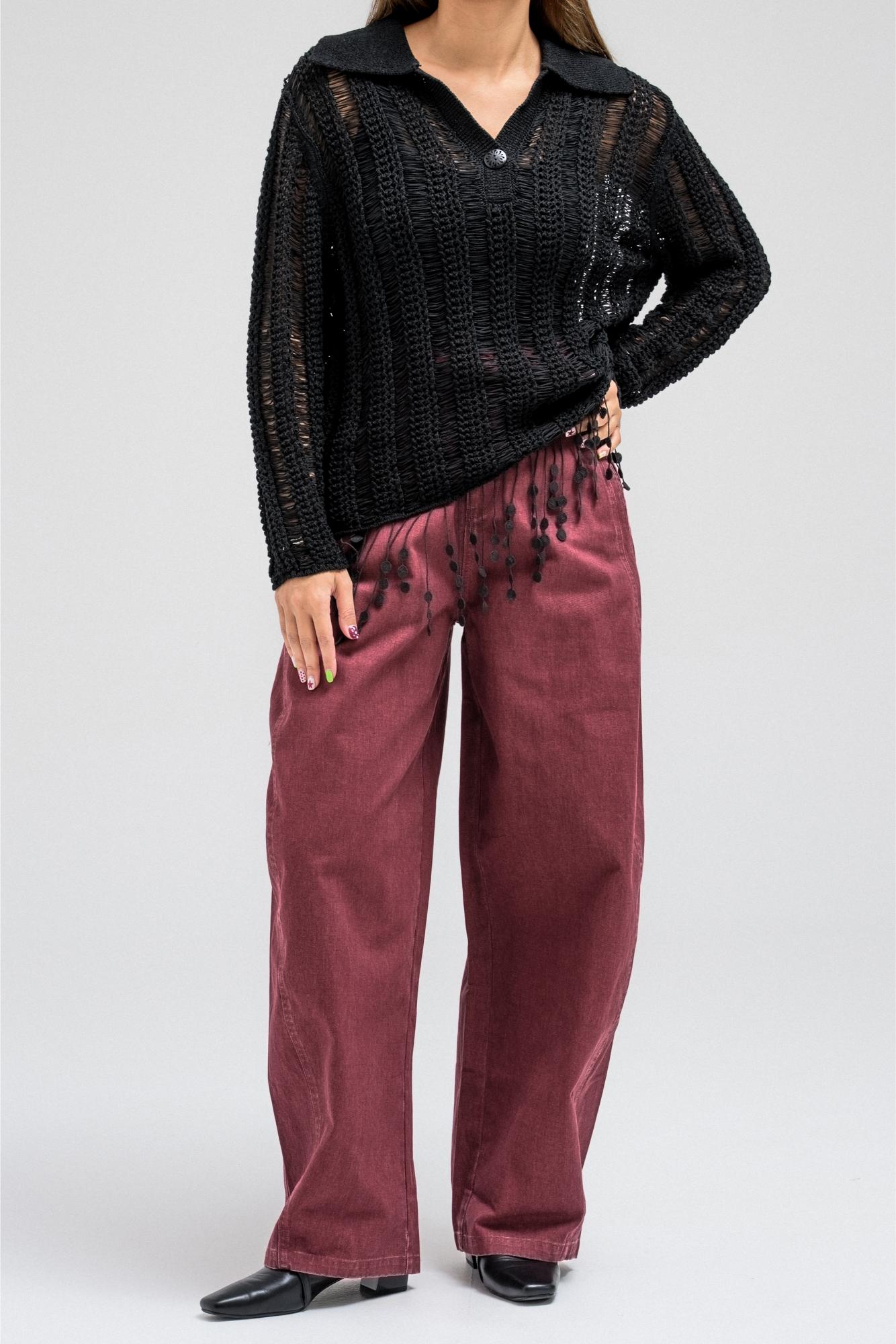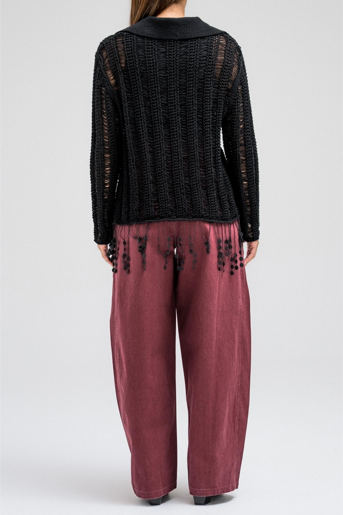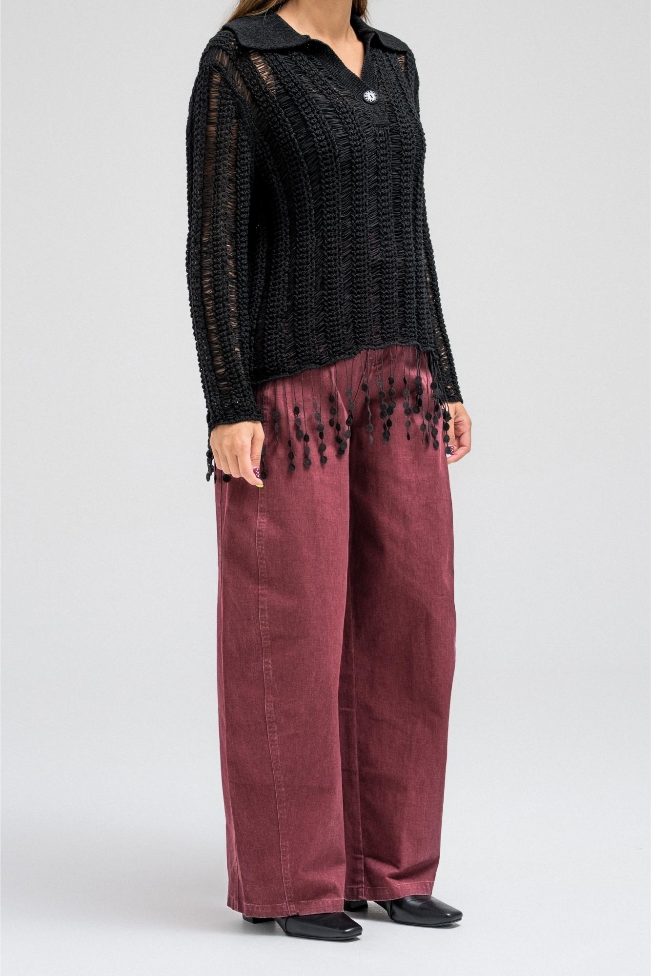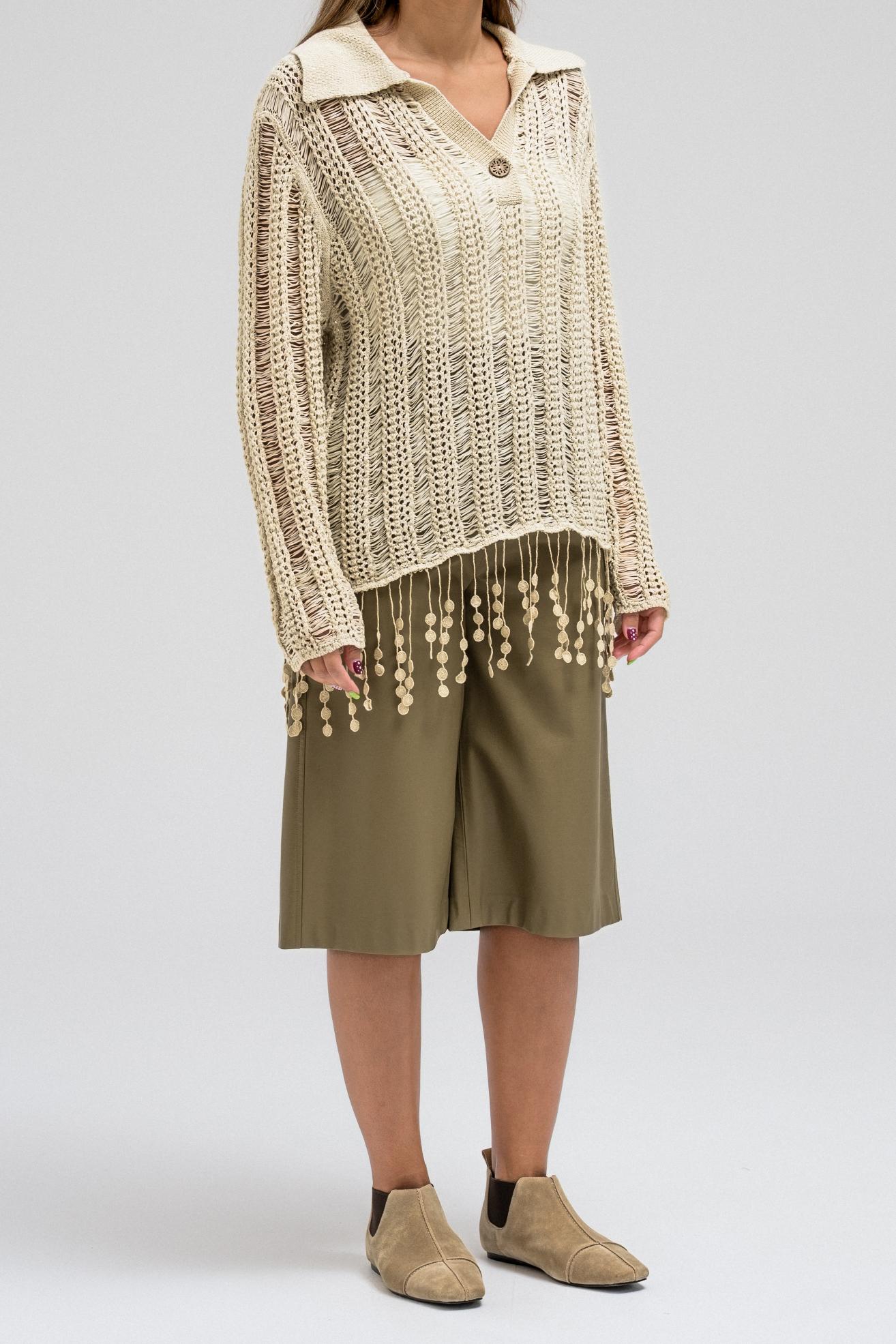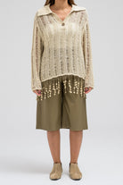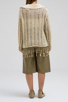 A delicate knit top designed with an open-weave texture that adds a soft, feminine touch. It features a classic collar with a front button closure and long sleeves. The hem is finished with playful fringe detailing, creating a relaxed yet elegant look that moves beautifully with every step.