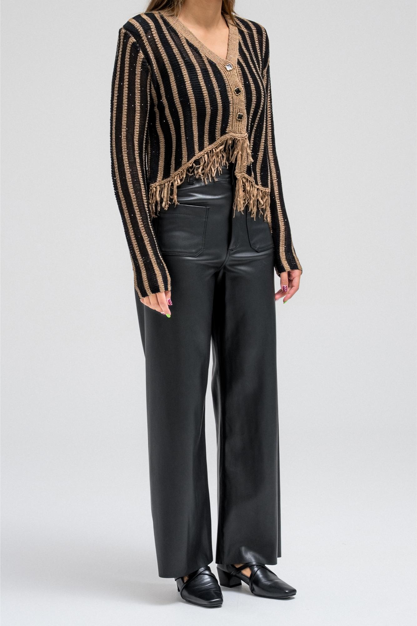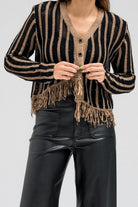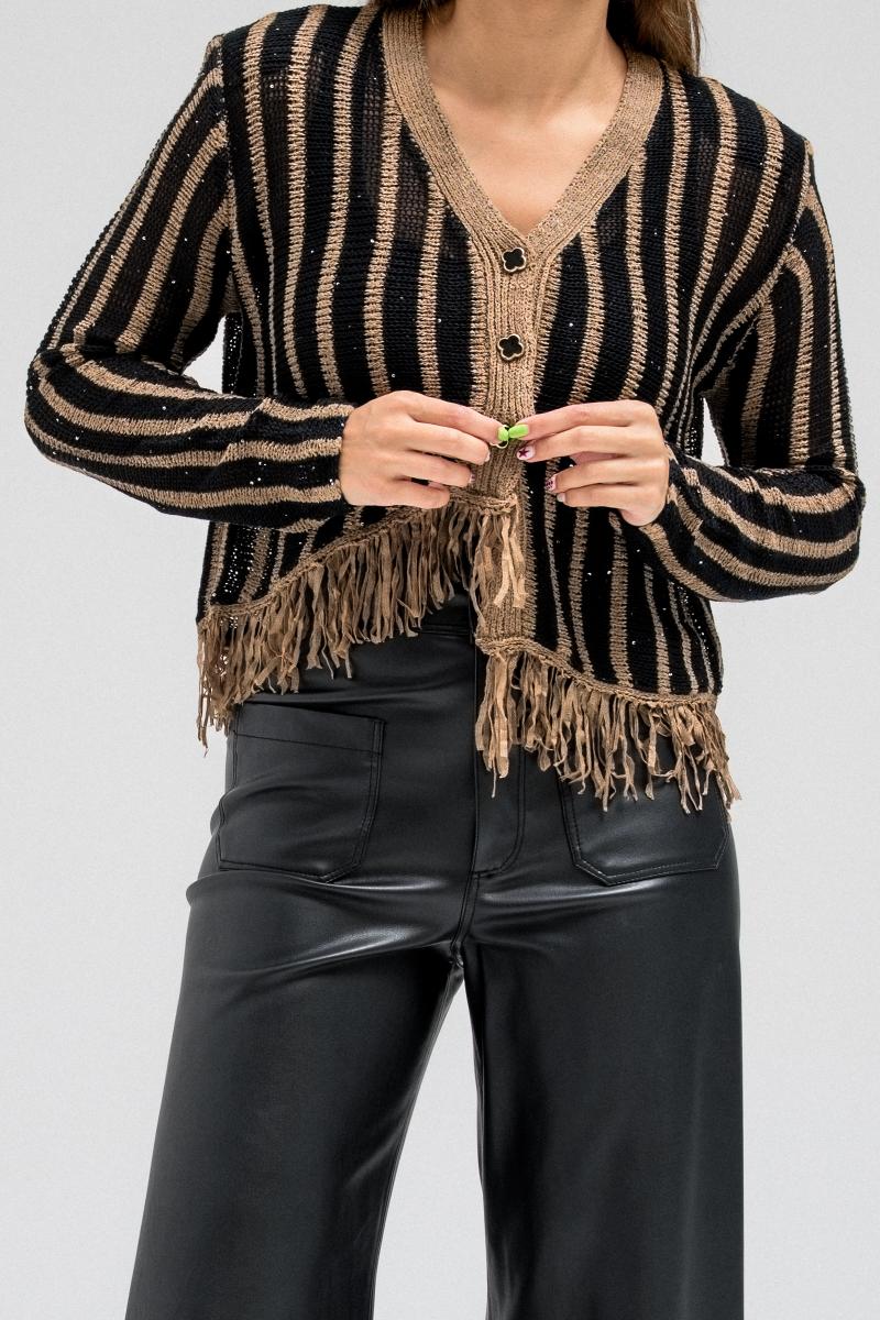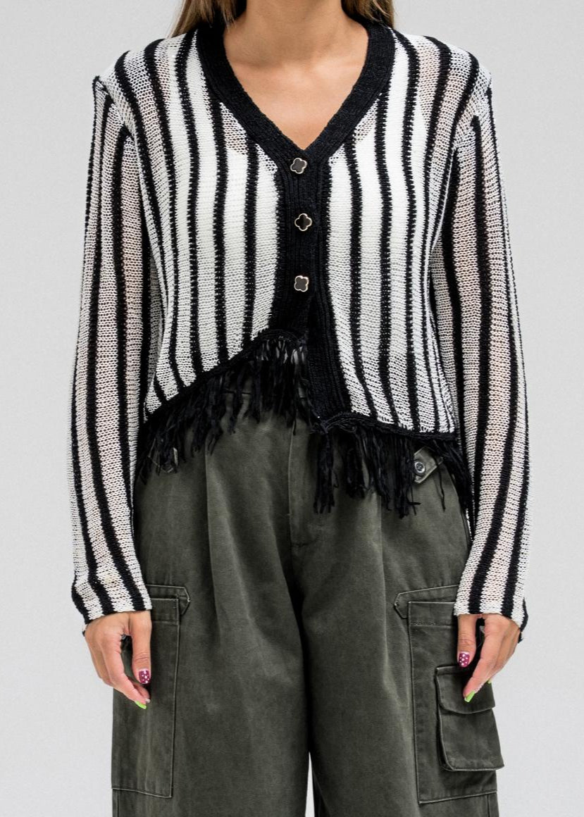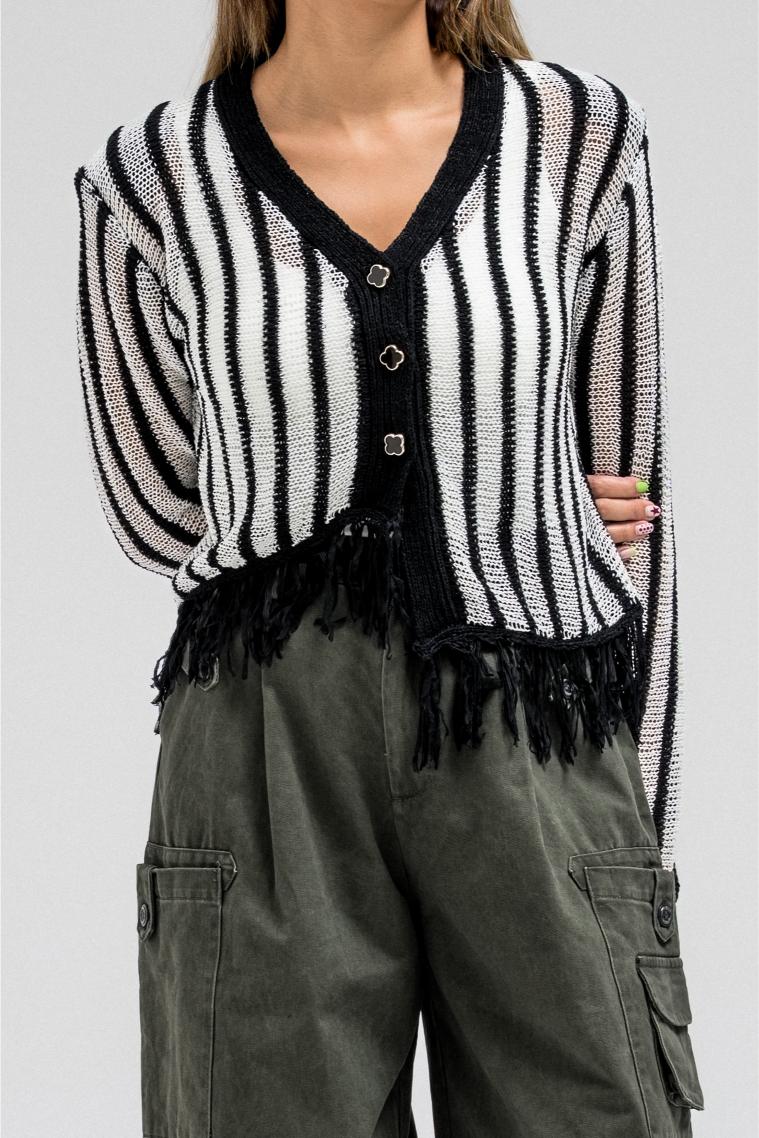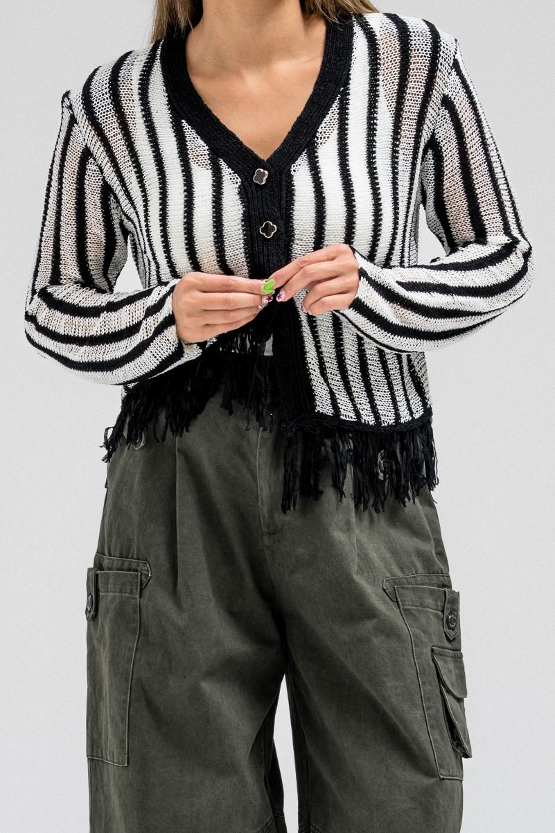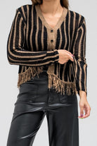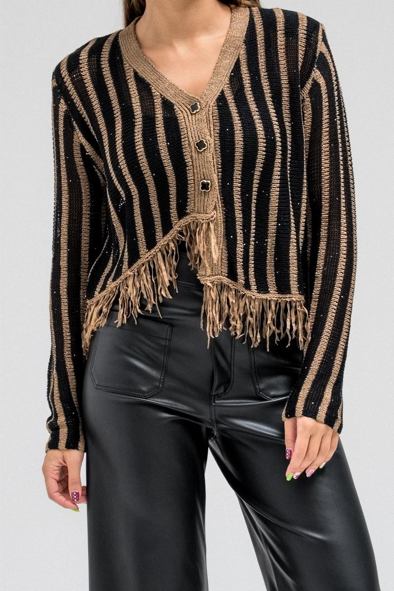 A stylish striped knit top featuring a soft textured fabric with a slight shimmer finish. Designed with a button-down closure and a flattering V-neckline, it brings an elegant yet modern touch to your look. The hemline is finished with a subtle fringe detail, adding movement and character to the piece.