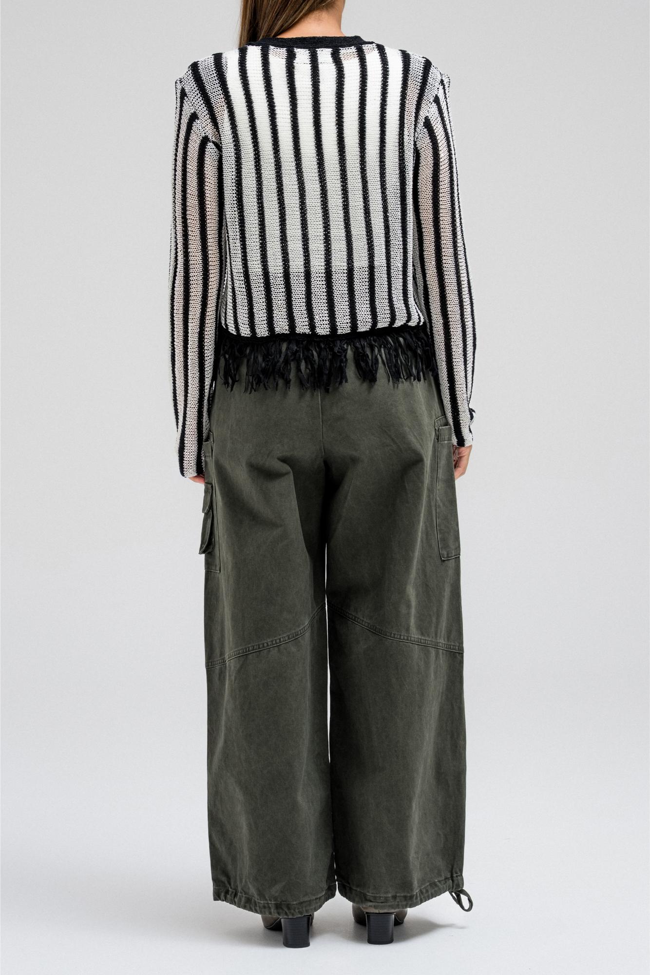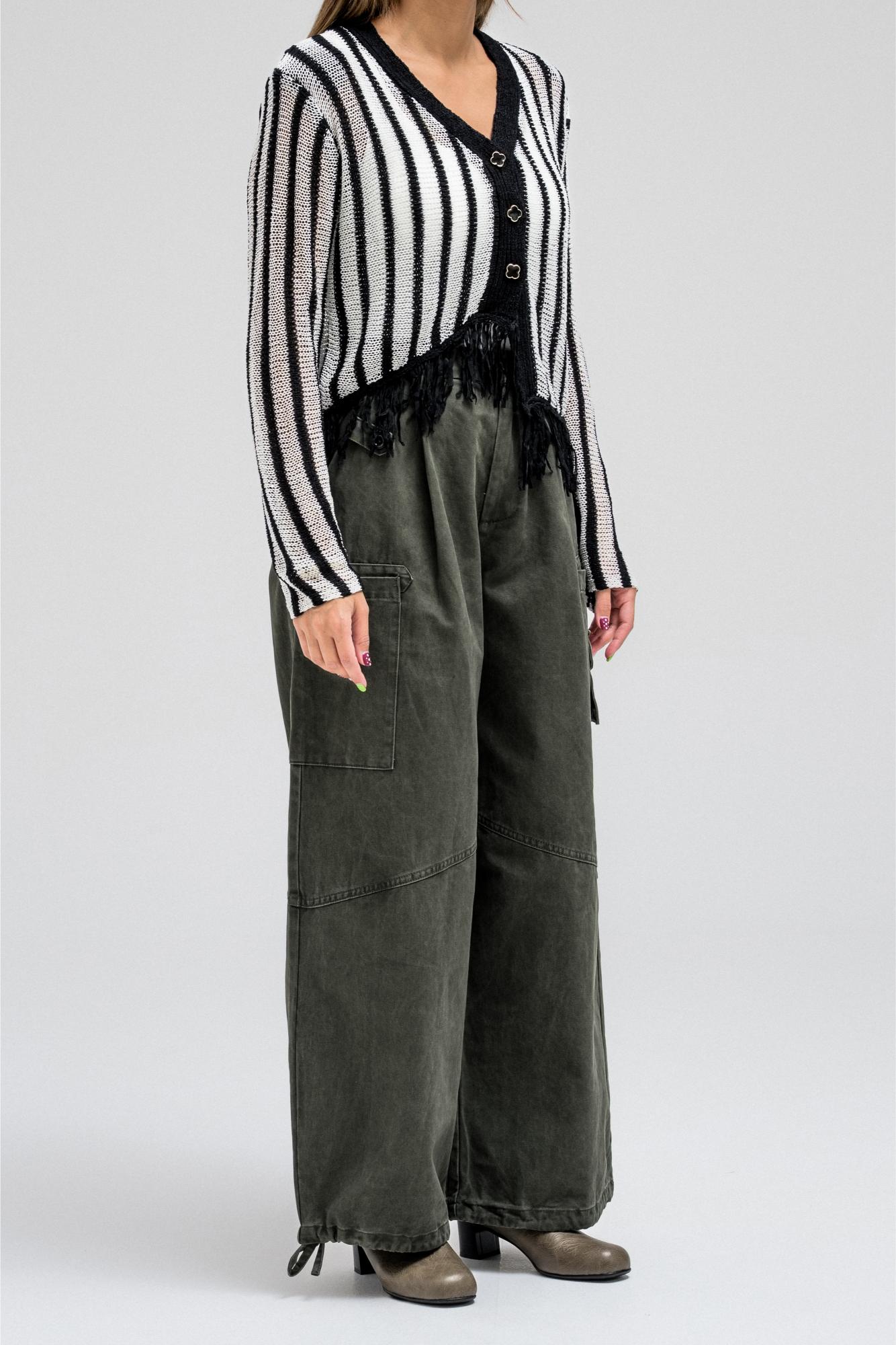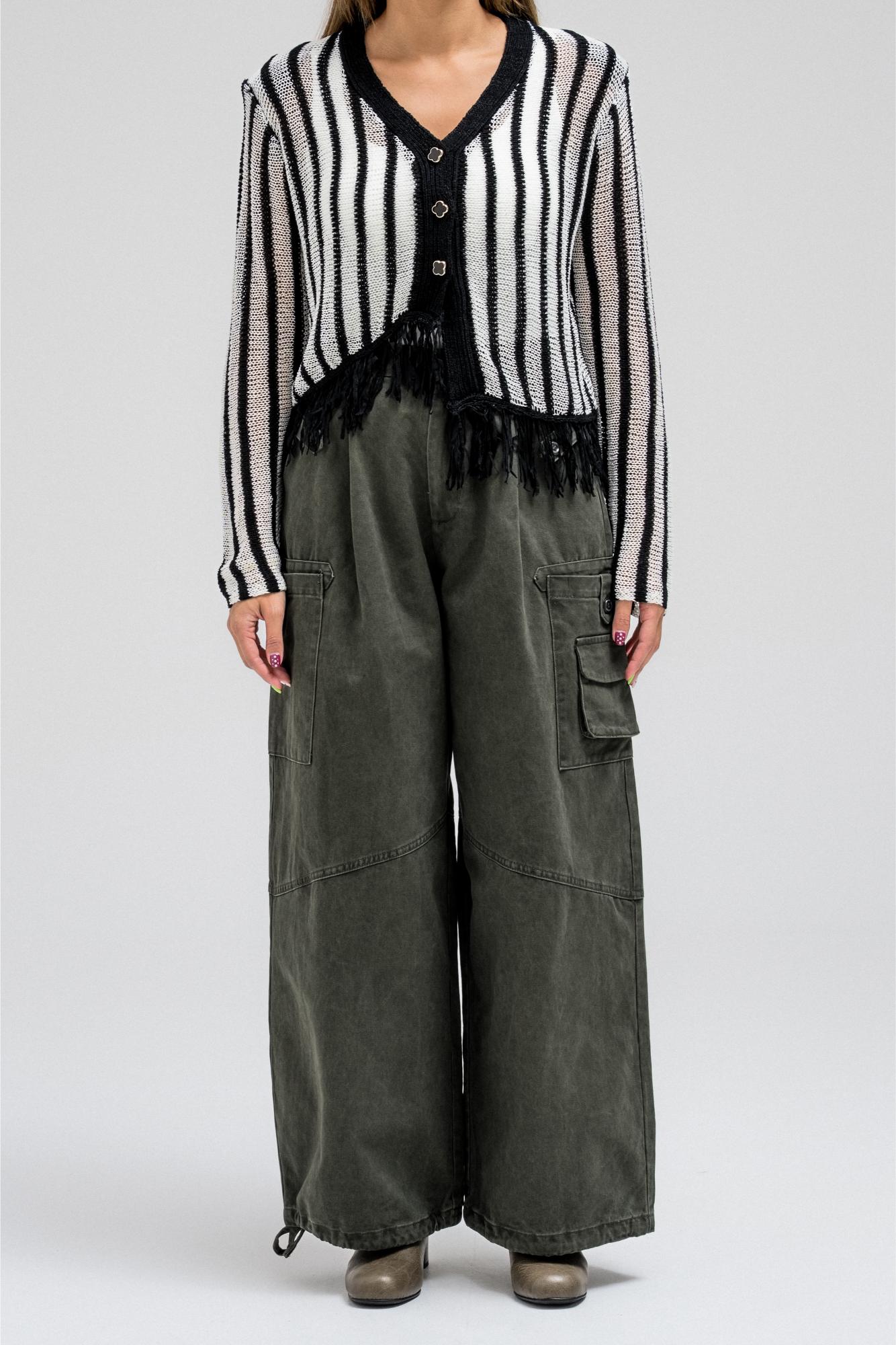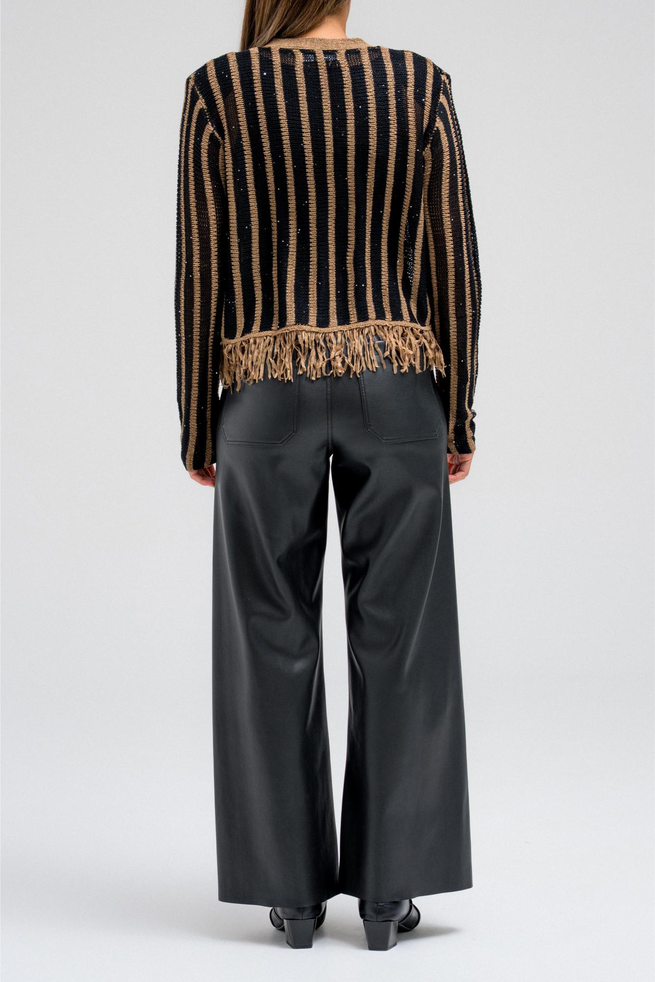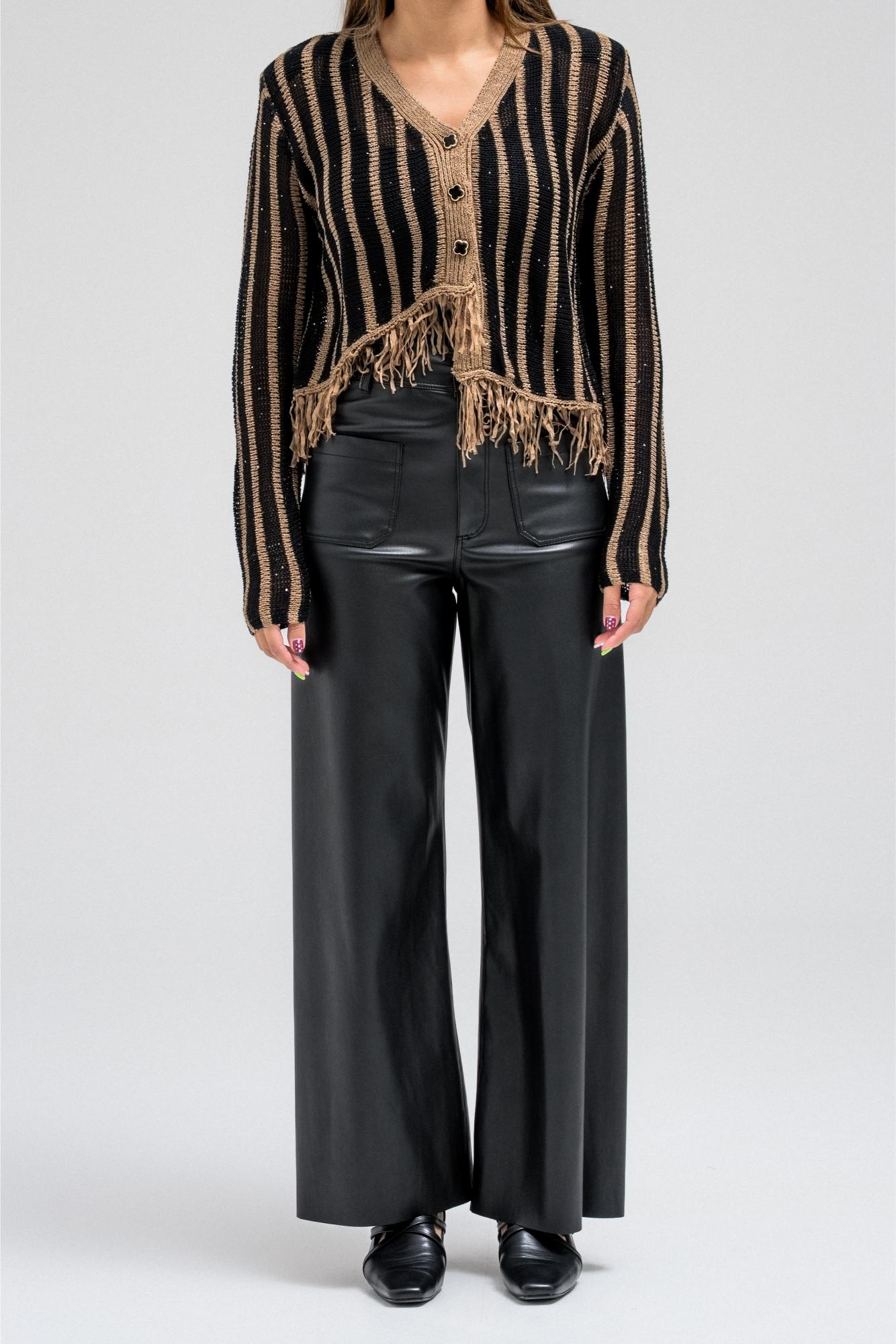 A stylish striped knit top featuring a soft textured fabric with a slight shimmer finish. Designed with a button-down closure and a flattering V-neckline, it brings an elegant yet modern touch to your look. The hemline is finished with a subtle fringe detail, adding movement and character to the piece.