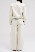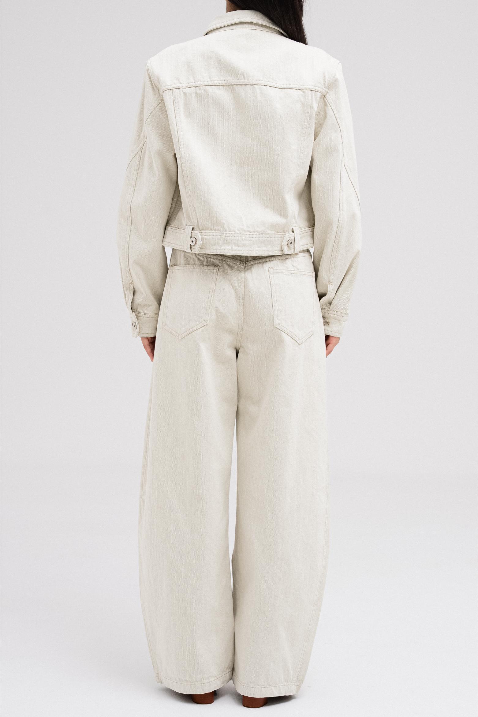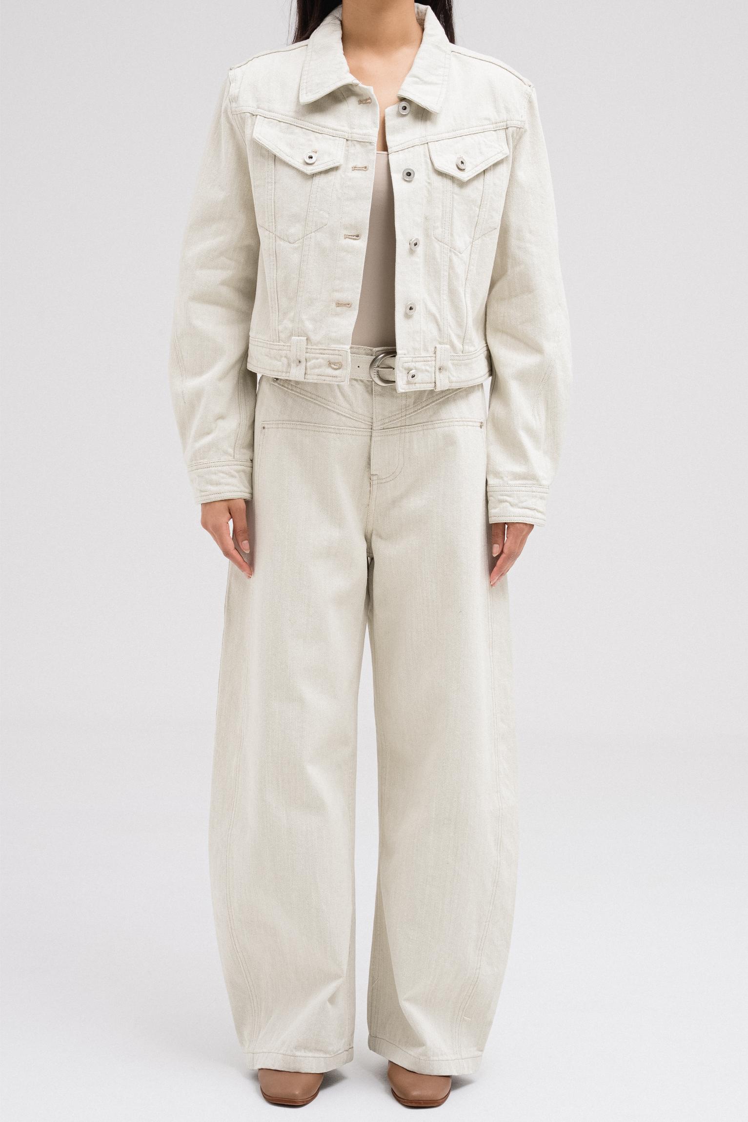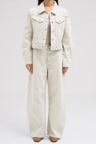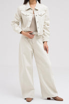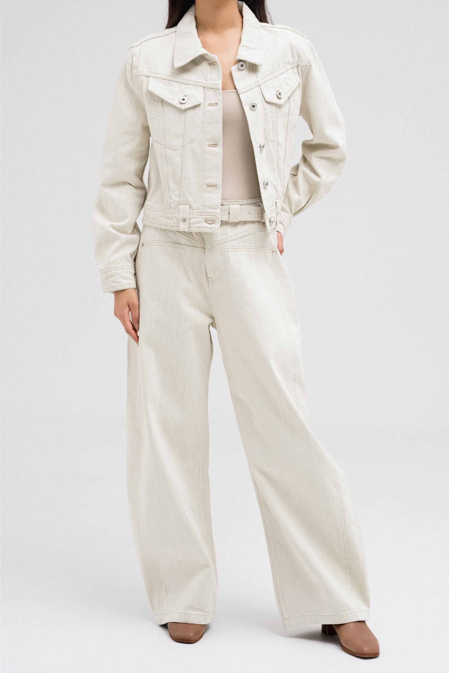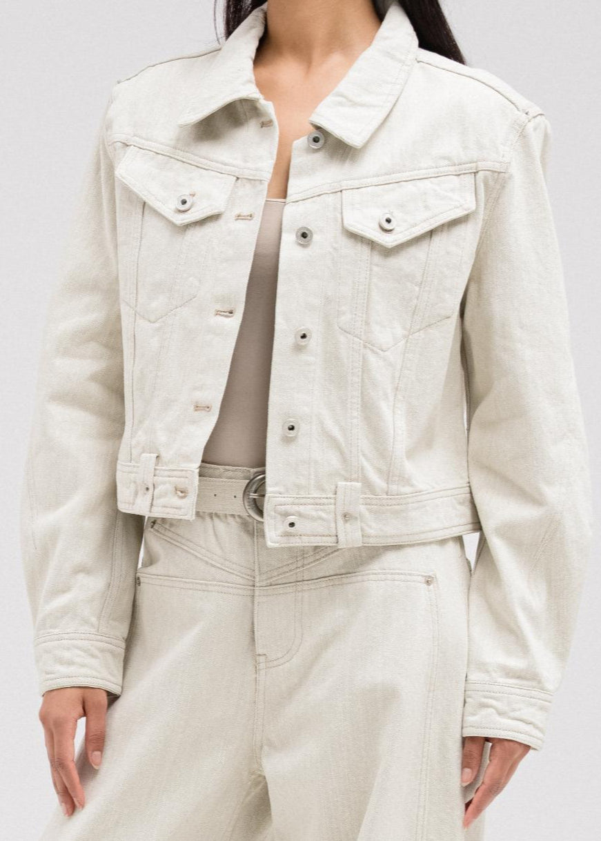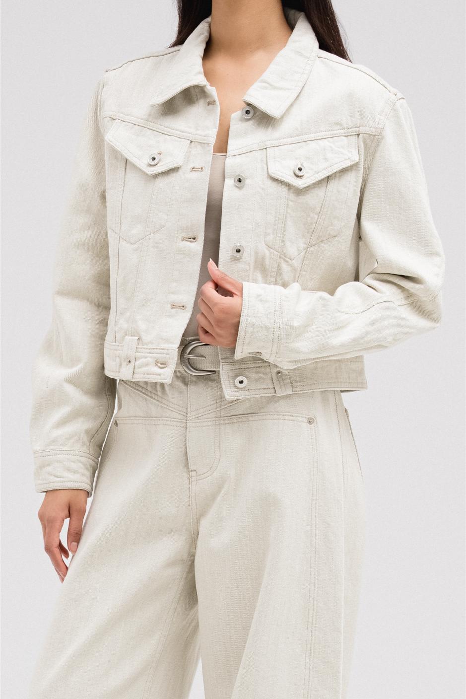 Cropped denim jacket features a structured collar, metallic button-down front closure, and flap pockets on the chest with matching buttons. The long sleeves are finished with buttoned cuffs. Can be paired with the matching denim pants for more of a coordinated look.