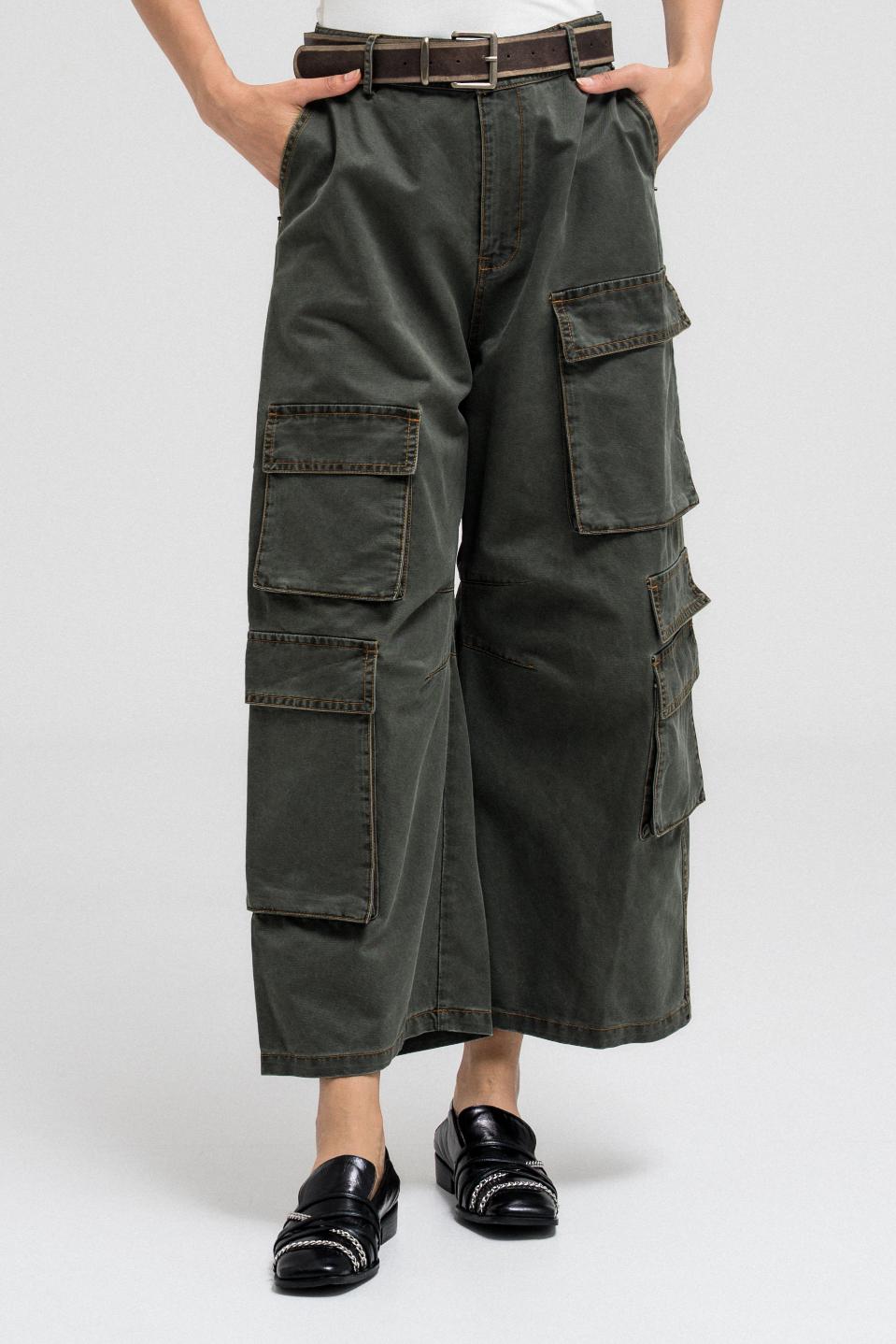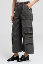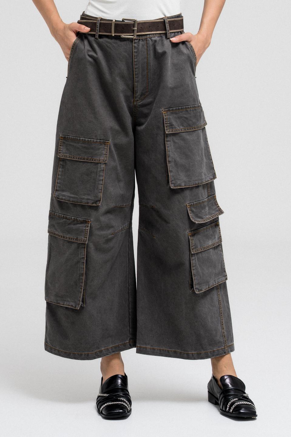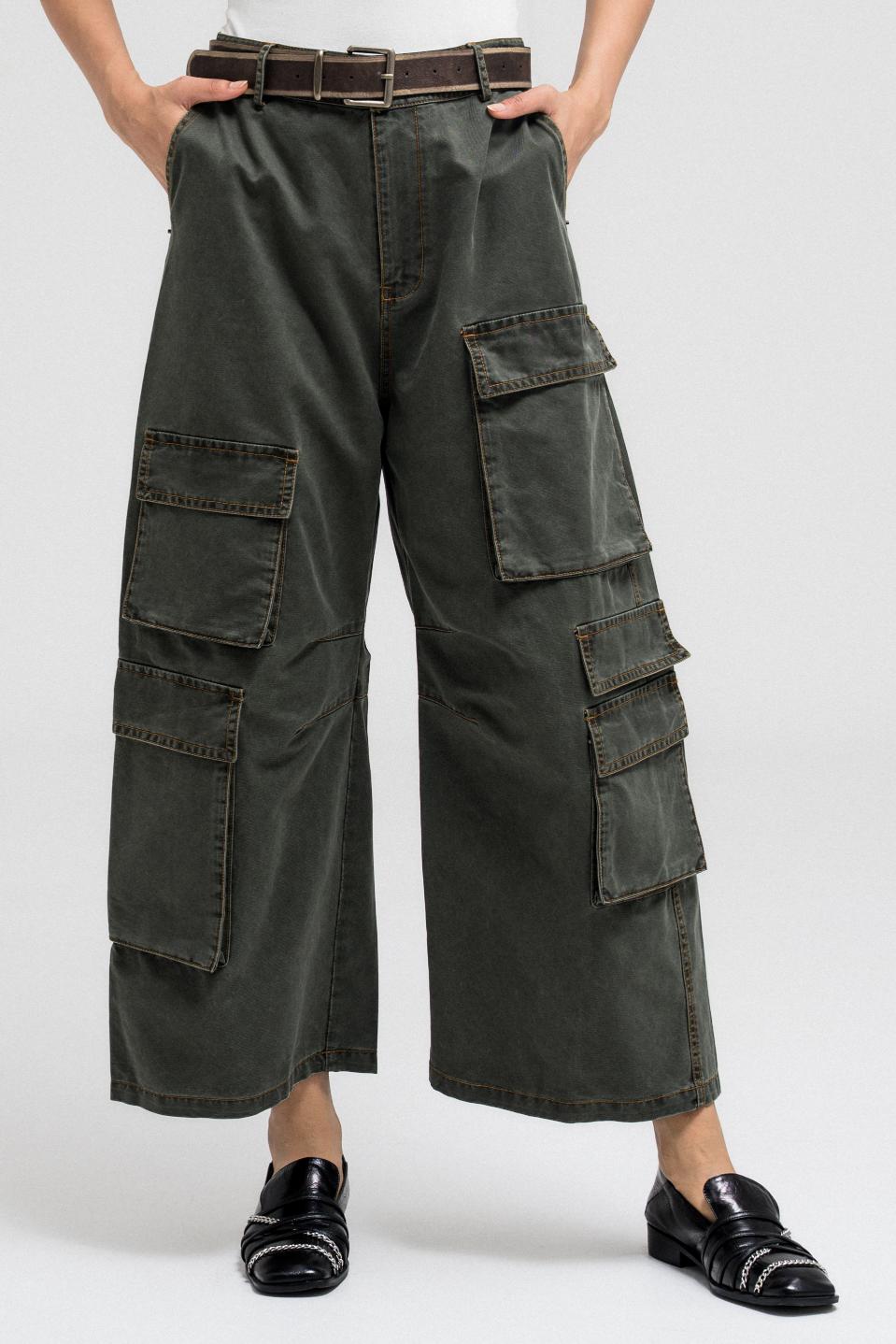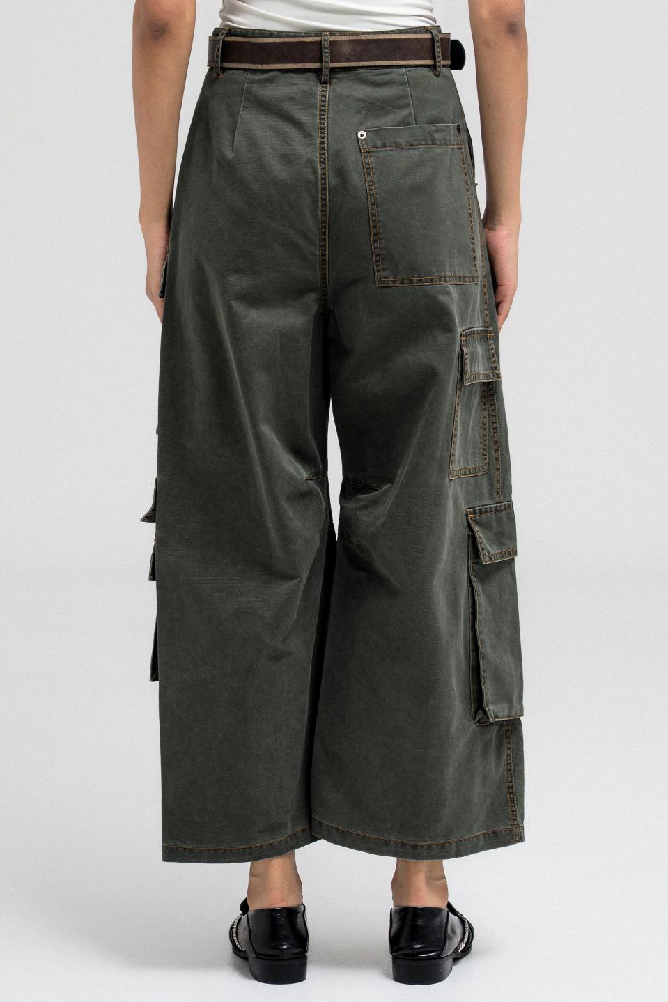 These wide-leg cargo-style pants feature multiple flap pockets on both legs for a bold, utilitarian look. Designed with side pockets for added functionality, they also include a matching belt with a metal buckle, a front button, and a zipper closure. A sturdy and stylish pick for everyday streetwear.