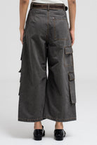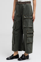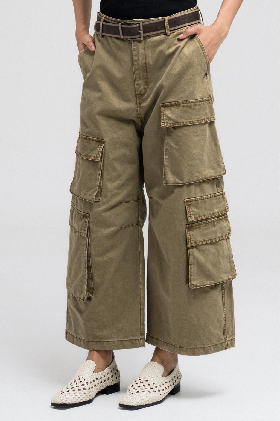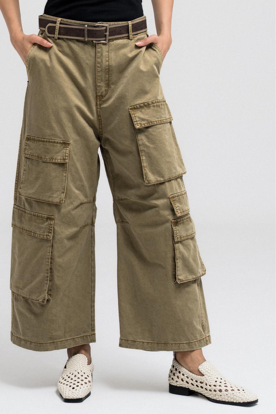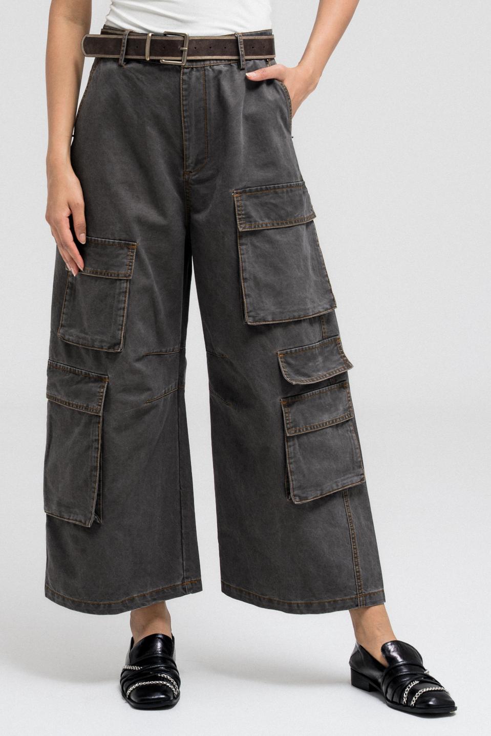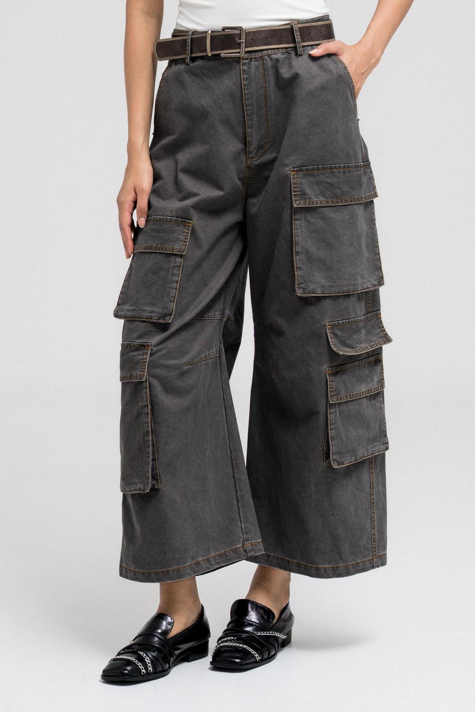 These wide-leg cargo-style pants feature multiple flap pockets on both legs for a bold, utilitarian look. Designed with side pockets for added functionality, they also include a matching belt with a metal buckle, a front button, and a zipper closure. A sturdy and stylish pick for everyday streetwear.