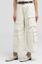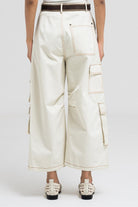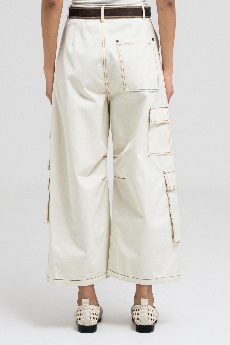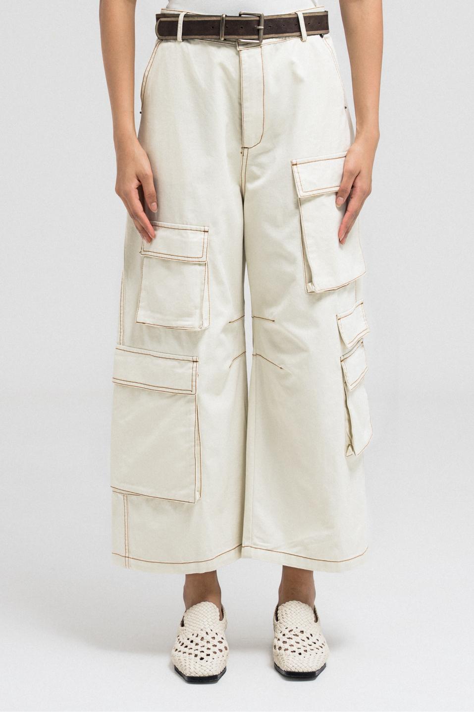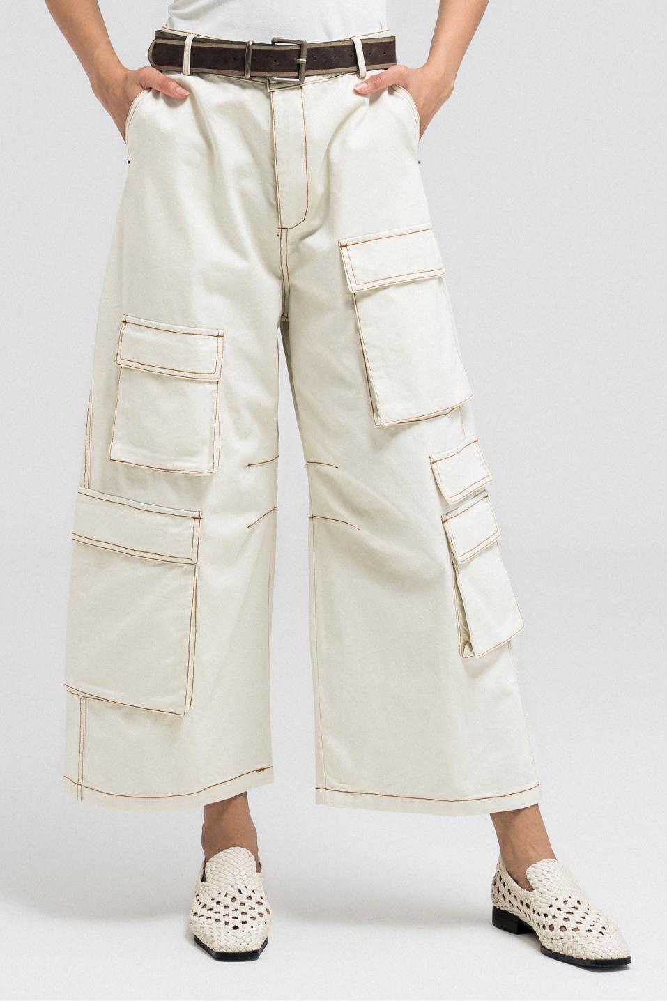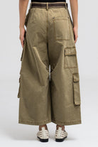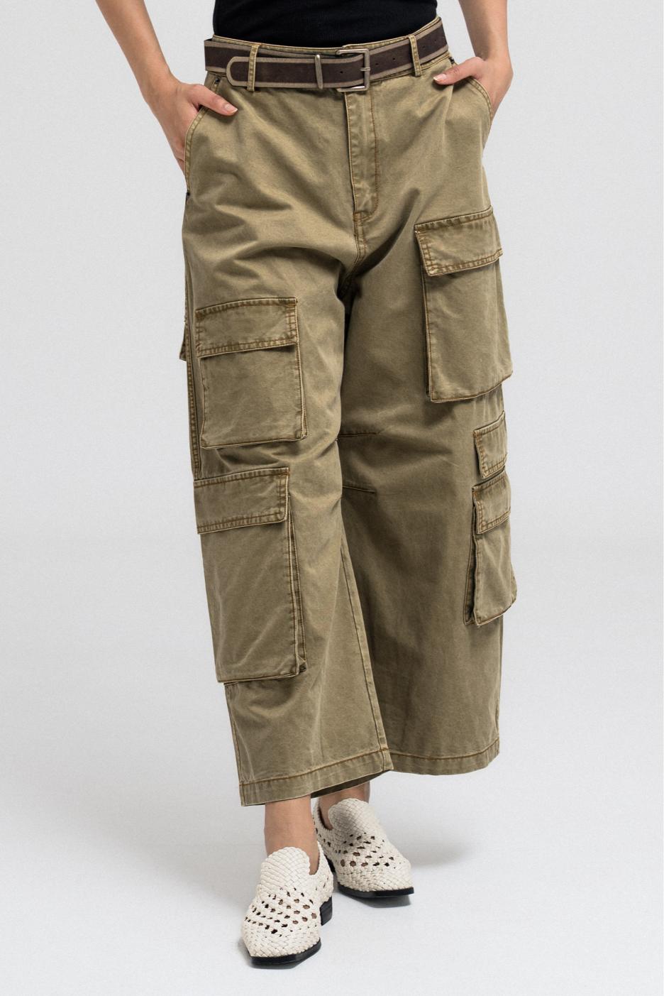 These wide-leg cargo-style pants feature multiple flap pockets on both legs for a bold, utilitarian look. Designed with side pockets for added functionality, they also include a matching belt with a metal buckle, a front button, and a zipper closure. A sturdy and stylish pick for everyday streetwear.