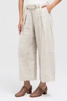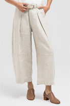 Wide-leg linen pants featuring side pockets, front button and zipper closure. Designed with pleated details and includes a matching lace-up belt with a metal buckle for added style. Perfect for pairing with the matching vest or your favorite summer linen tops.