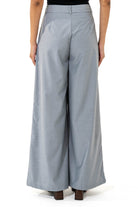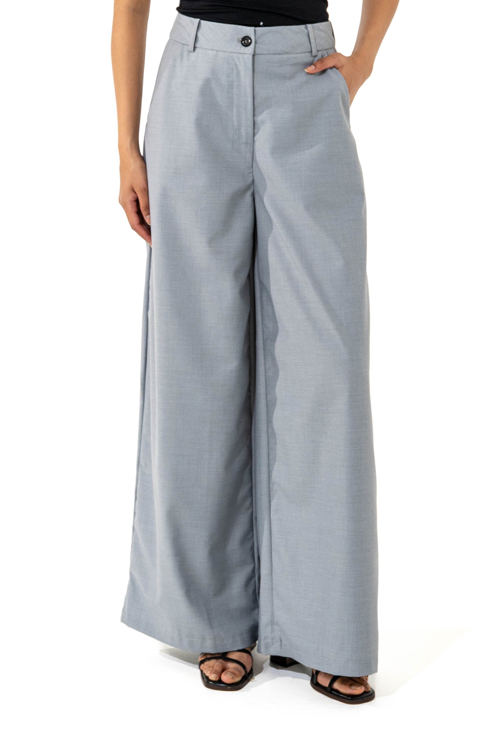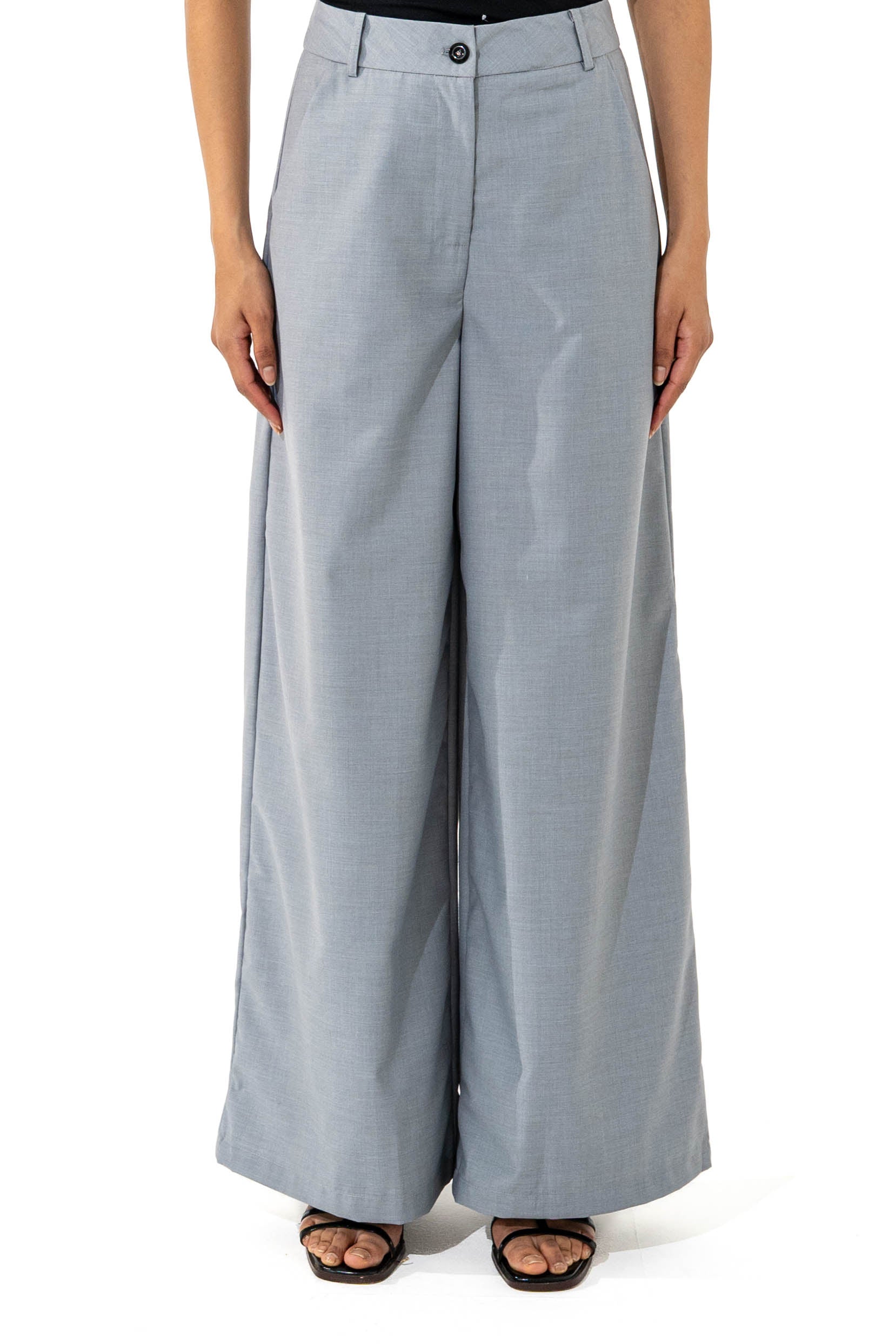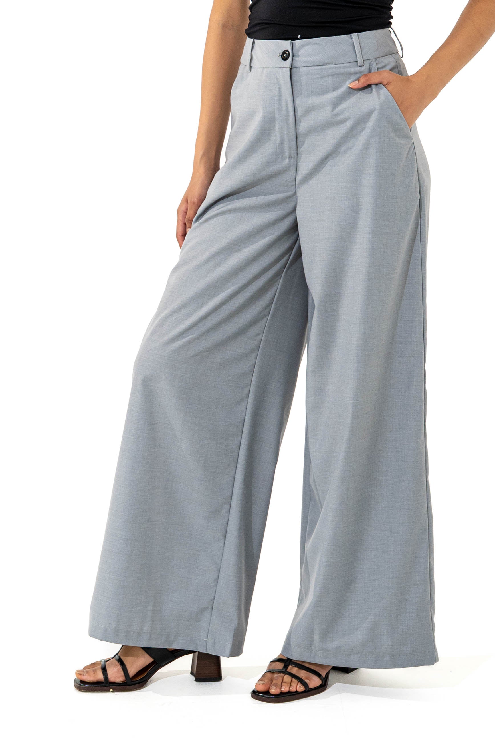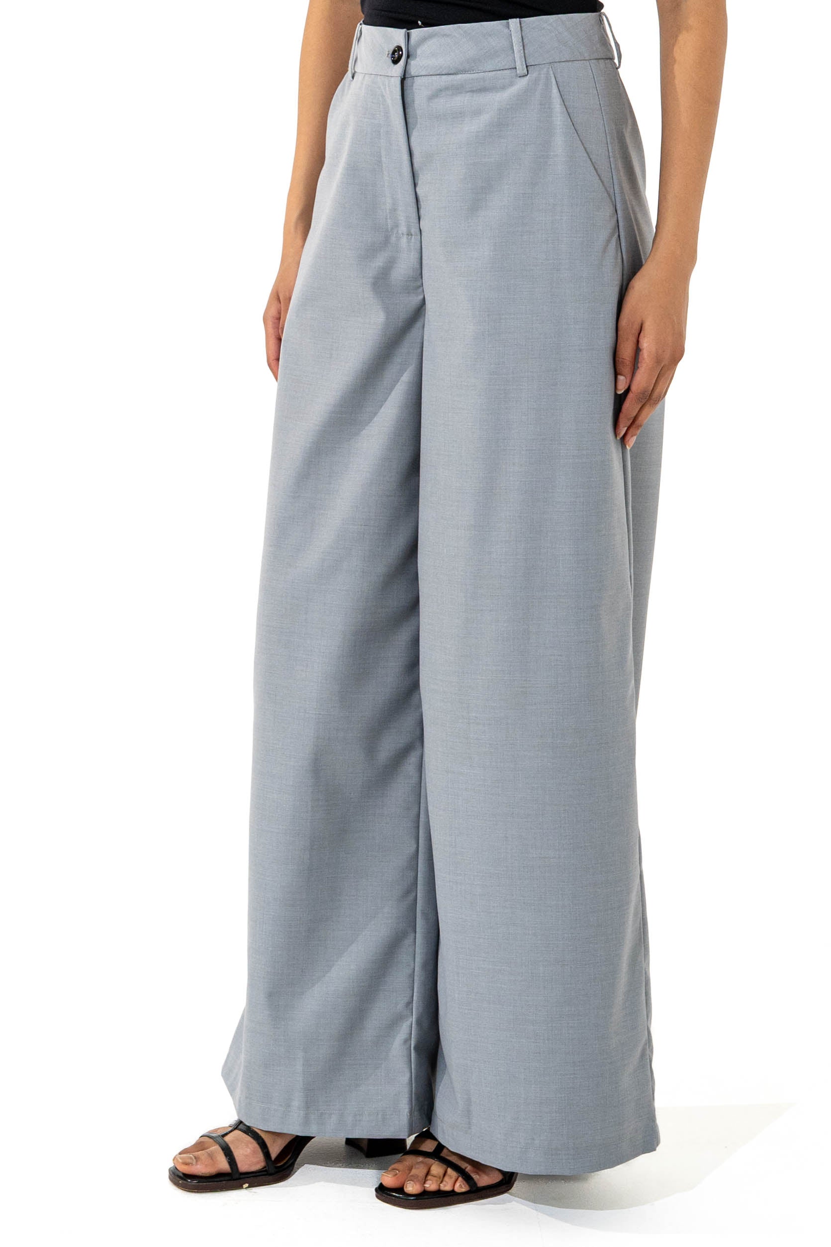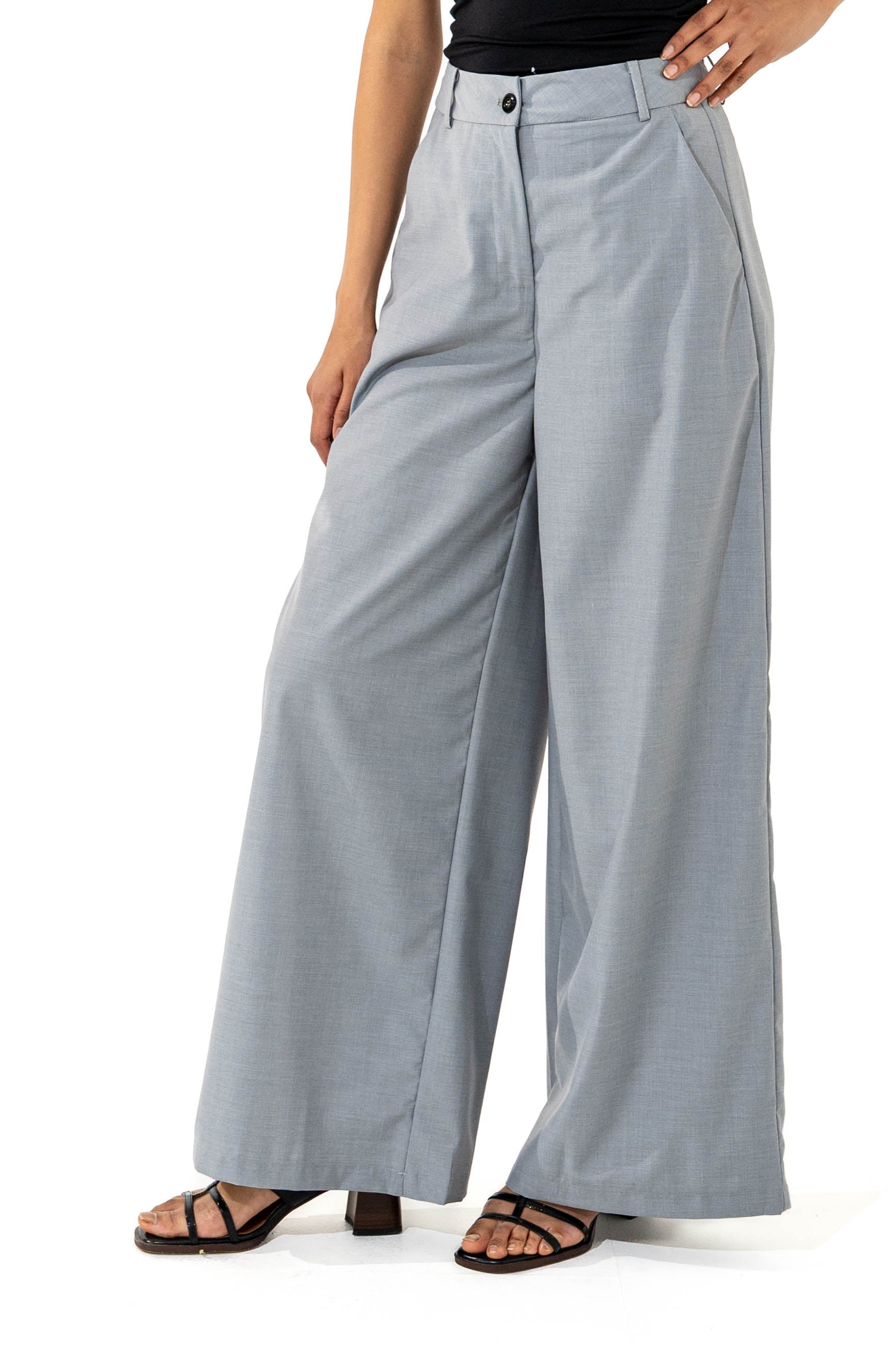 Wide-leg pants. Front button. Zip closure.