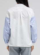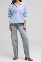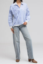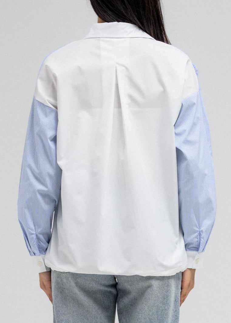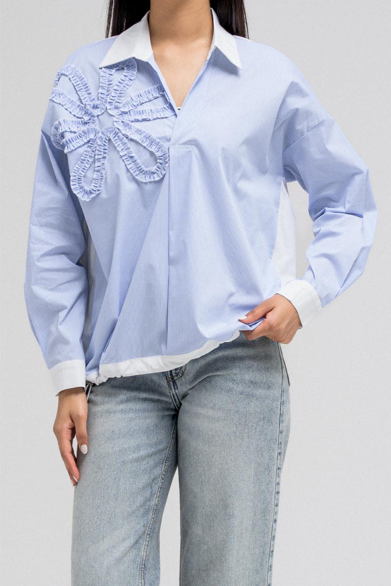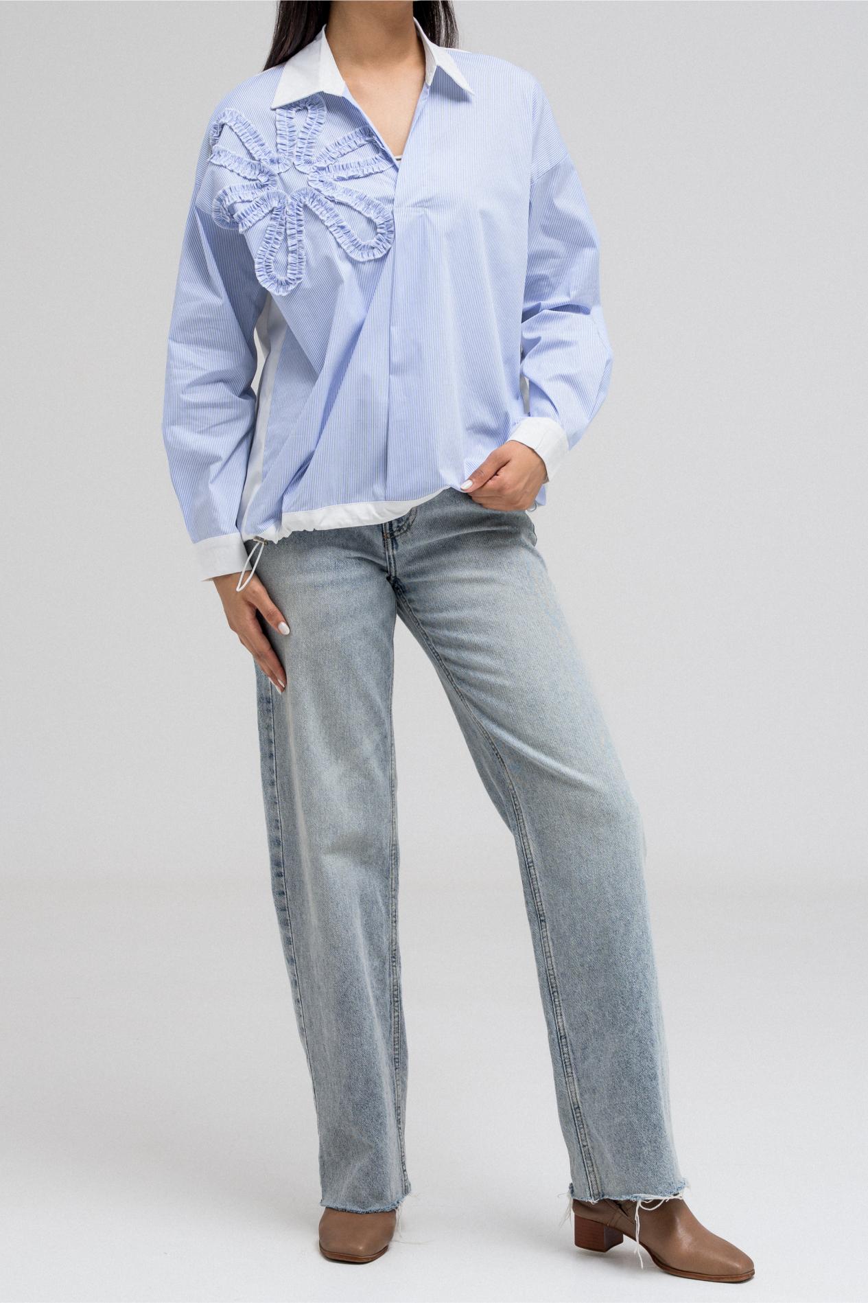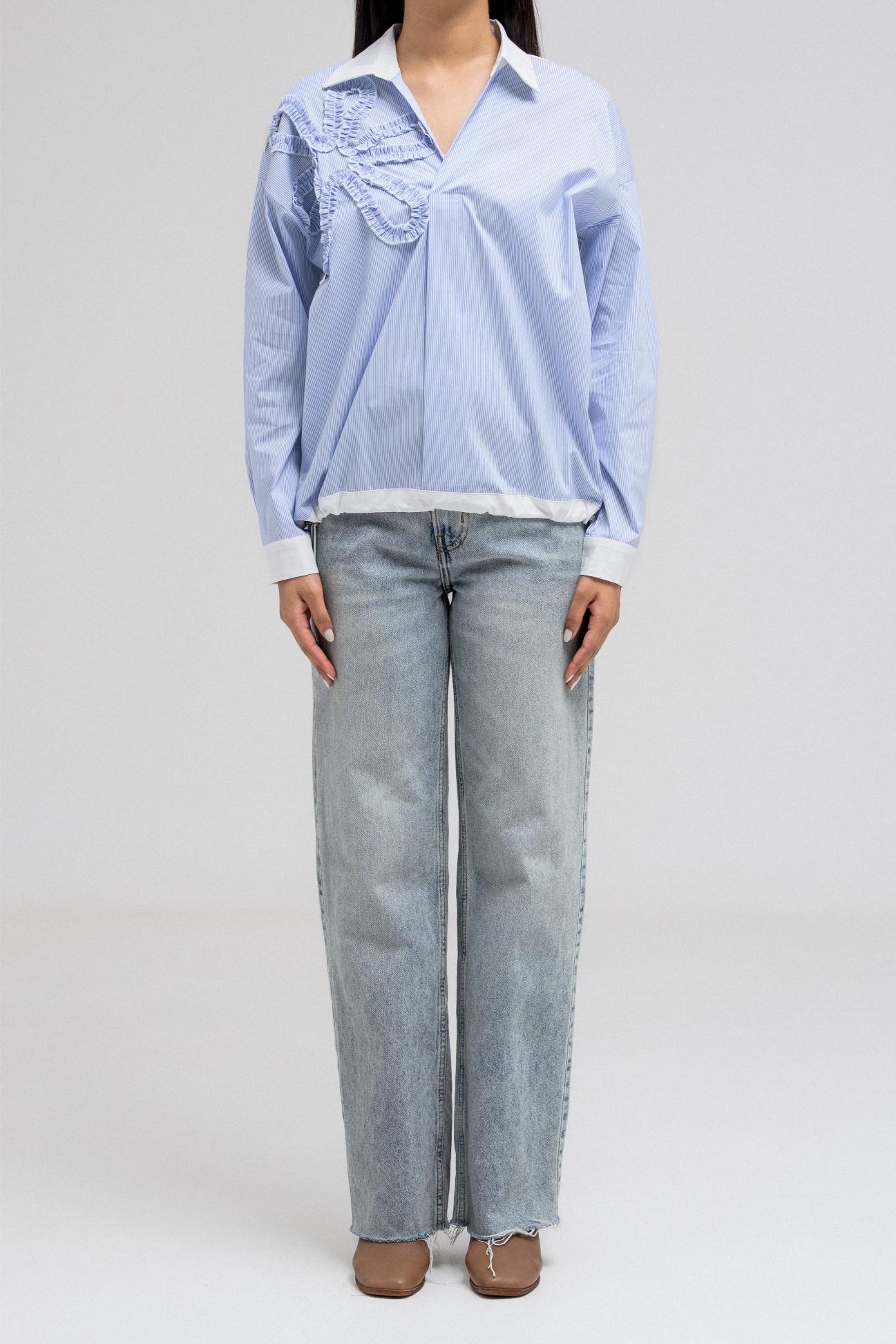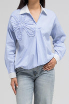 This top features a very light and breathable fabric with a delicate striped pattern on the front, complemented by a unique floral beaded design on one side. It has a classic white contrast collar and cuffs for a polished look. The back is plain for a clean finish. The hem includes adjustable drawstrings, allowing you to customize the silhouette to your liking.