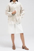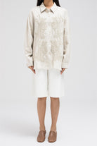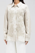 Crafted from lightweight linen, this long-sleeve shirt features a classic collar and front button closure. The standout detail is the intricate beaded embroidery in a floral design across the front, adding a refined and elegant touch.