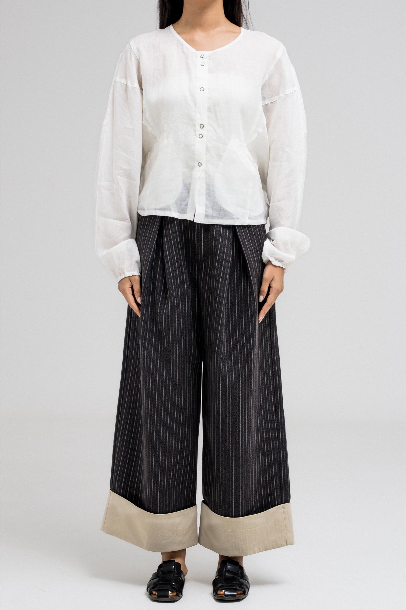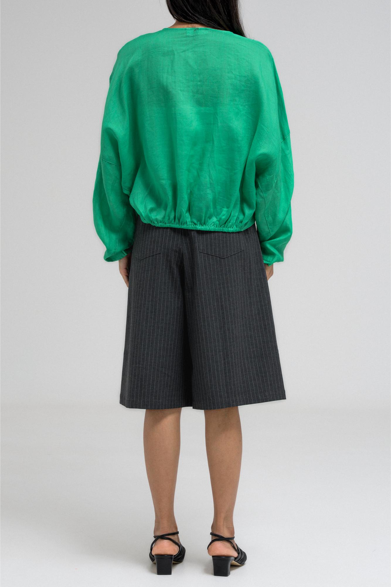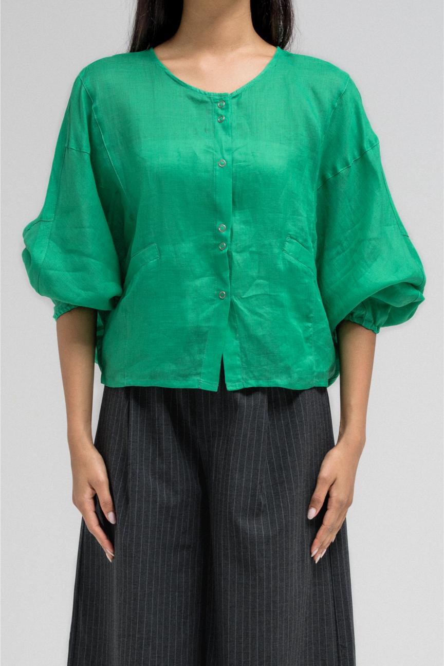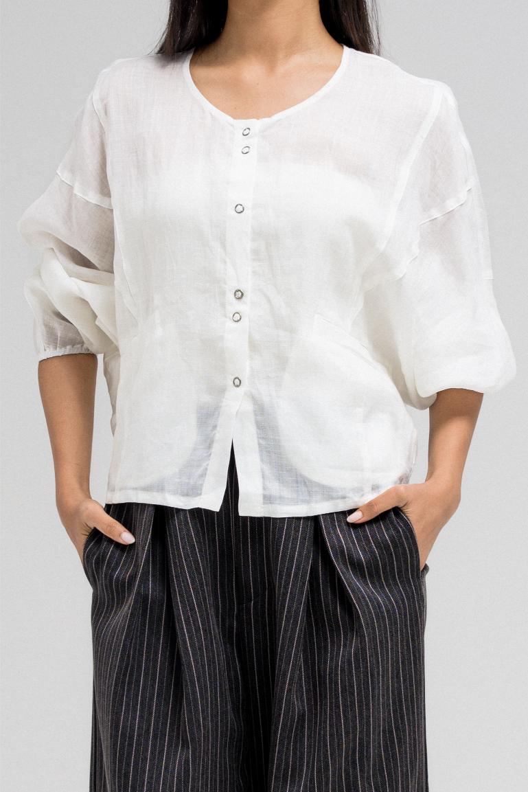 Made from airy, semi-sheer linen-blend fabric, this relaxed top features an elasticated hem and cuffs that create a soft, gathered silhouette. It has a round neckline, front button closure, and practical side pockets.