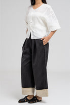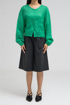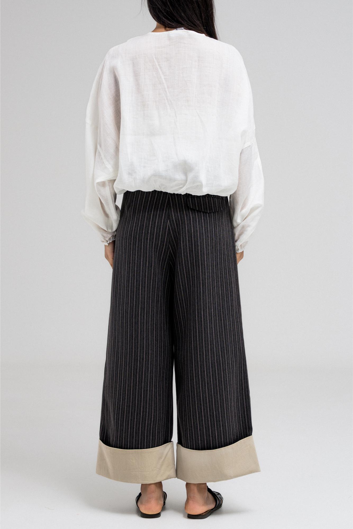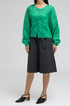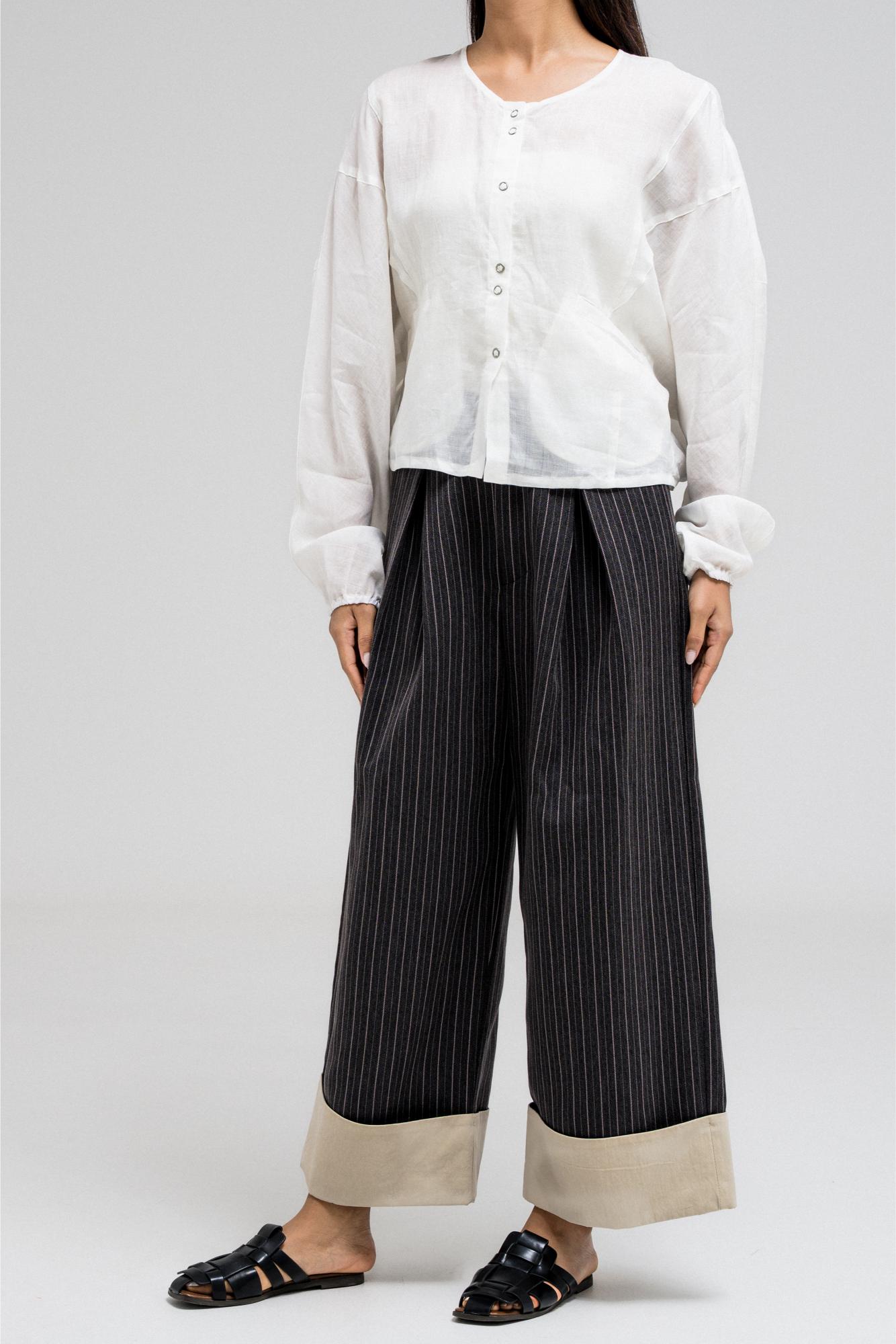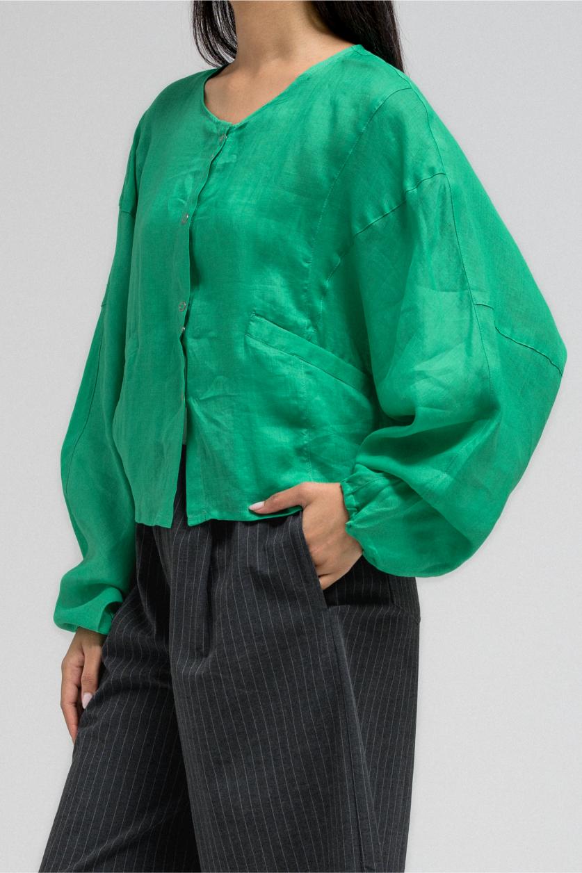 Made from airy, semi-sheer linen-blend fabric, this relaxed top features an elasticated hem and cuffs that create a soft, gathered silhouette. It has a round neckline, front button closure, and practical side pockets.