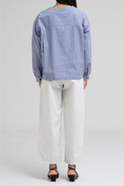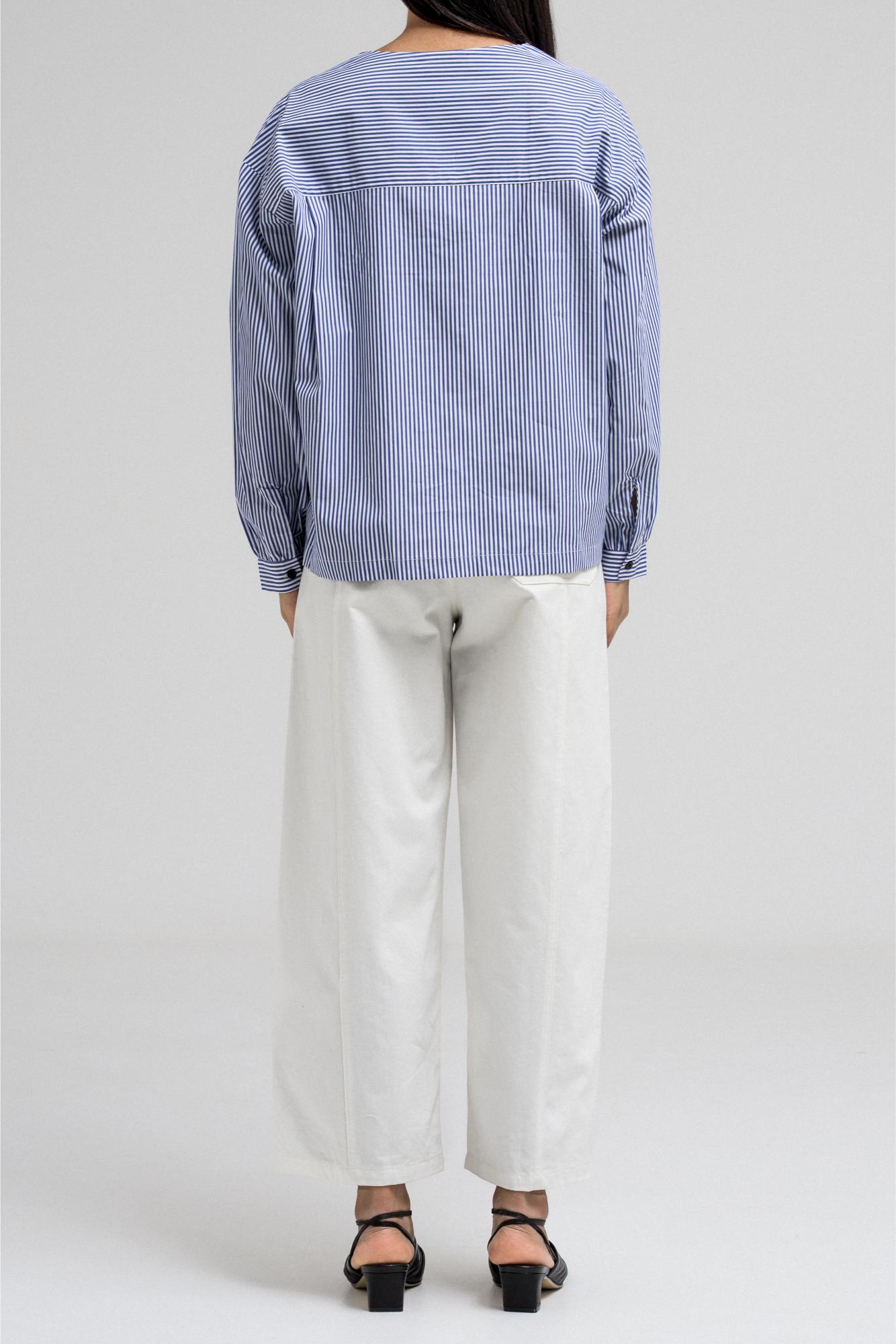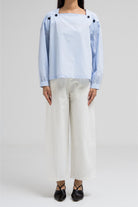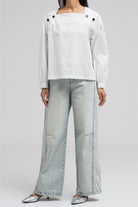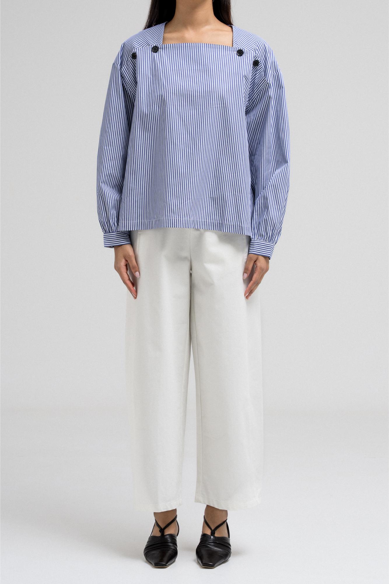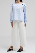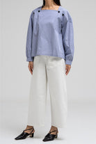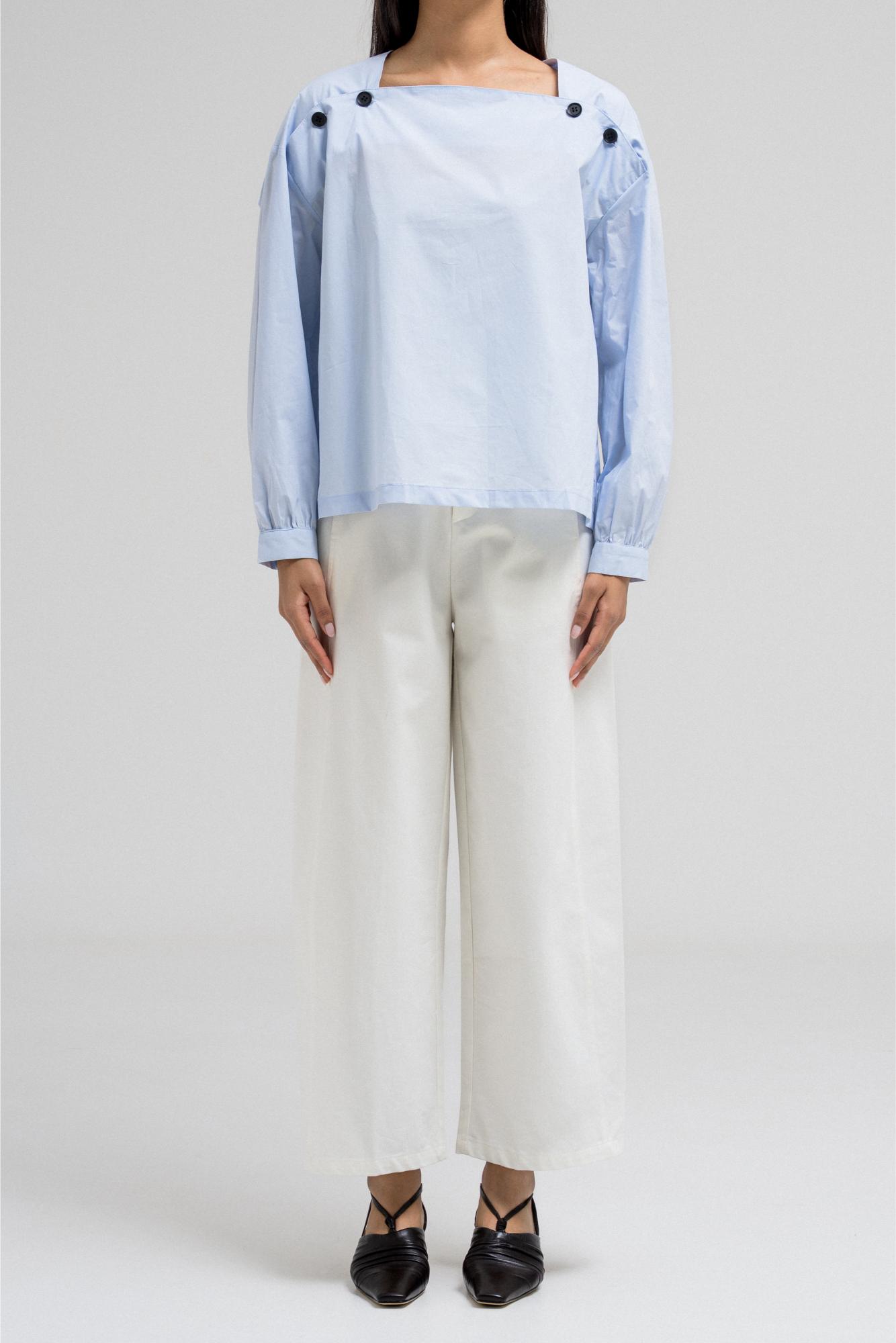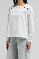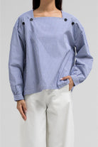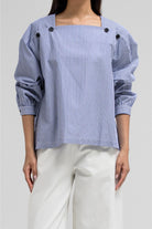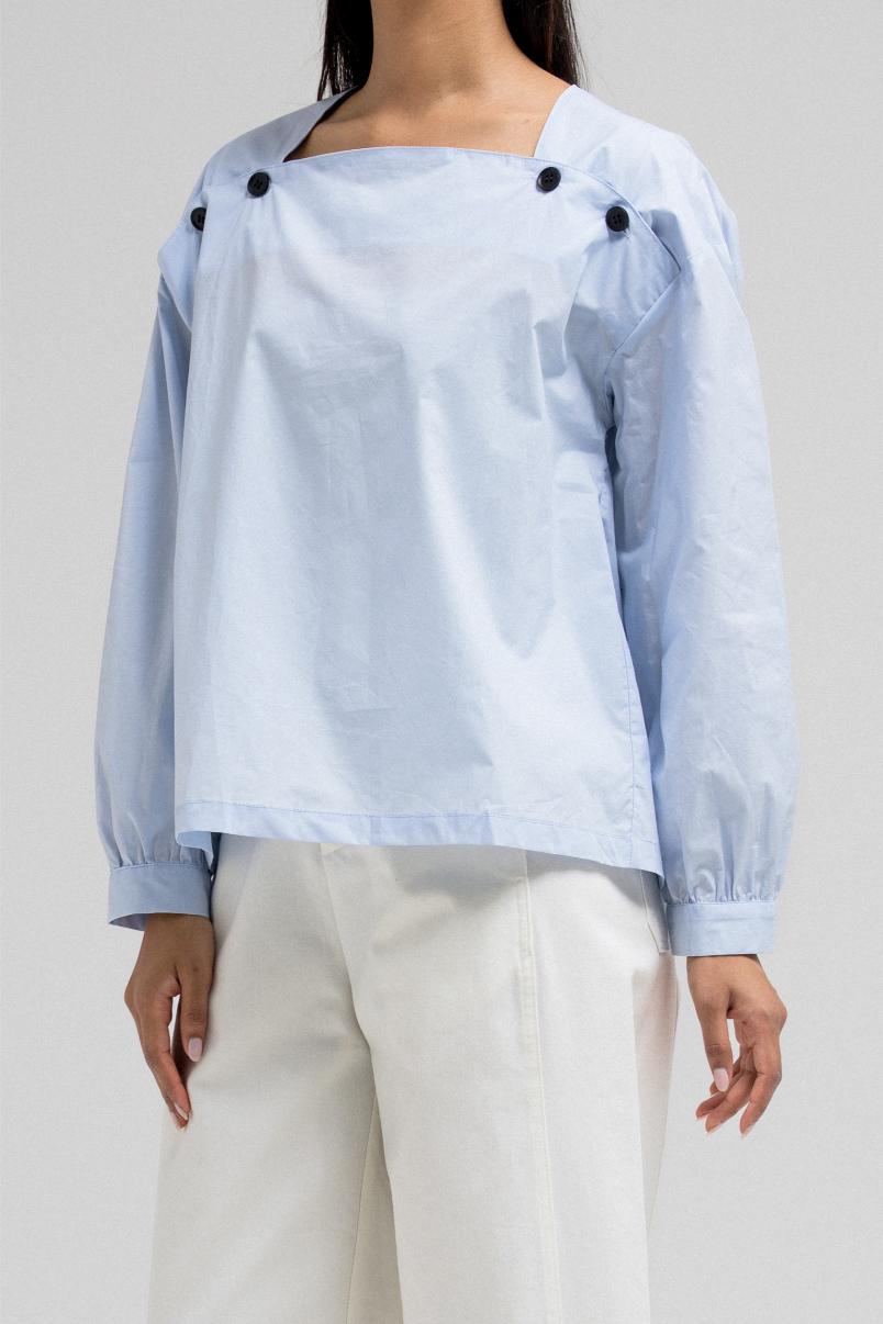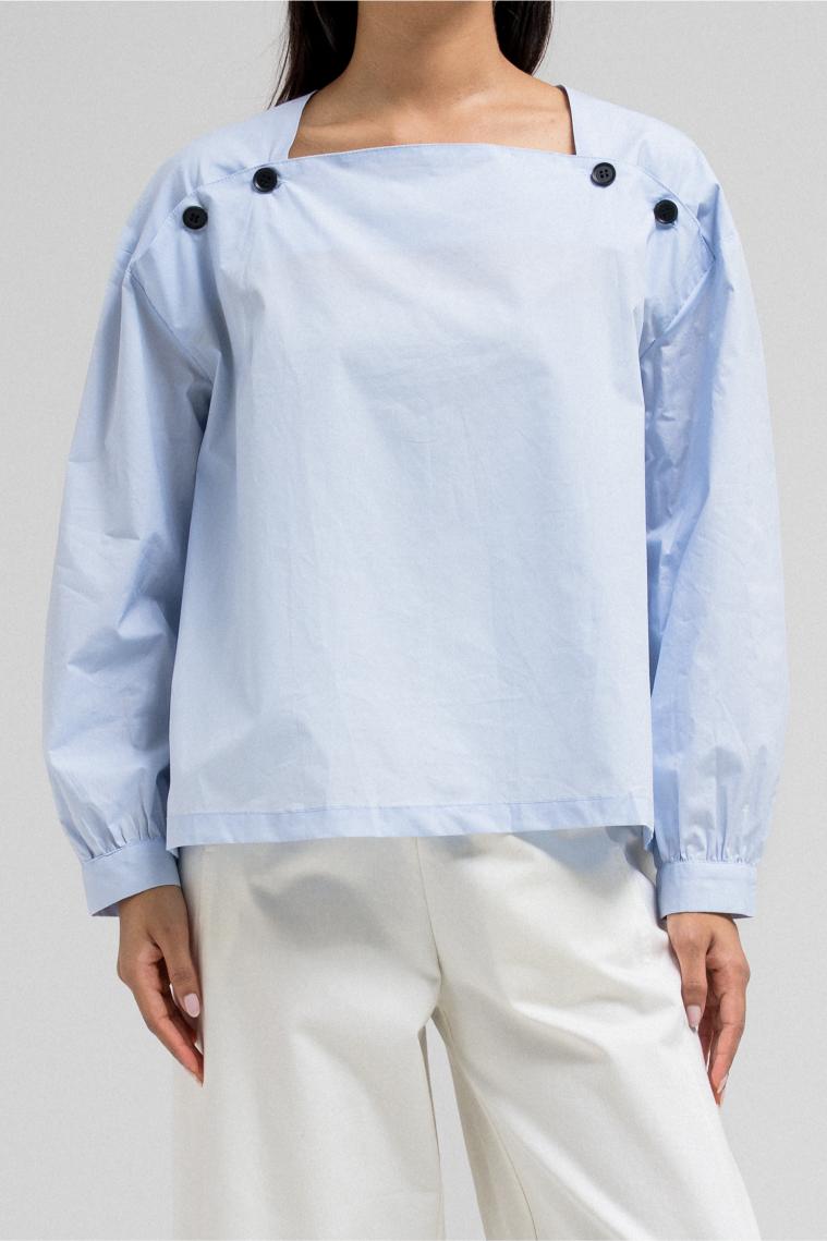 This lightweight blouse features a flattering square neckline adorned with statement buttons on each side, giving it a modern and structured look. The long sleeves and clean silhouette add a polished feel.