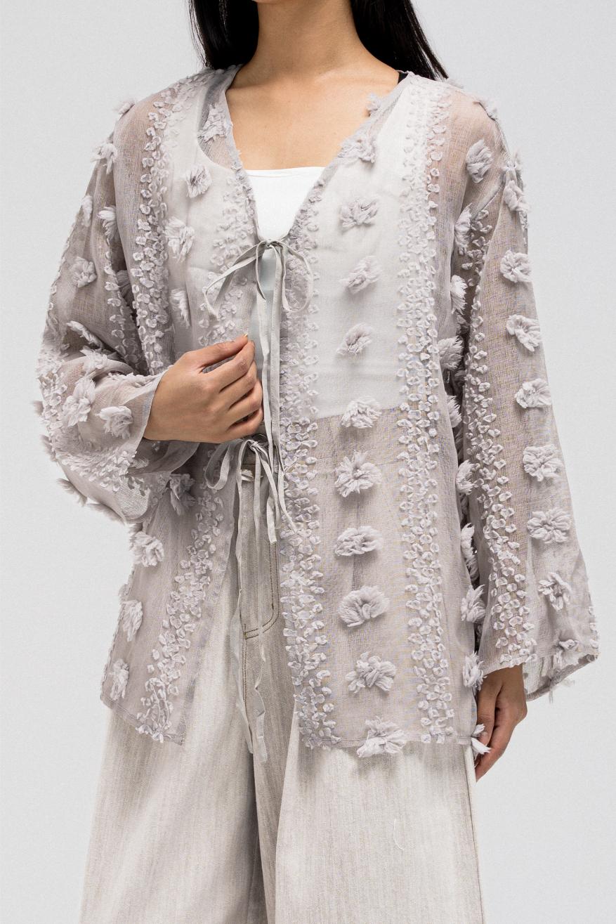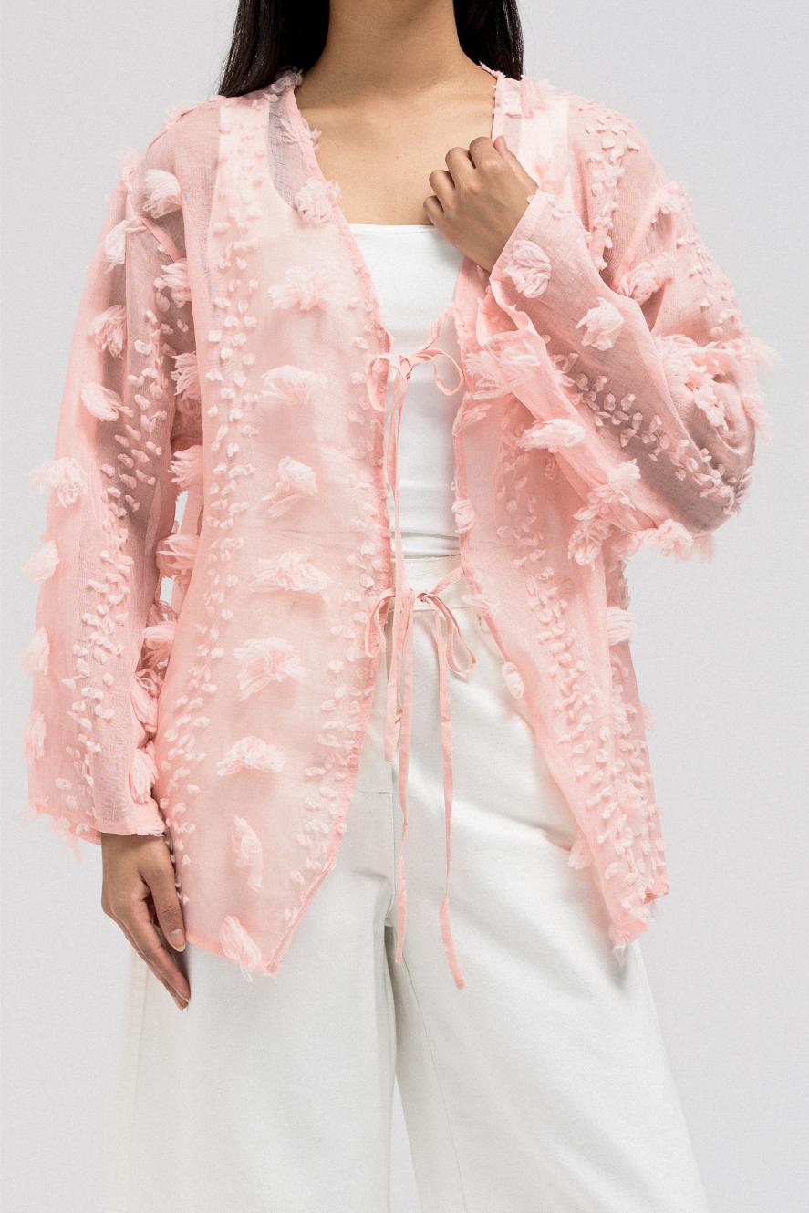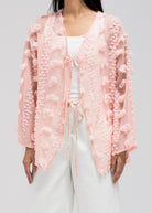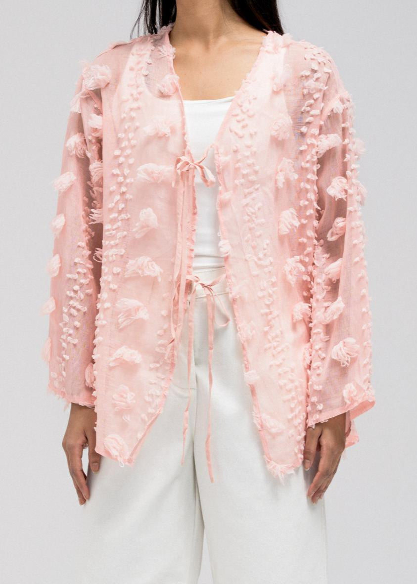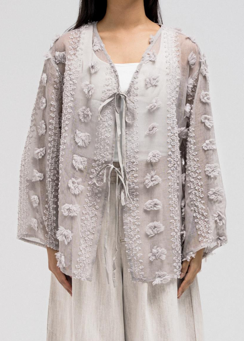 This lightweight, sheer top features delicate 3D embroidered flower-like petals throughout. It has a flowy silhouette with a soft V-neckline collar for an open, airy feel. The front includes two adjustable tie closures that can be styled into bows for a feminine touch.
