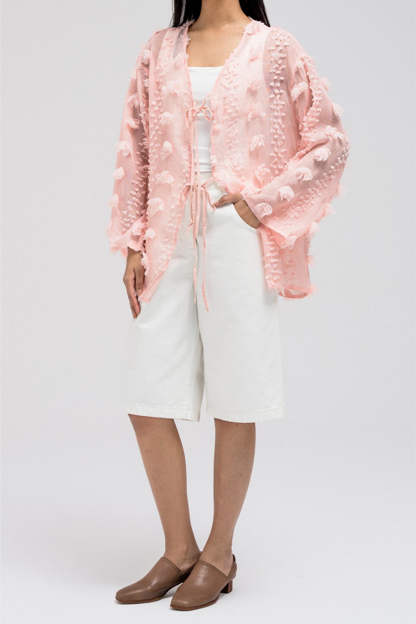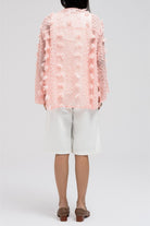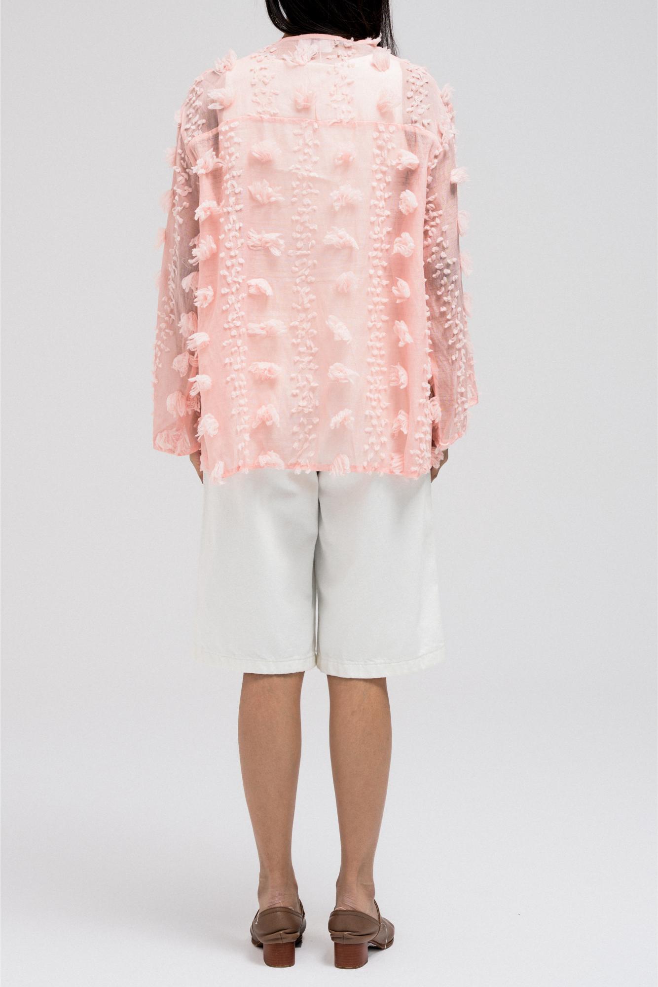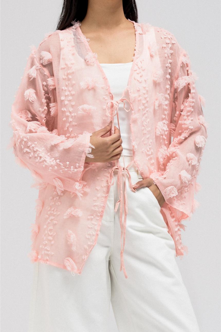 This lightweight, sheer top features delicate 3D embroidered flower-like petals throughout. It has a flowy silhouette with a soft V-neckline collar for an open, airy feel. The front includes two adjustable tie closures that can be styled into bows for a feminine touch.