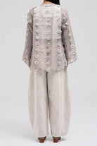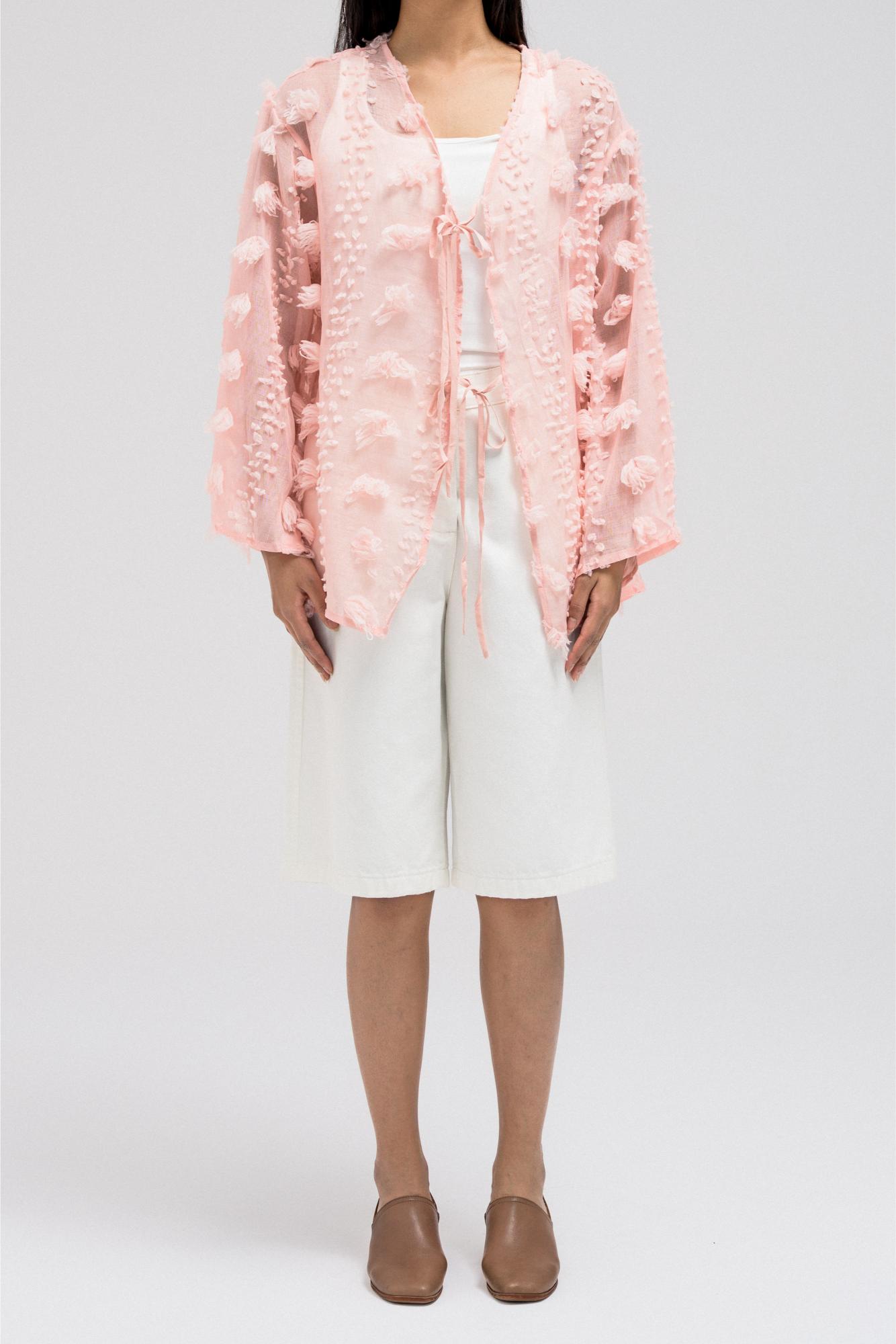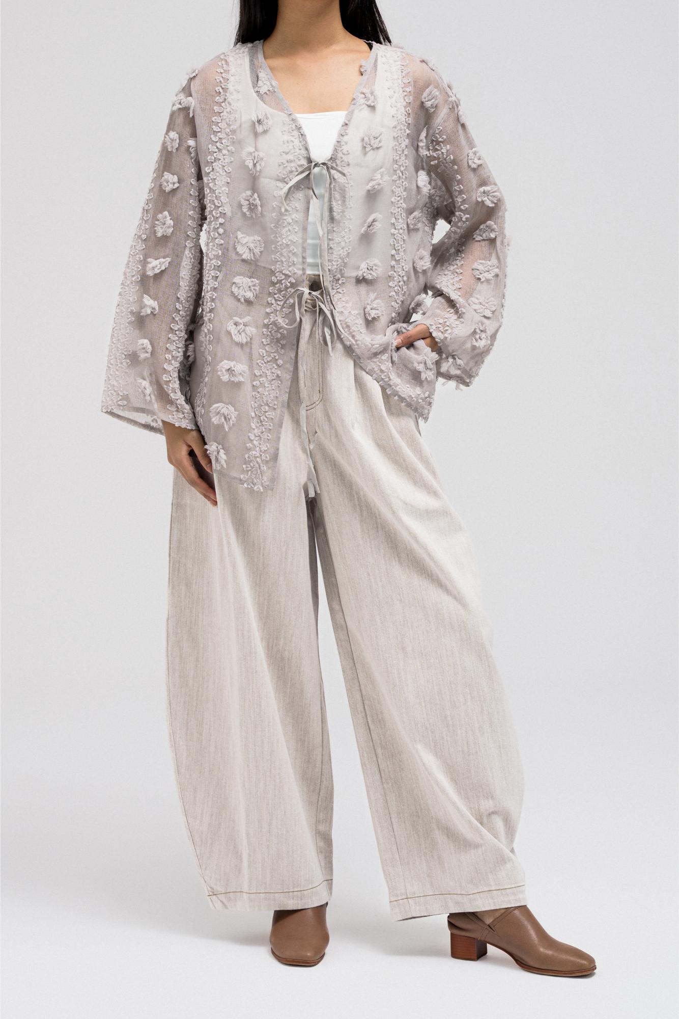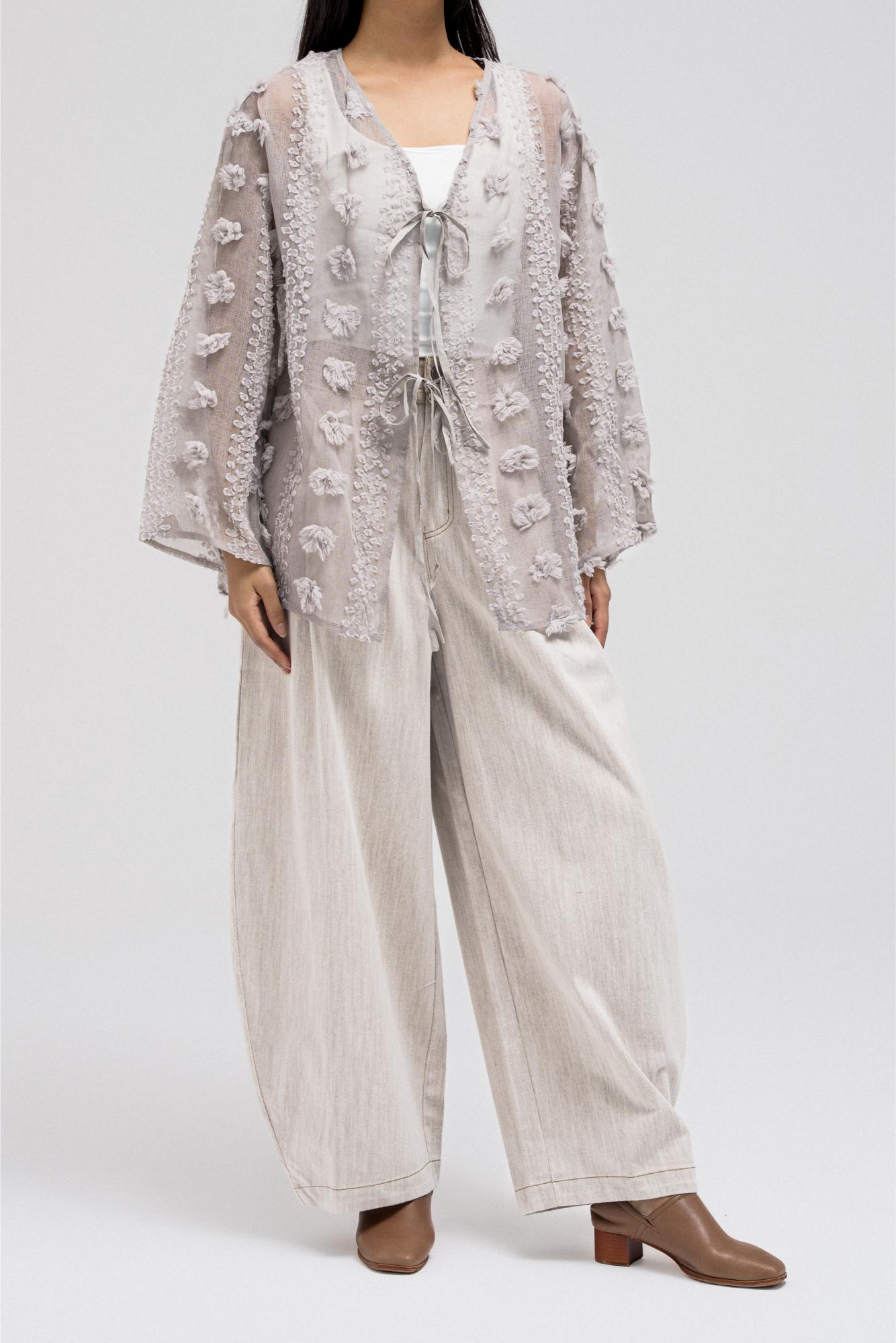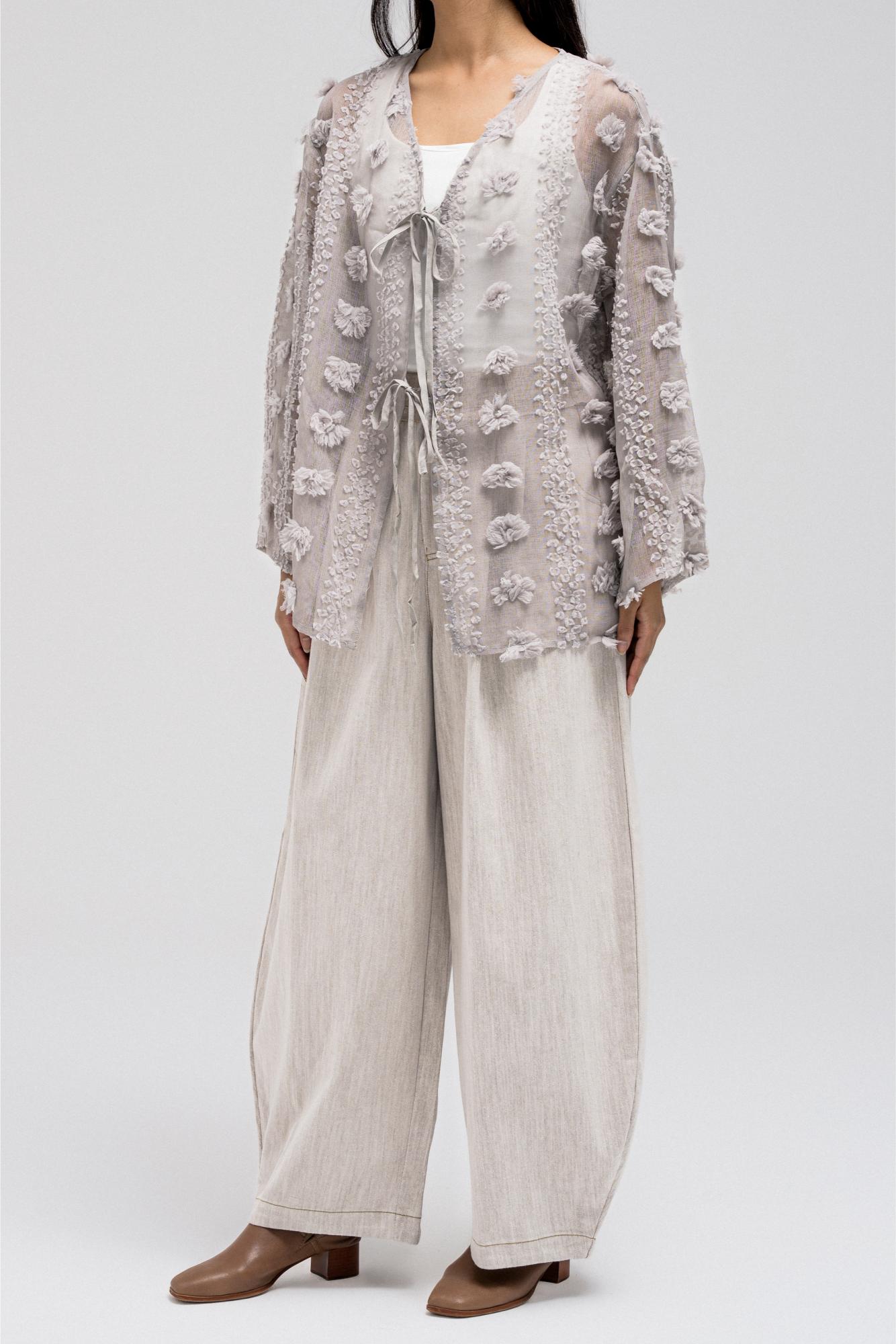 This lightweight, sheer top features delicate 3D embroidered flower-like petals throughout. It has a flowy silhouette with a soft V-neckline collar for an open, airy feel. The front includes two adjustable tie closures that can be styled into bows for a feminine touch.