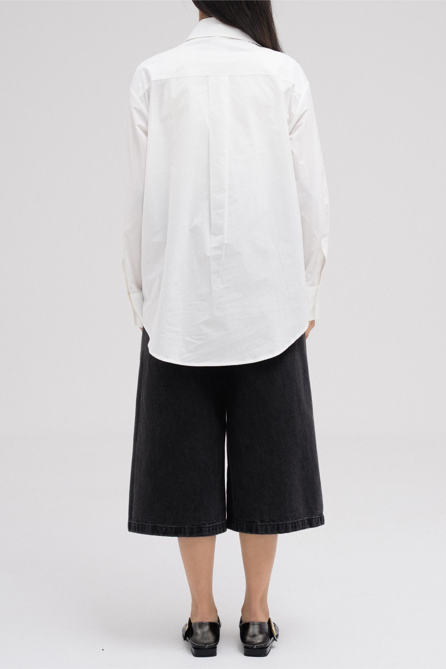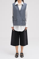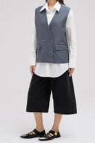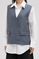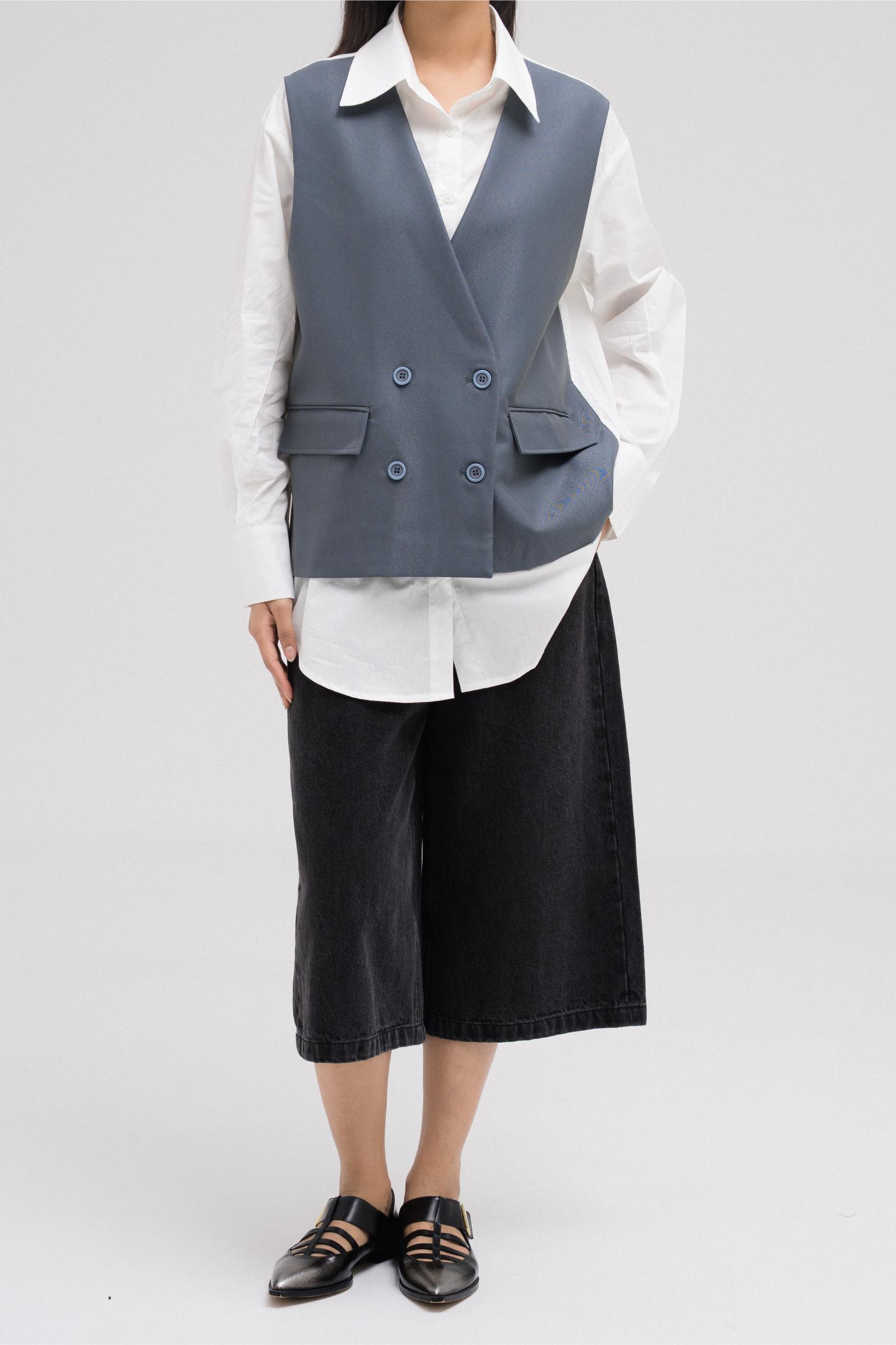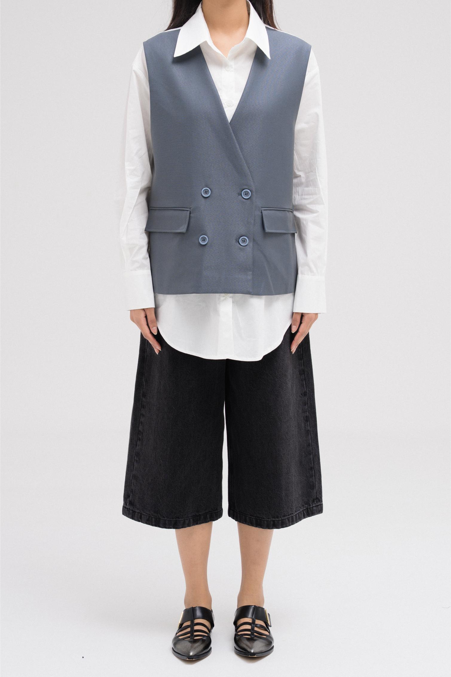 A unique layered top designed to look like a classic vest worn over a shirt. The front features an attached double-breasted vest with flap detailing, seamlessly combined with a white shirt base.