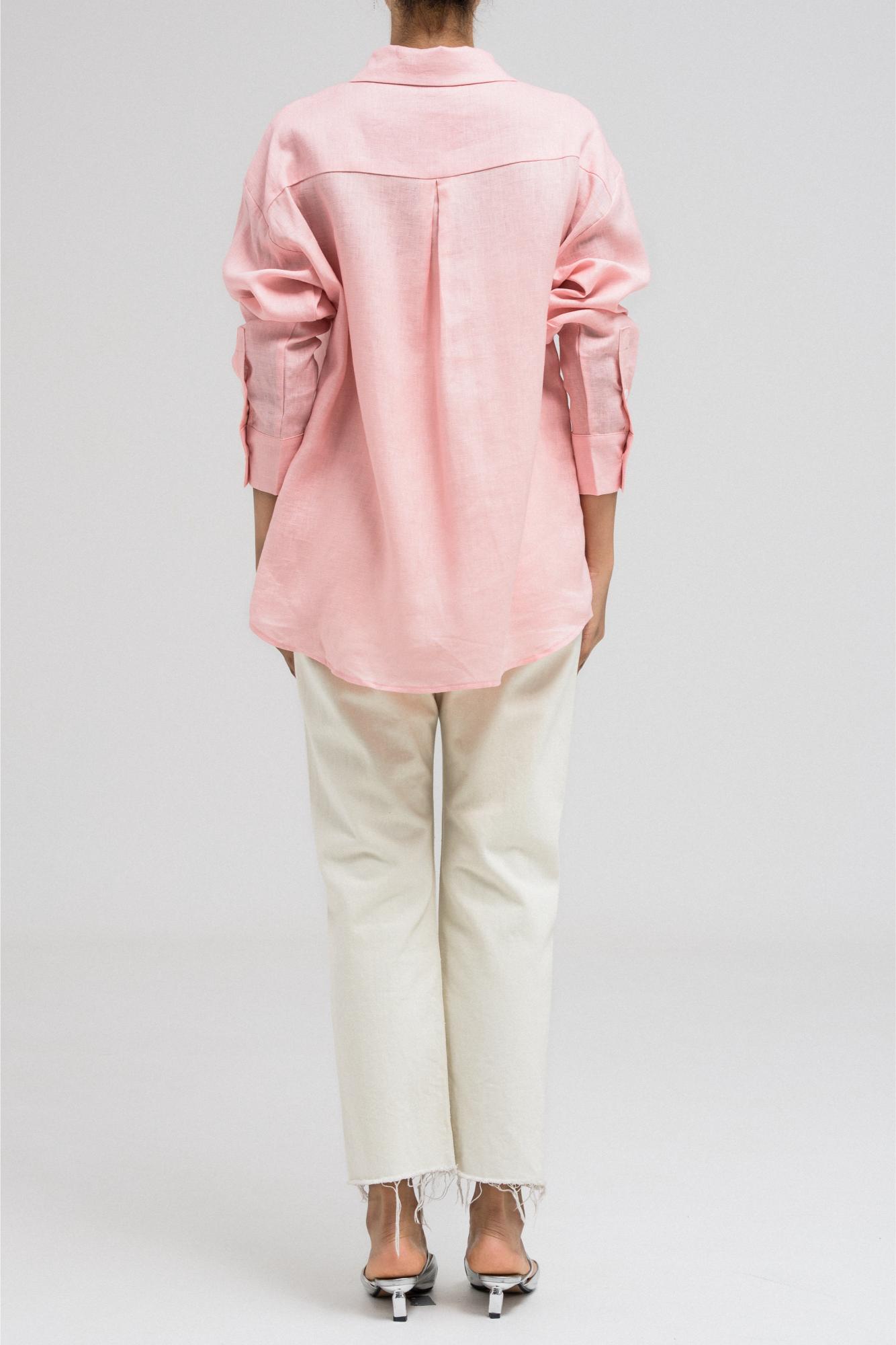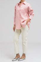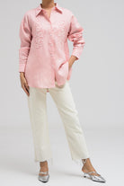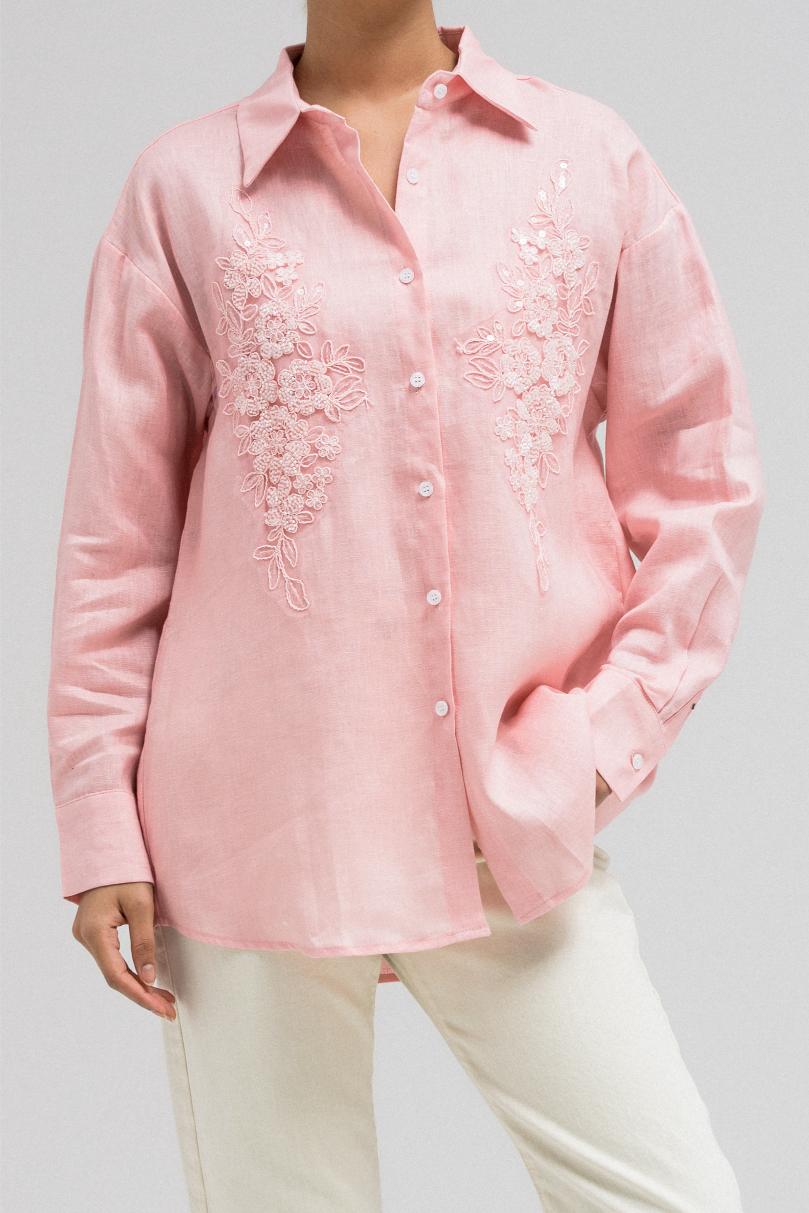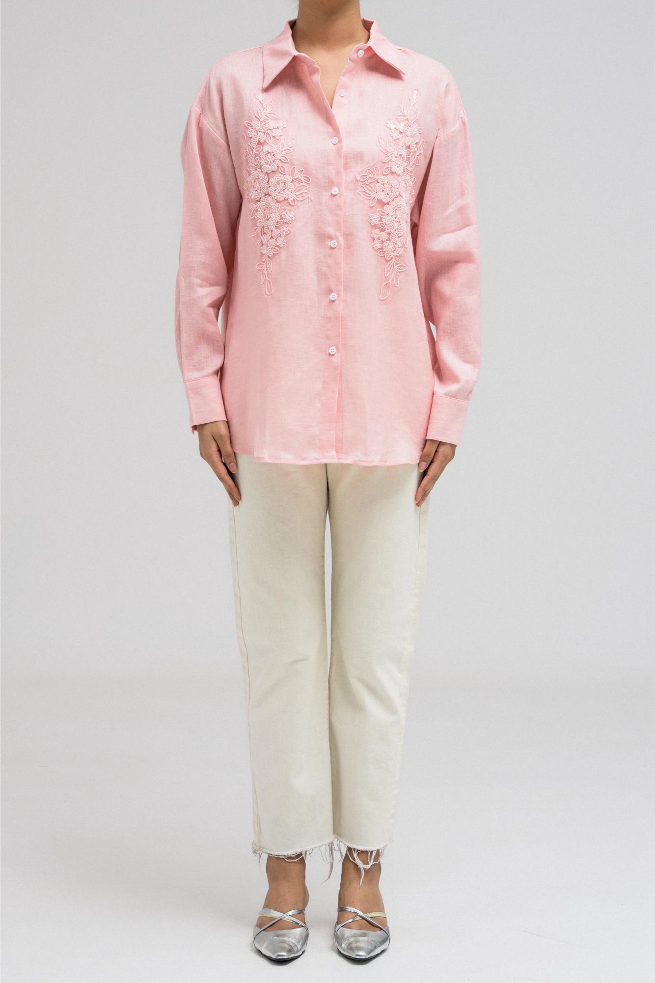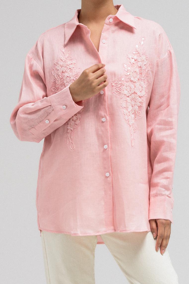 A soft, lightweight linen shirt with a classic collar and front button closure. What makes this piece unique is the delicate floral embroidery on the chest, detailed with tiny bead-like accents that add a subtle touch of sparkle and texture.