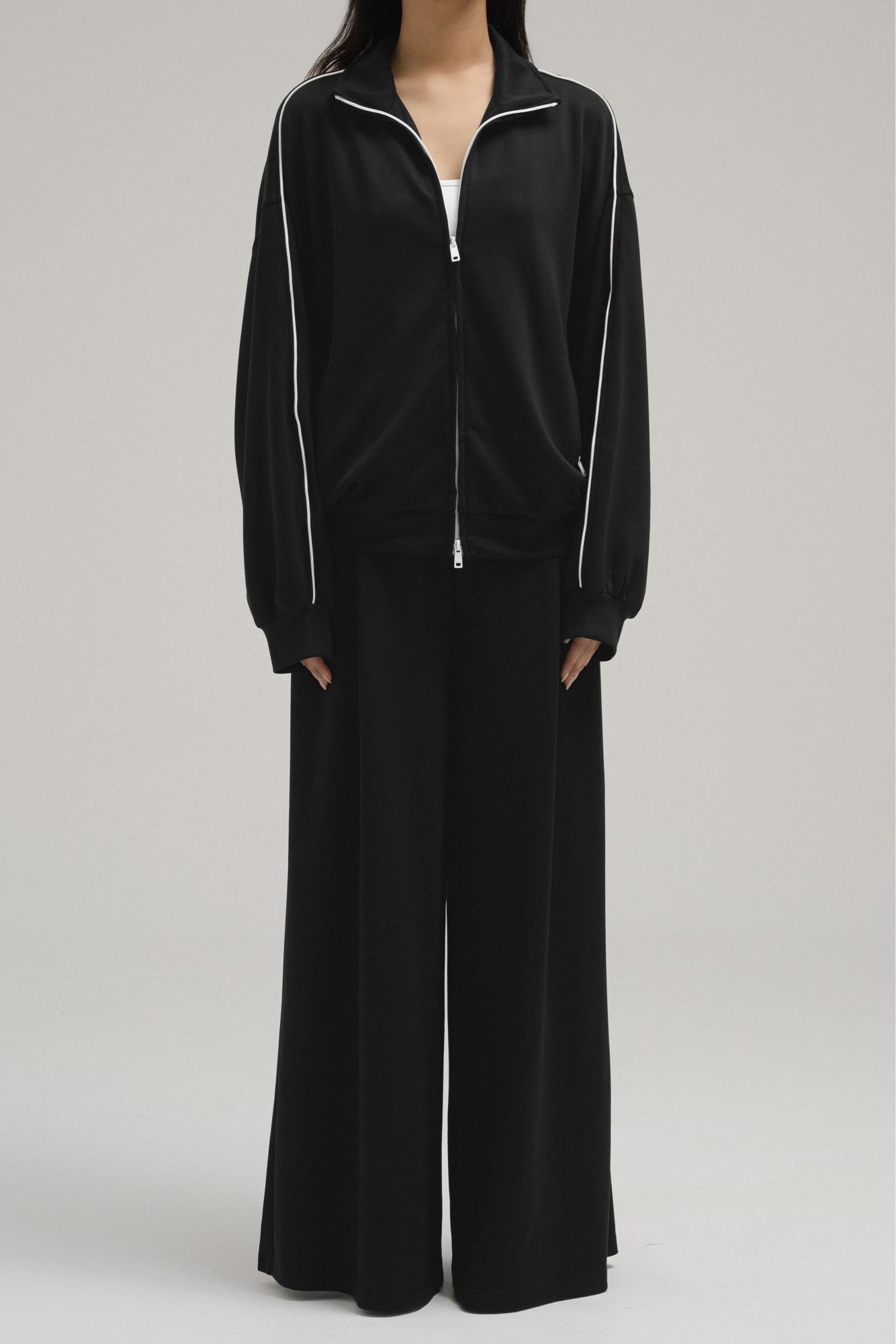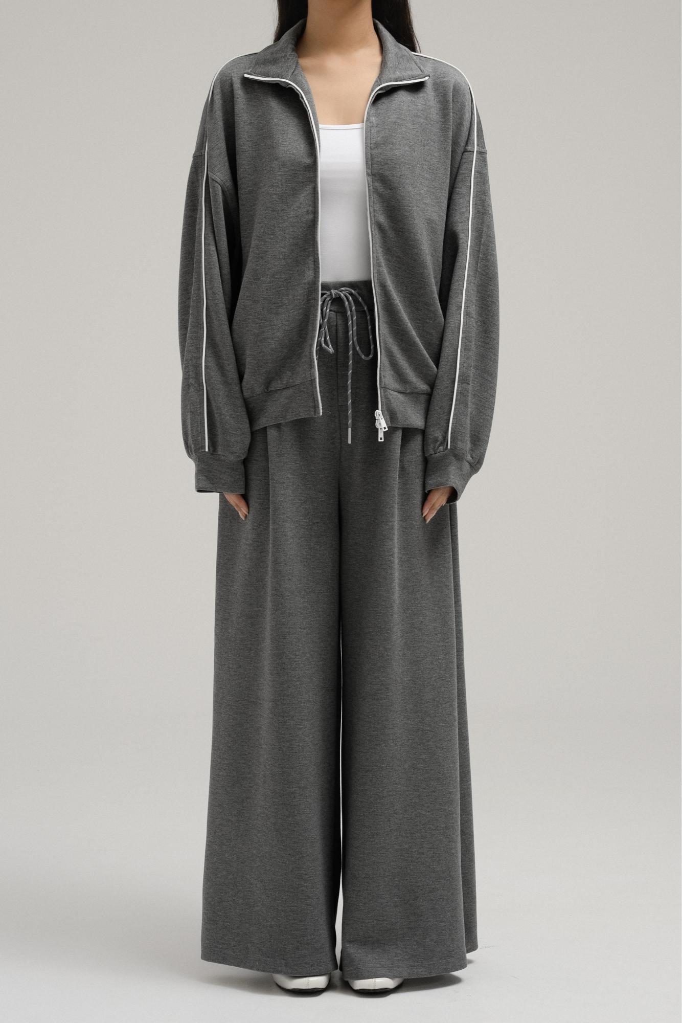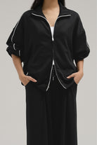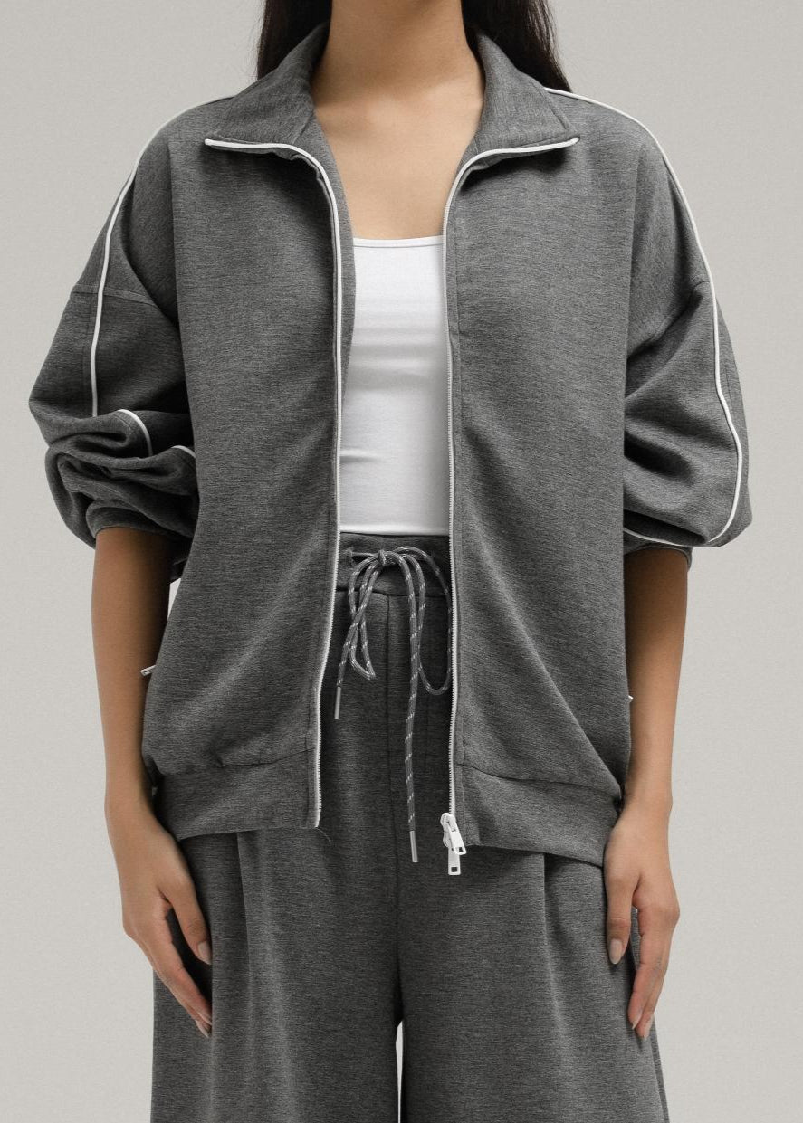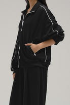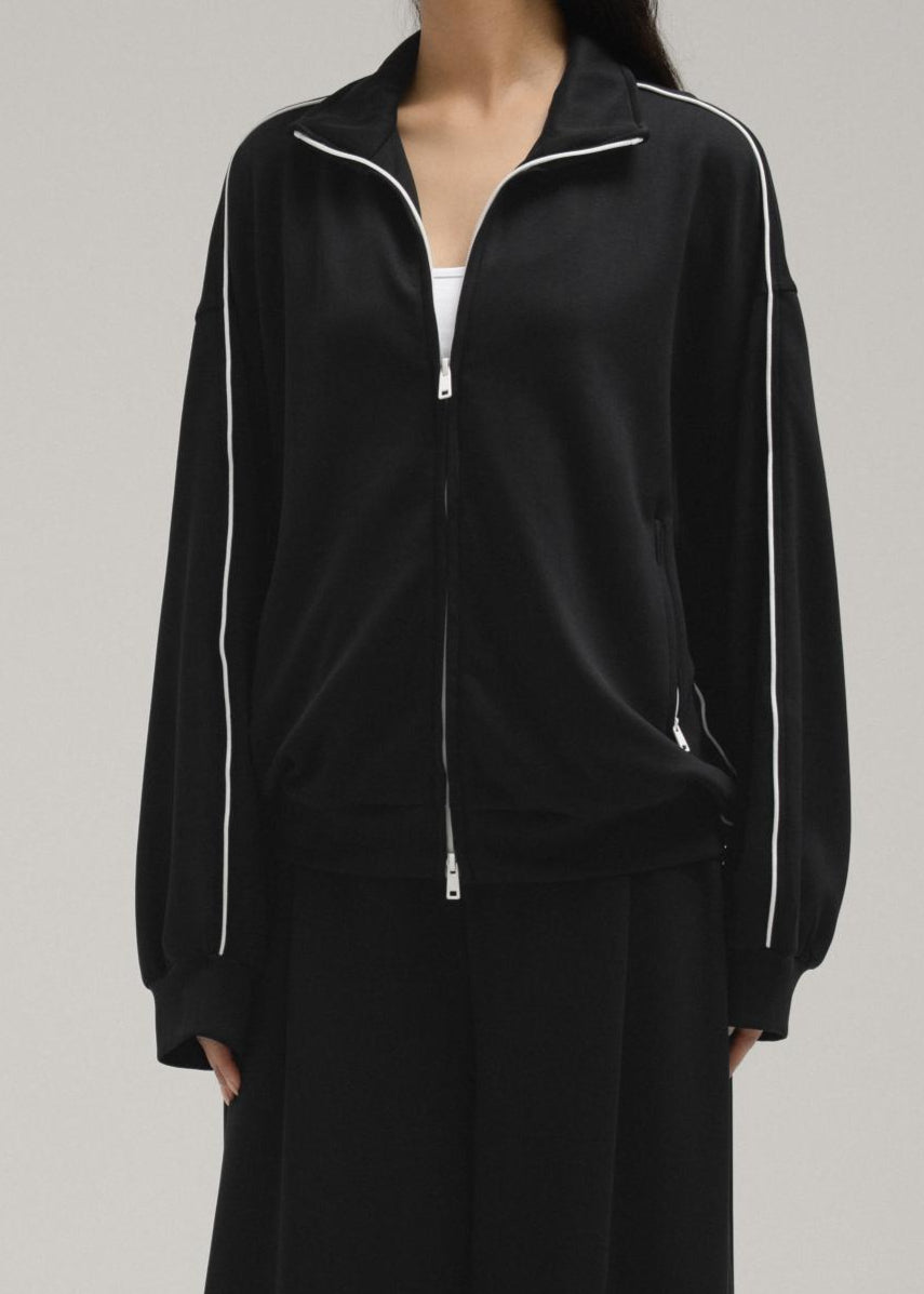 Crafted from a soft, comfortable material, this jacket combines sporty style with everyday ease. It features a front zipper closure, zipped side pockets, and contrasting white line detailing along the sleeves for a sleek finish. Designed with elastic cuffs and hem for a secure fit, it pairs perfectly with its matching pants for a complete coordinated look.
