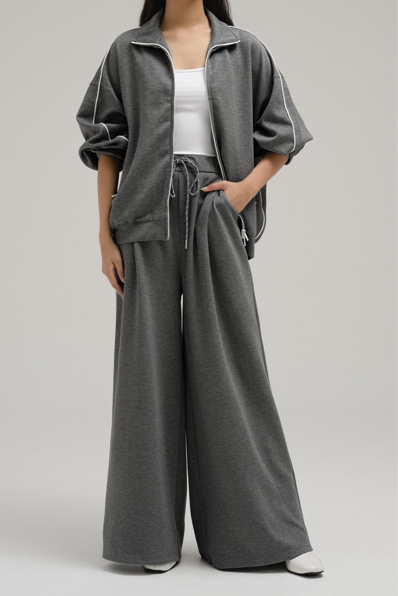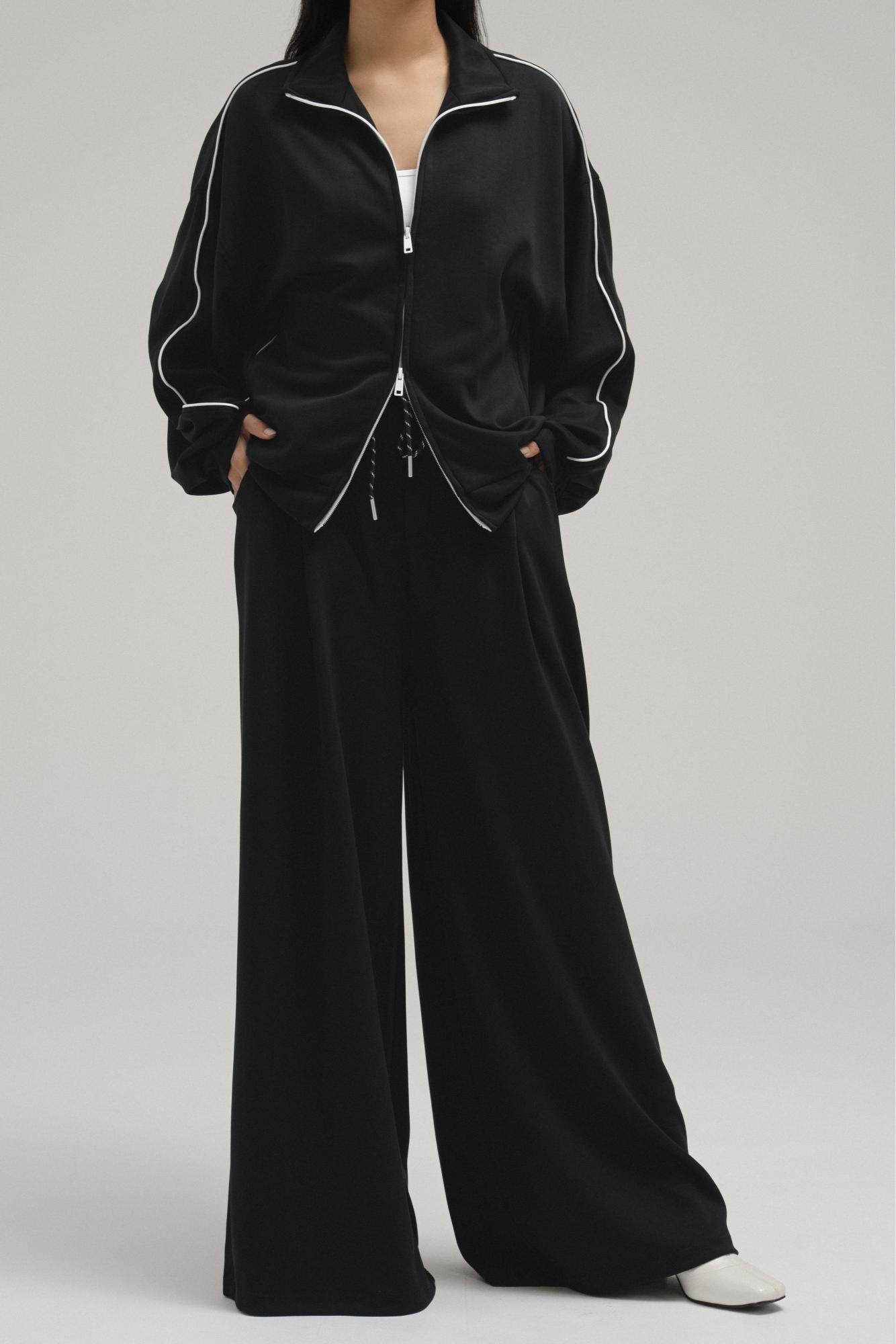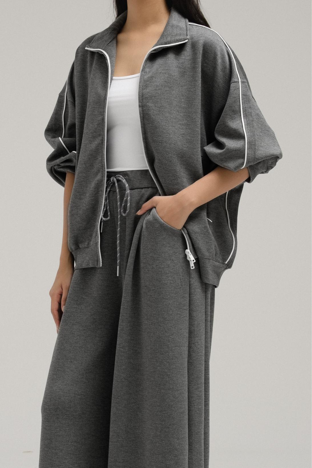 Crafted from a soft, comfortable material, this jacket combines sporty style with everyday ease. It features a front zipper closure, zipped side pockets, and contrasting white line detailing along the sleeves for a sleek finish. Designed with elastic cuffs and hem for a secure fit, it pairs perfectly with its matching pants for a complete coordinated look.