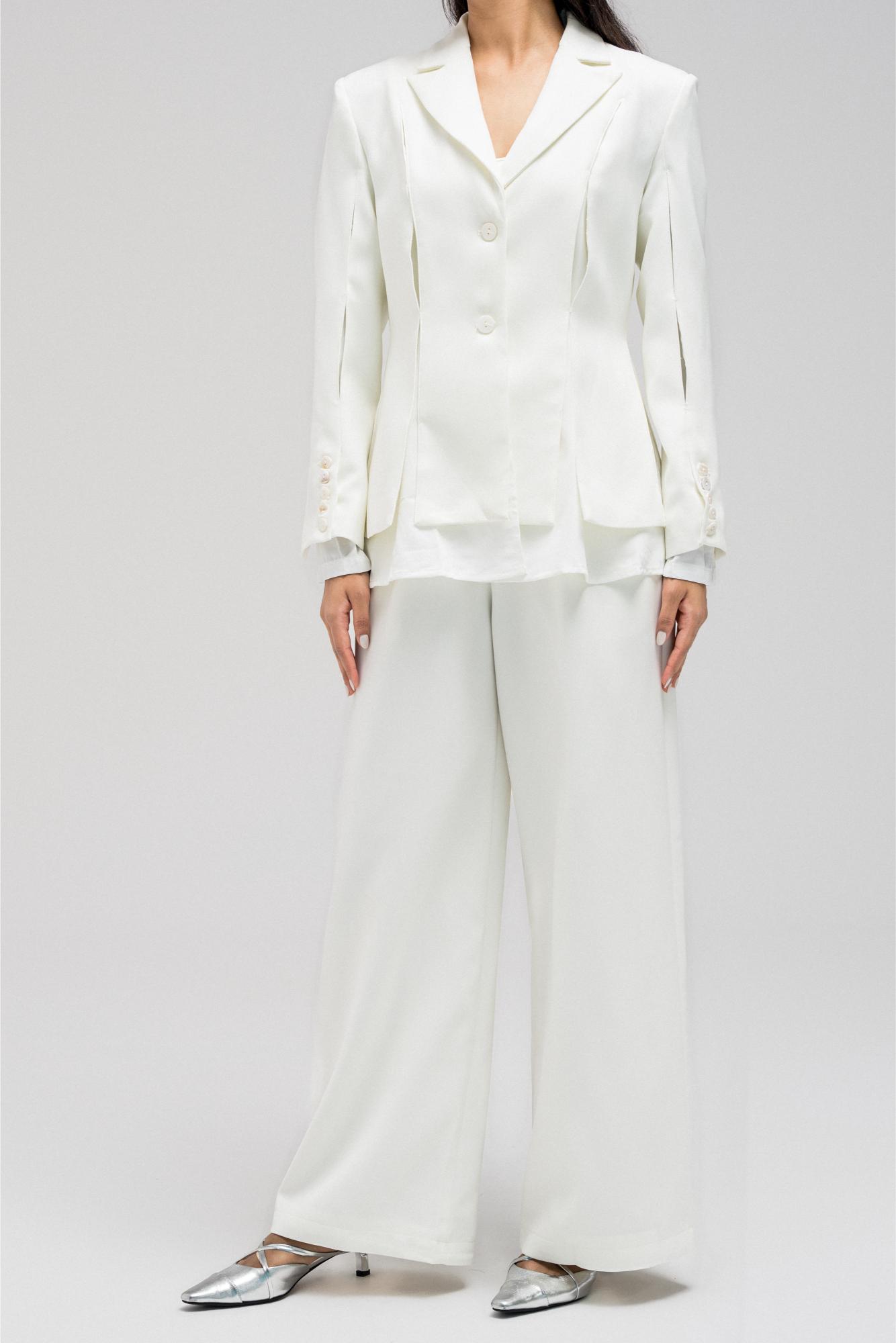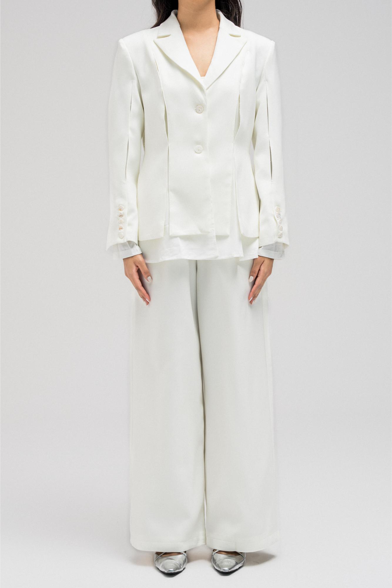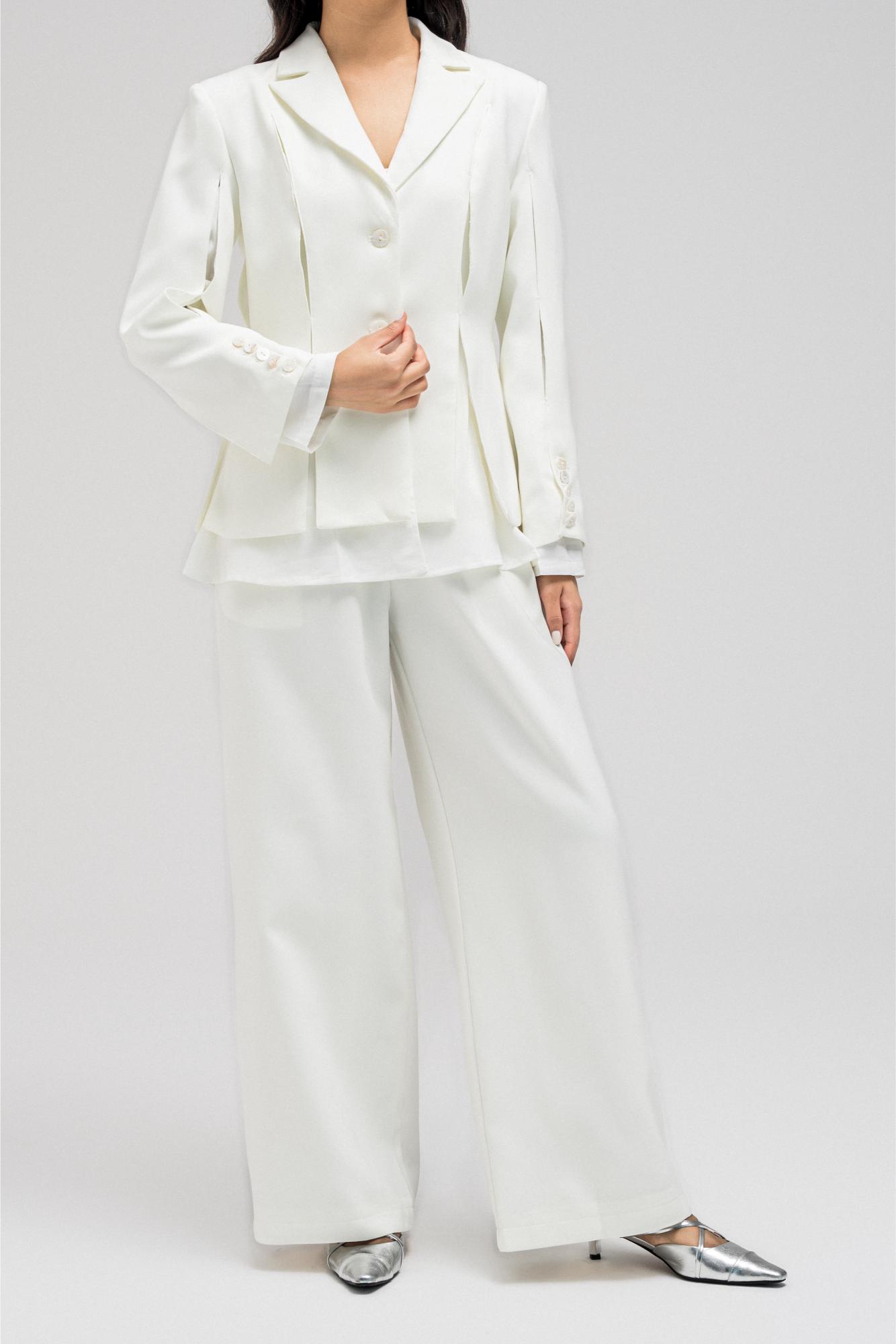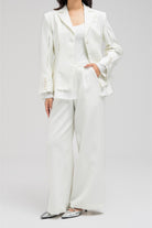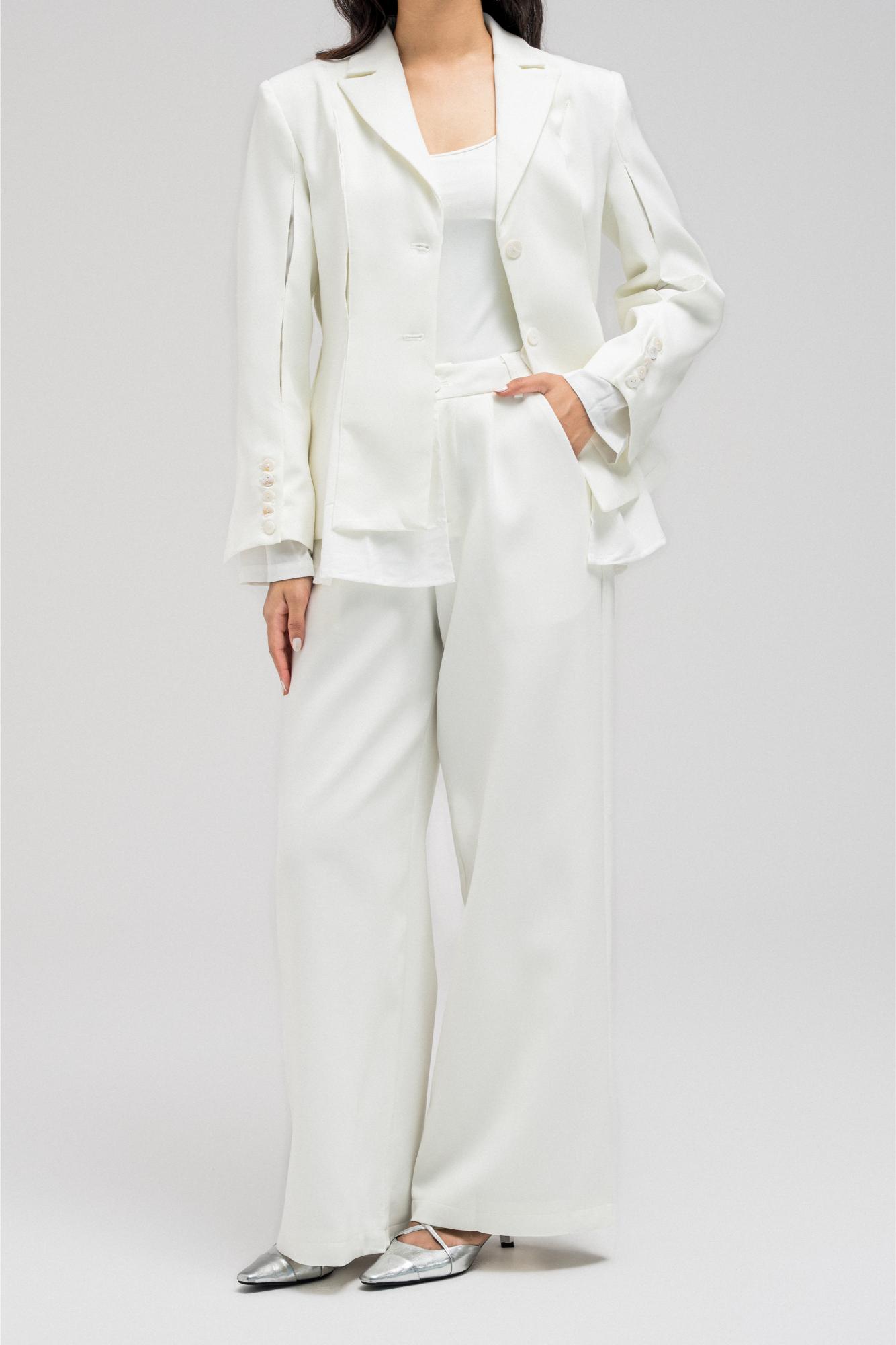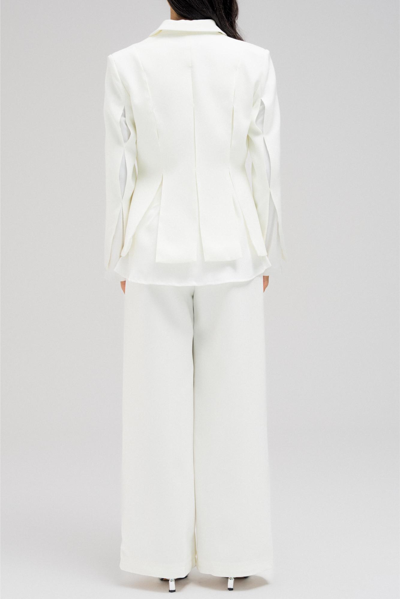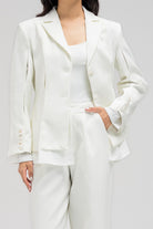 Structured blazer with a cinched waist design, featuring an inner layer of soft, lightweight fabric that gives the appearance of an attached shirt. Detailed with front button closure and subtle side openings/cuts for a modern touch.