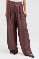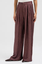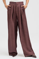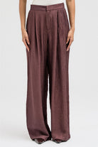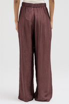 Lightweight and softly textured, these pants feature a relaxed wide-leg silhouette that flows effortlessly with movement. Designed with a partially elastic waistband at the back for comfort and a sleek front with a metal clasp and zipper closure for a polished finish. Perfect to pair with the matching shirt for a coordinated, elegant set look.