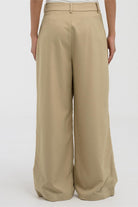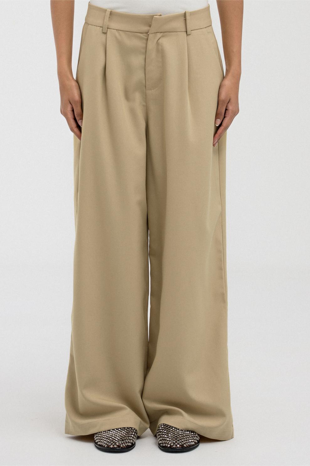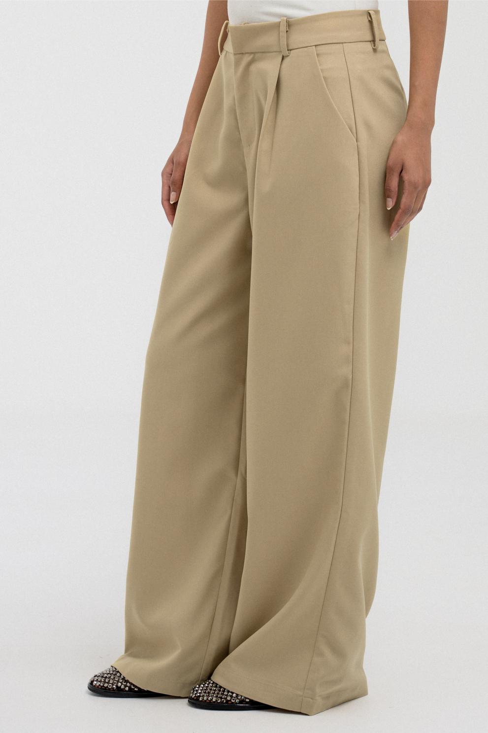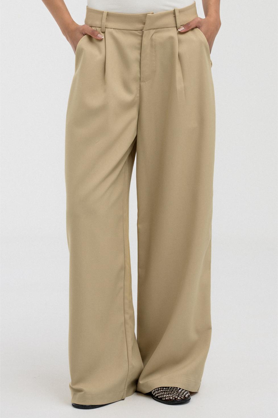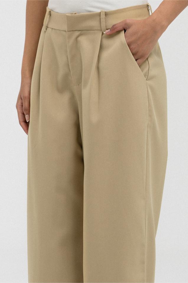 Tailored straight-leg pants. Front zipper and a hidden front button closure.