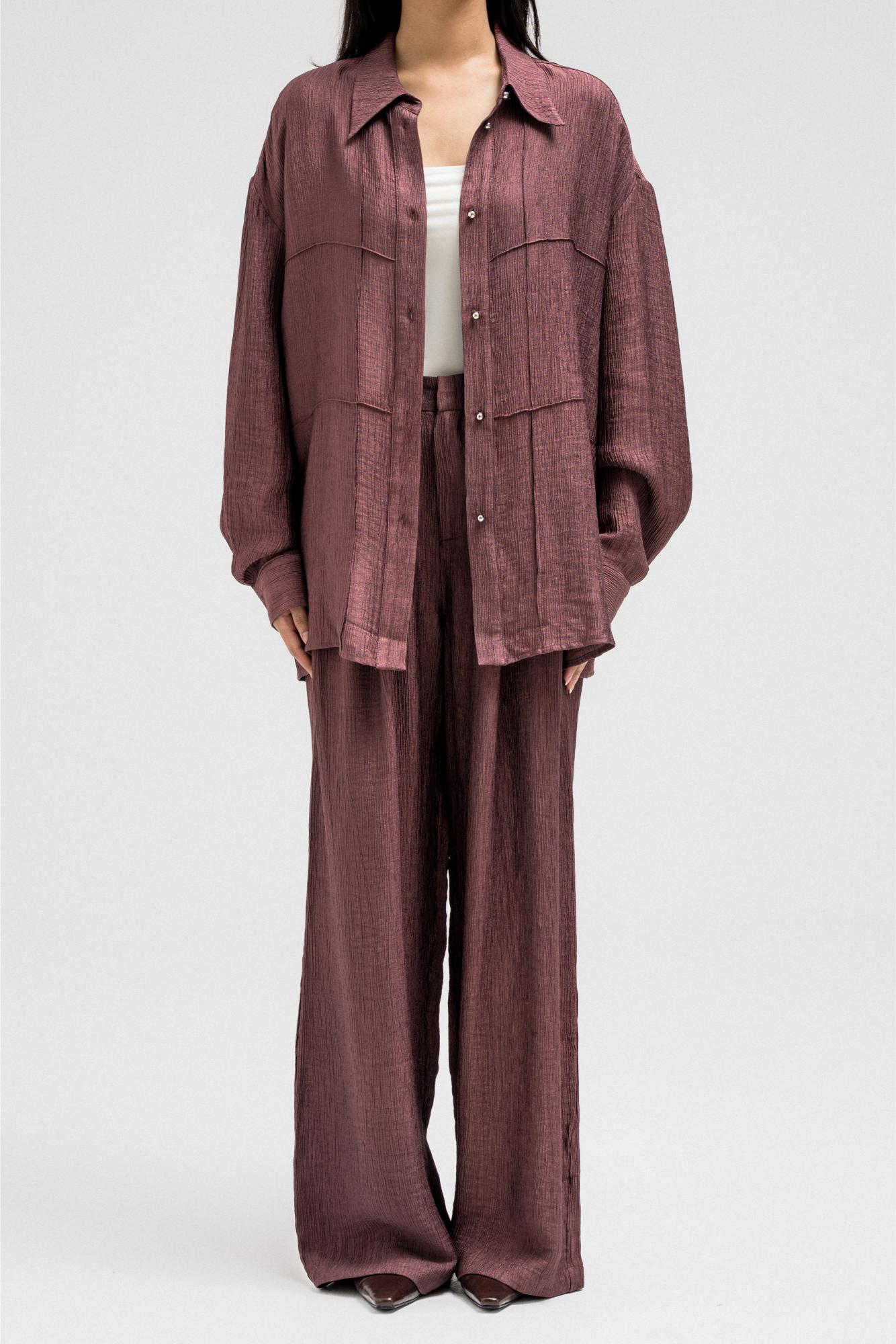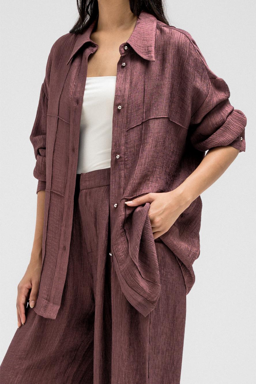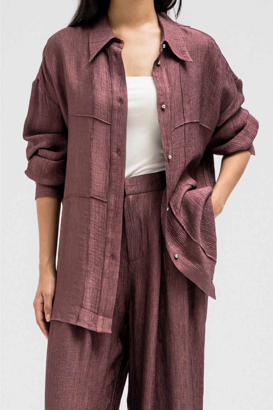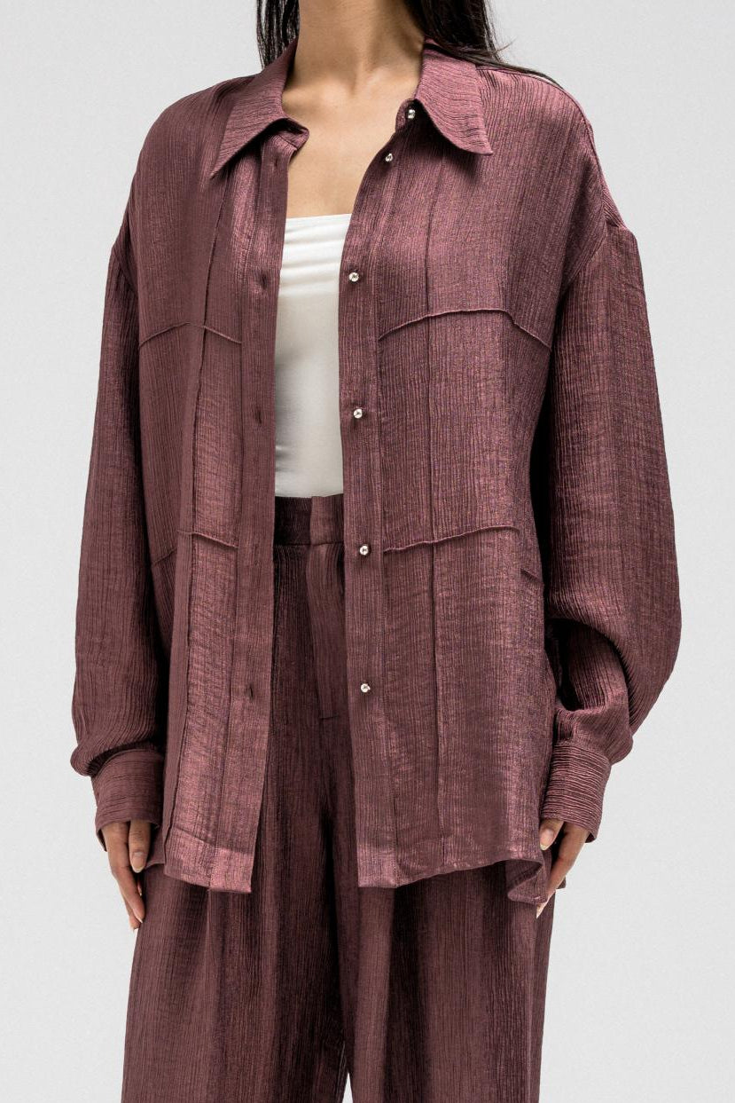 A lightweight, relaxed-fit shirt featuring a subtle textured finish that adds depth to the look. Designed with front pockets, long sleeves, and a classic collar, it fastens with a front button closure for effortless styling. Perfectly pairs with the matching pants for a coordinated, modern set look that balances comfort and sophistication.