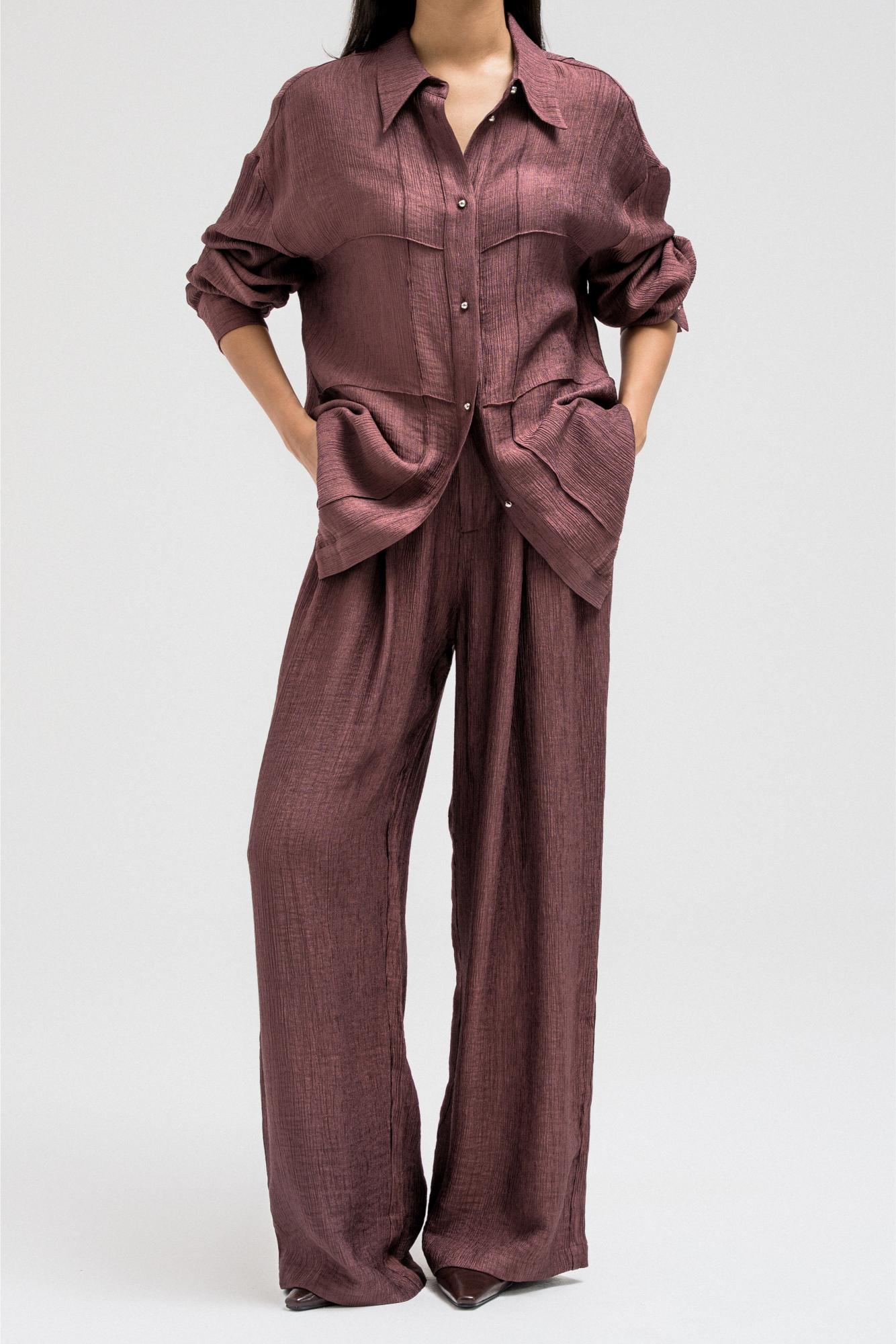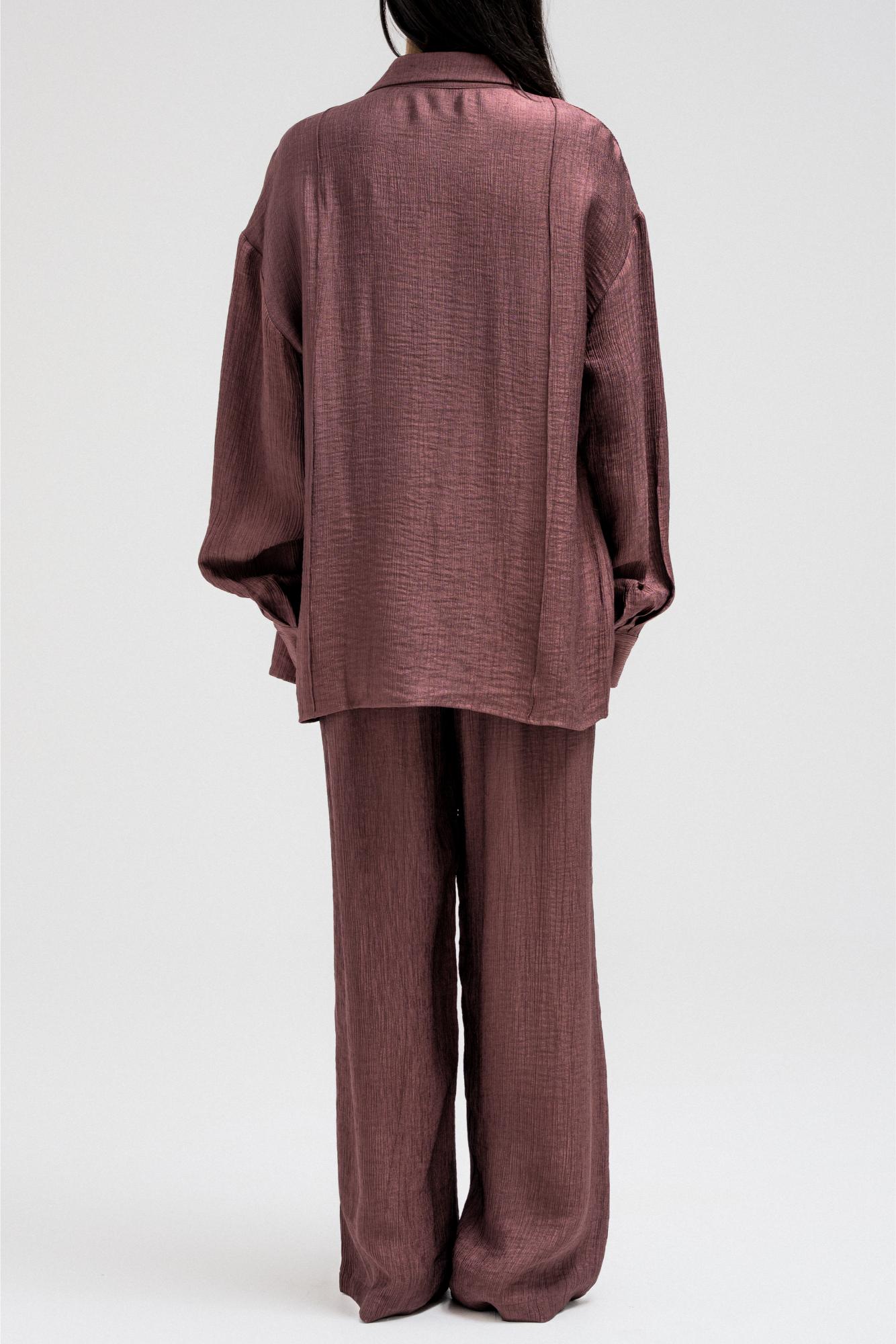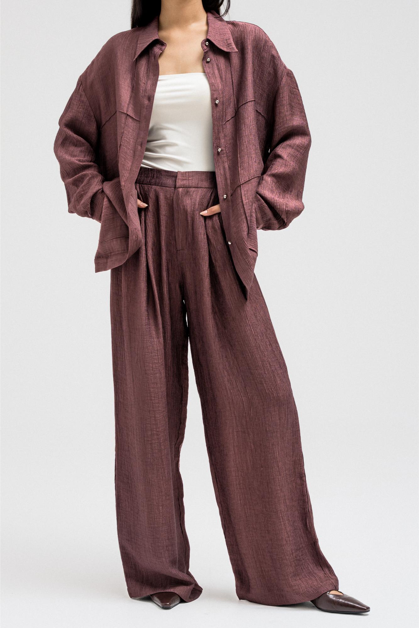 A lightweight, relaxed-fit shirt featuring a subtle textured finish that adds depth to the look. Designed with front pockets, long sleeves, and a classic collar, it fastens with a front button closure for effortless styling. Perfectly pairs with the matching pants for a coordinated, modern set look that balances comfort and sophistication.
