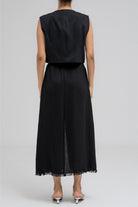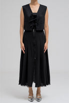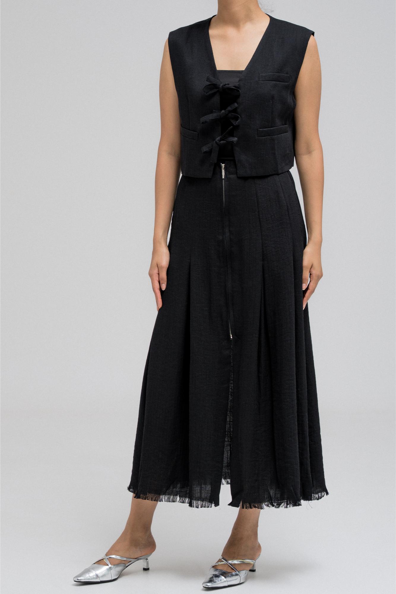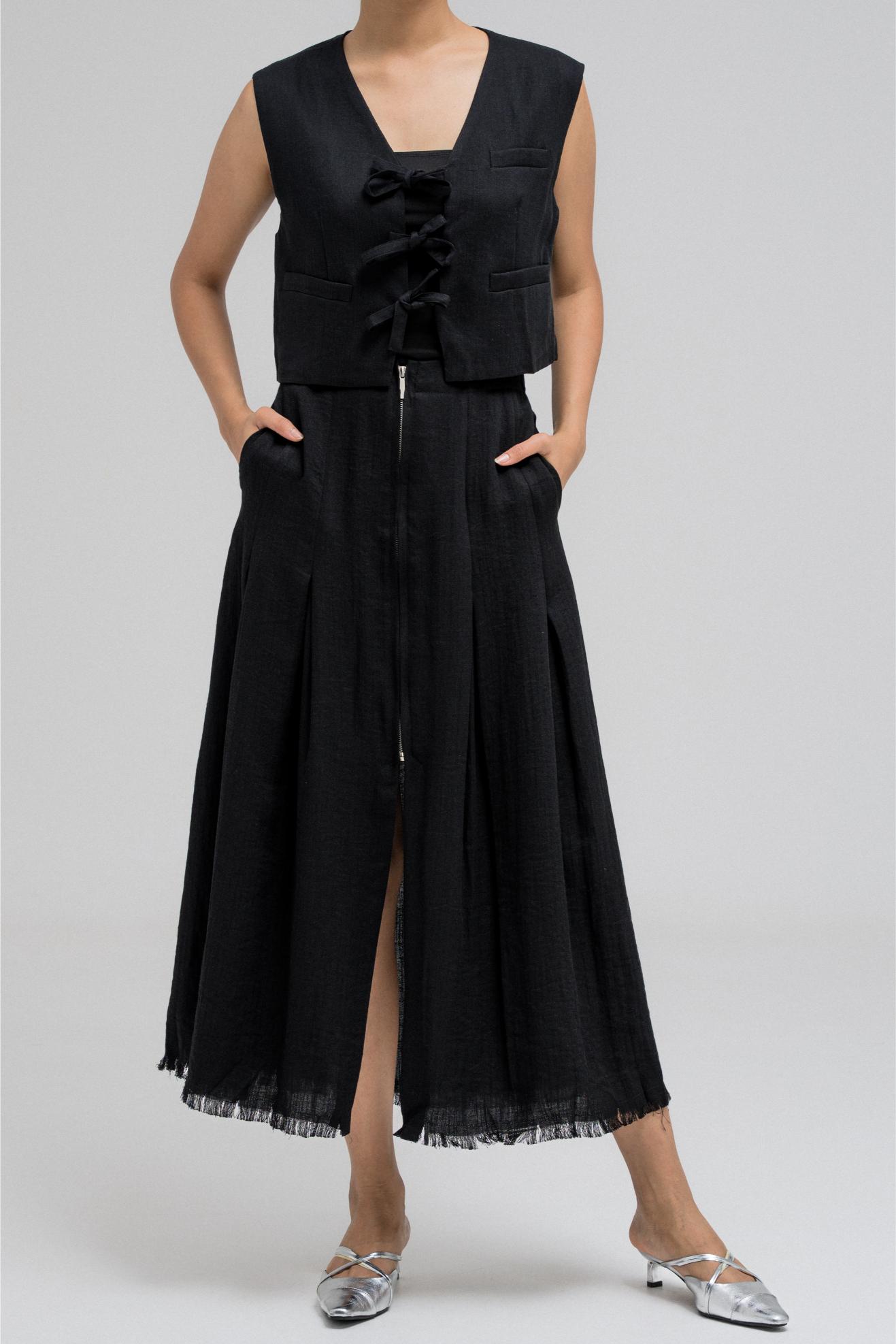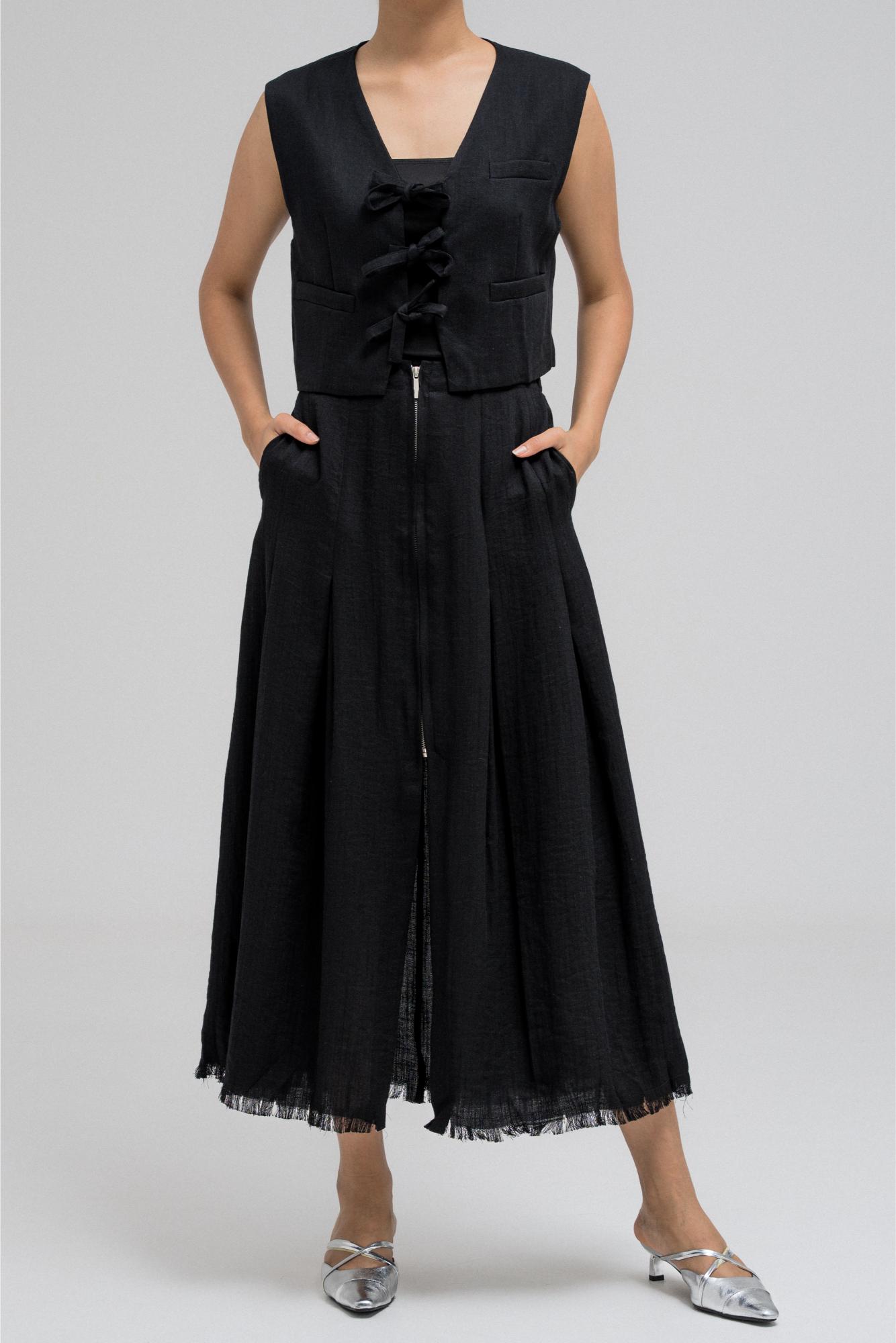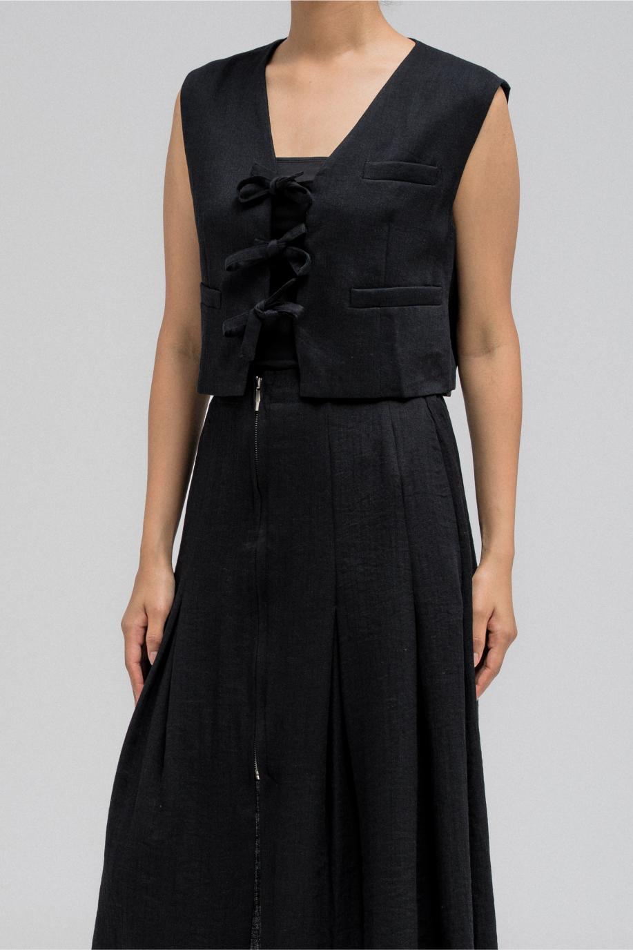 This cropped top features three front tie strings that can be styled into bows for a playful yet structured look. With a sleeveless cut and clean tailoring, it's ideal for layering and pairs perfectly with its matching skirt for a chic, coordinated outfit.